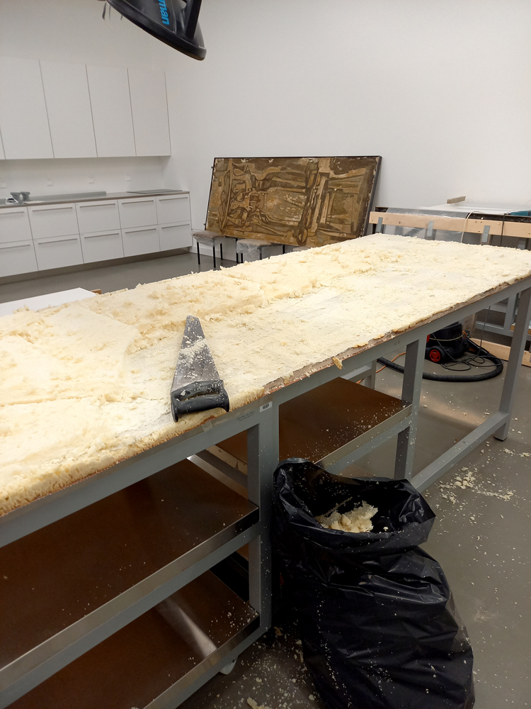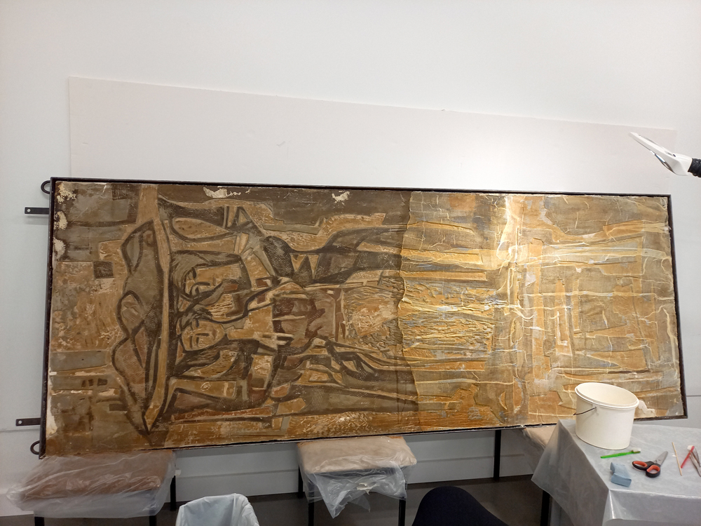 For years, the mural panels were stored along the wall of a corridor in ERM’s wood storage facility until the curator of the Kellele kuulub öö (Who Owns the Night?) exhibition expressed the wish to display the central panel. At the curator’s request – and with the encouragement and guidance of Hilkka Hiiop, who led the disassembly process – the so-called ‘unpacking’ of the central panel began. It became clear during this process that the mural’s condition was poor: the sgraffito plaster layer had largely detached from the underlying wall plaster and required thorough stabilisation. The same was assumed for the other panels.