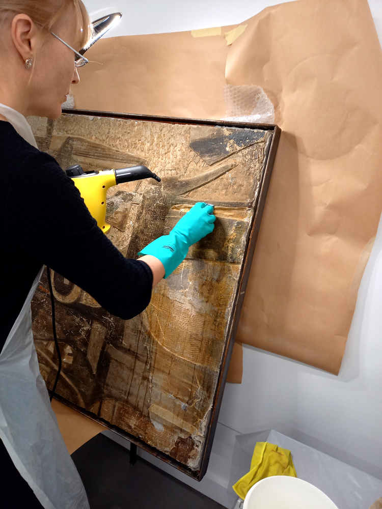 - the fabric and glue layers were removed from the mural’s surface using hot water and a steam sprayer.
