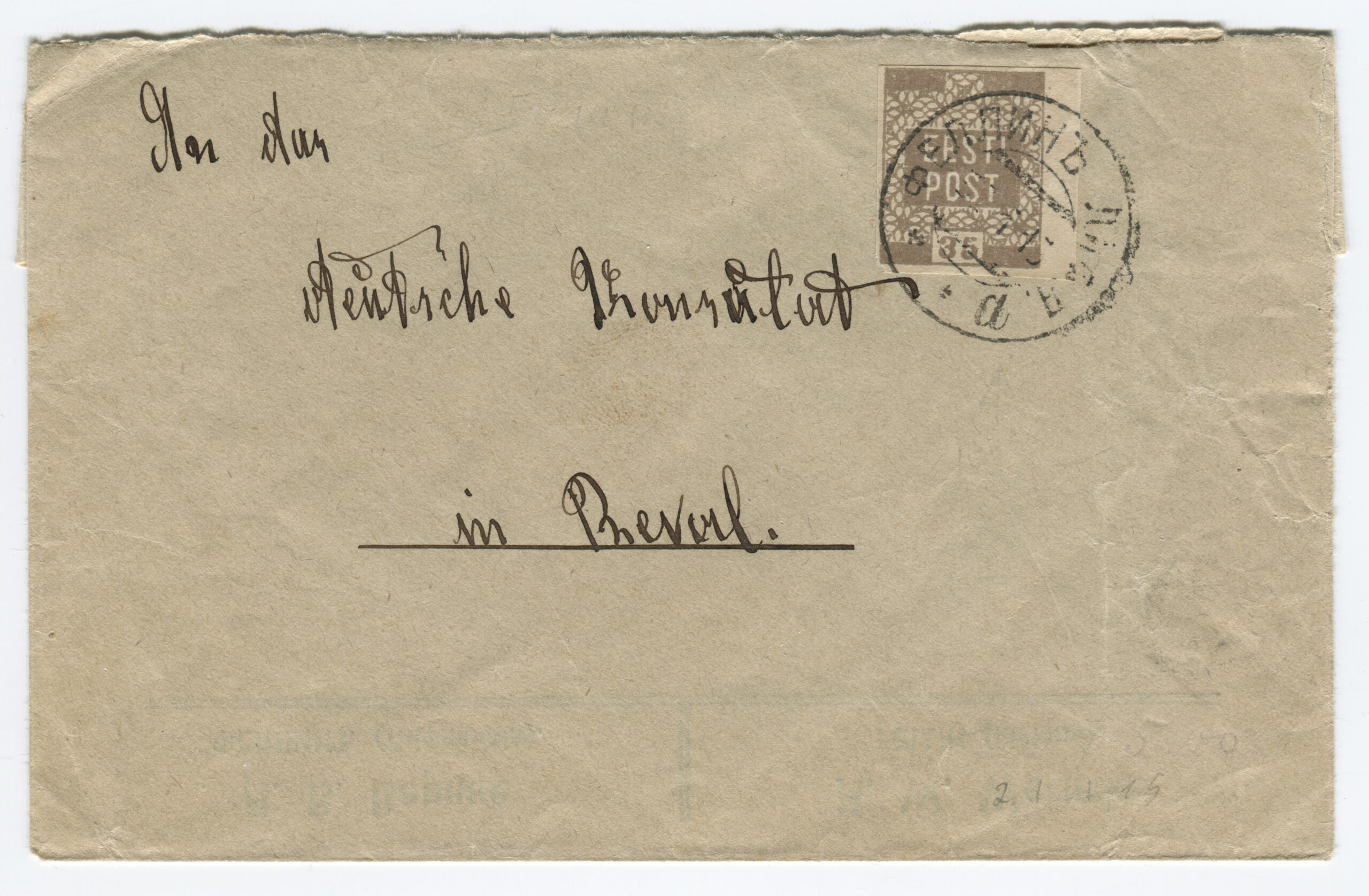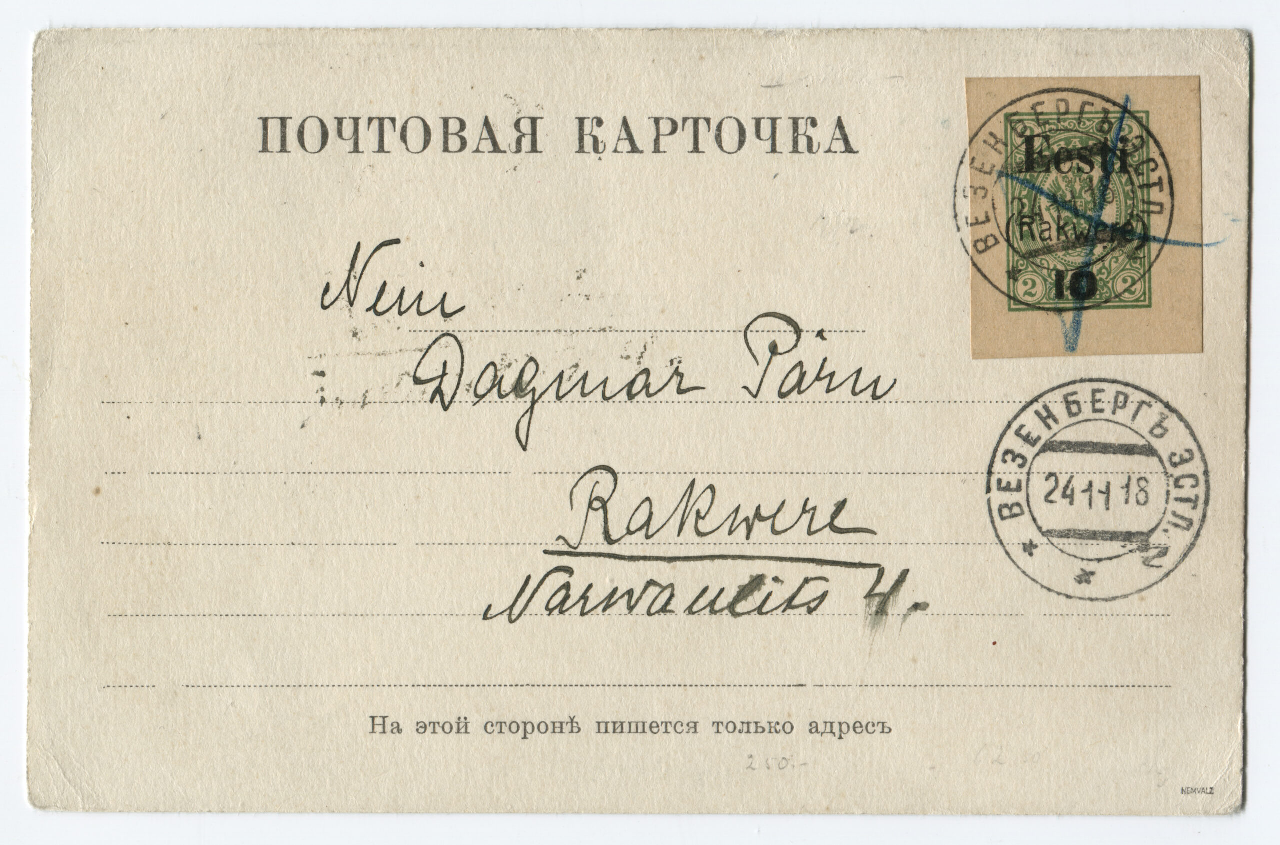 Rakvere’s Margarethe Levmann printing plant was handed the task to quickly overprint one- and two-kopeck postal band with new denominations: 10/2 kop.; quantity: 173 15/2 kop.; quantity: 402 20/2 kop.; quantity: 137 35/1 kop.; quantity: 26 The overprinting was in three rows: Eesti/ (Rakvere)/ and the new value. They were pasted as stamps on letters, postcards and other postal shipments.