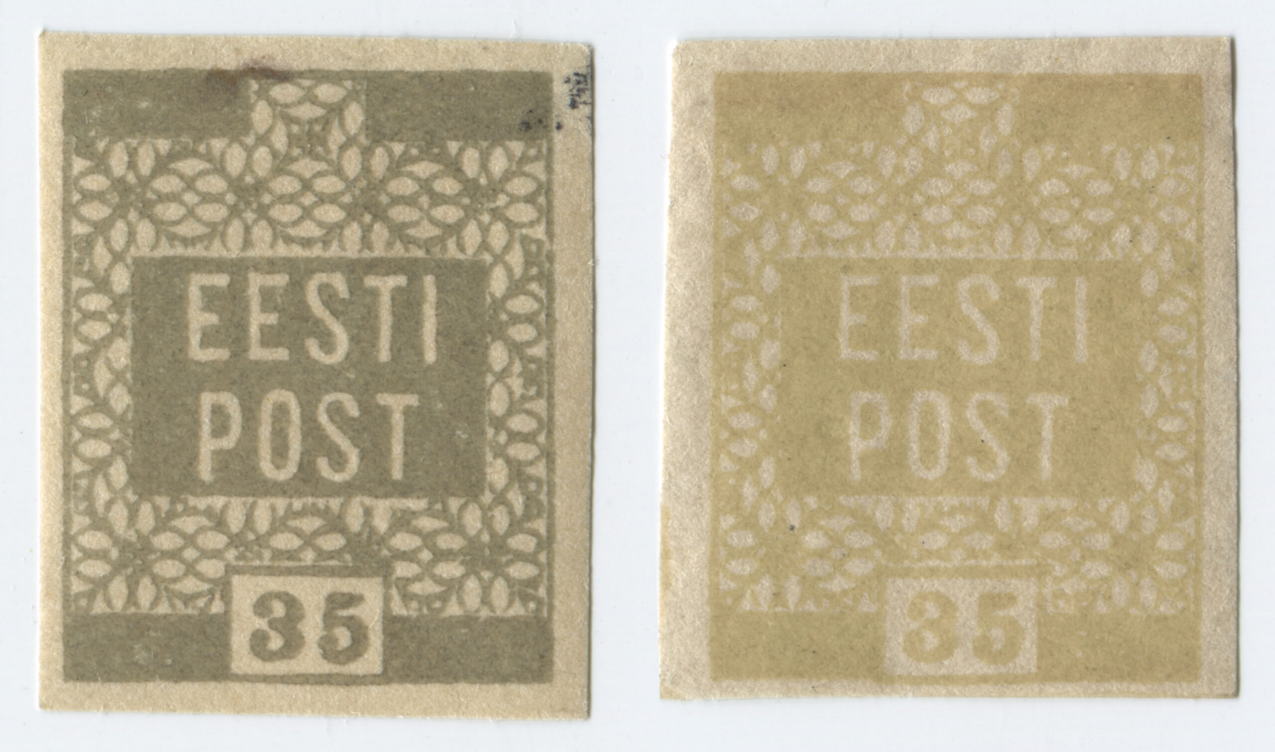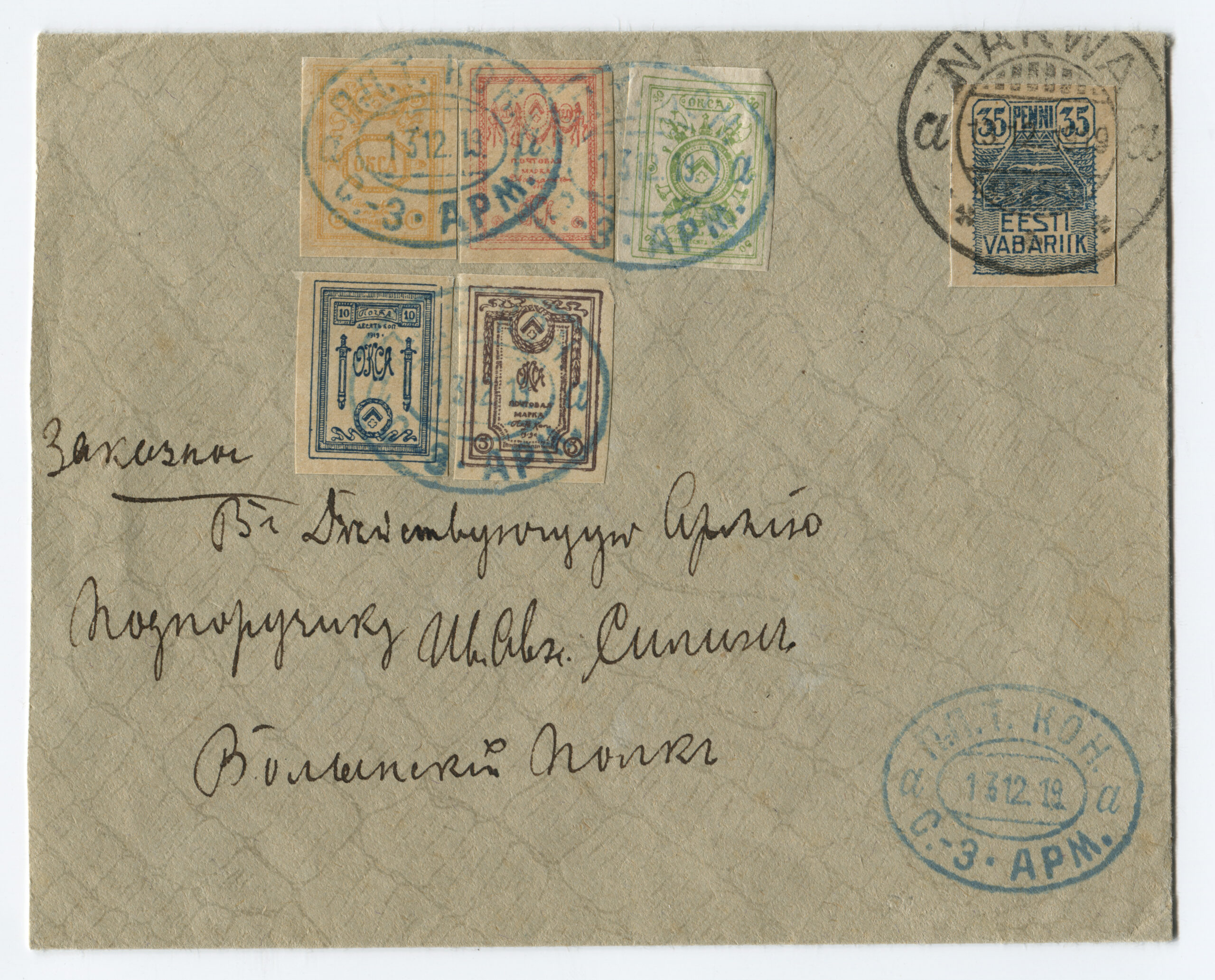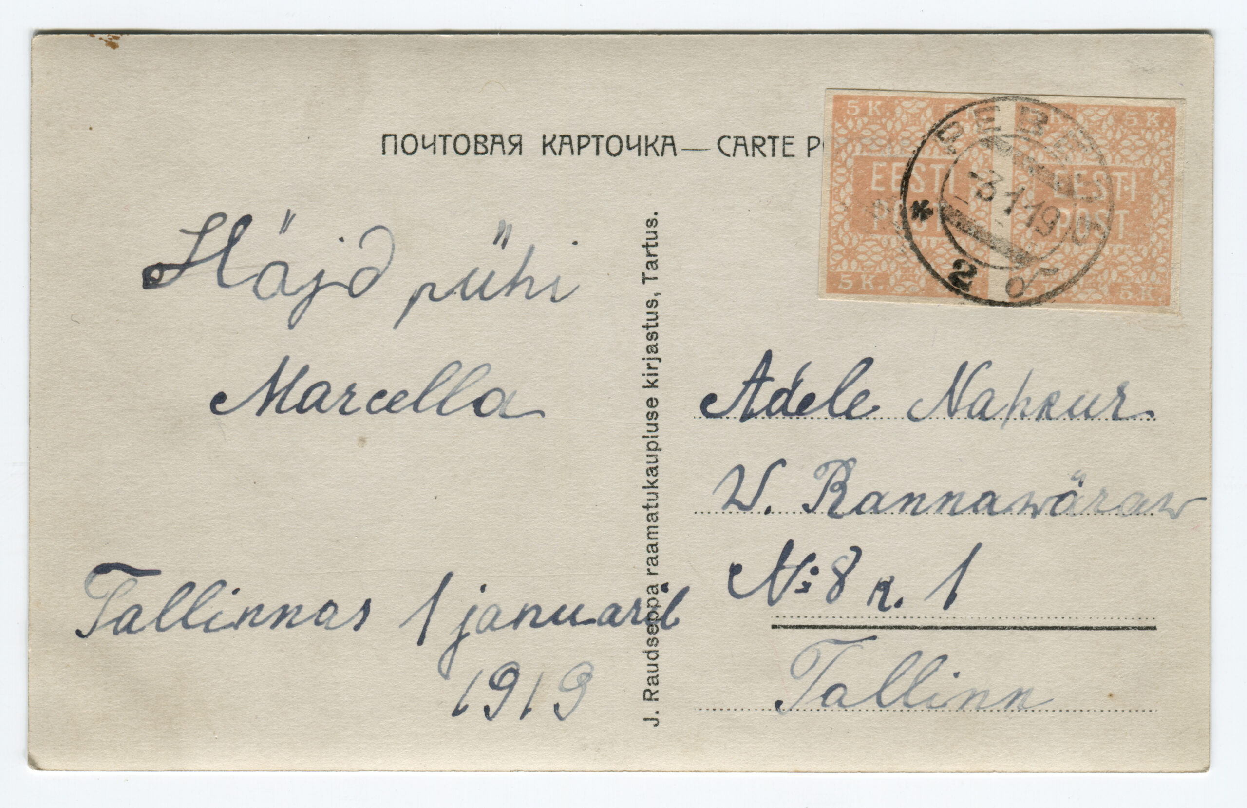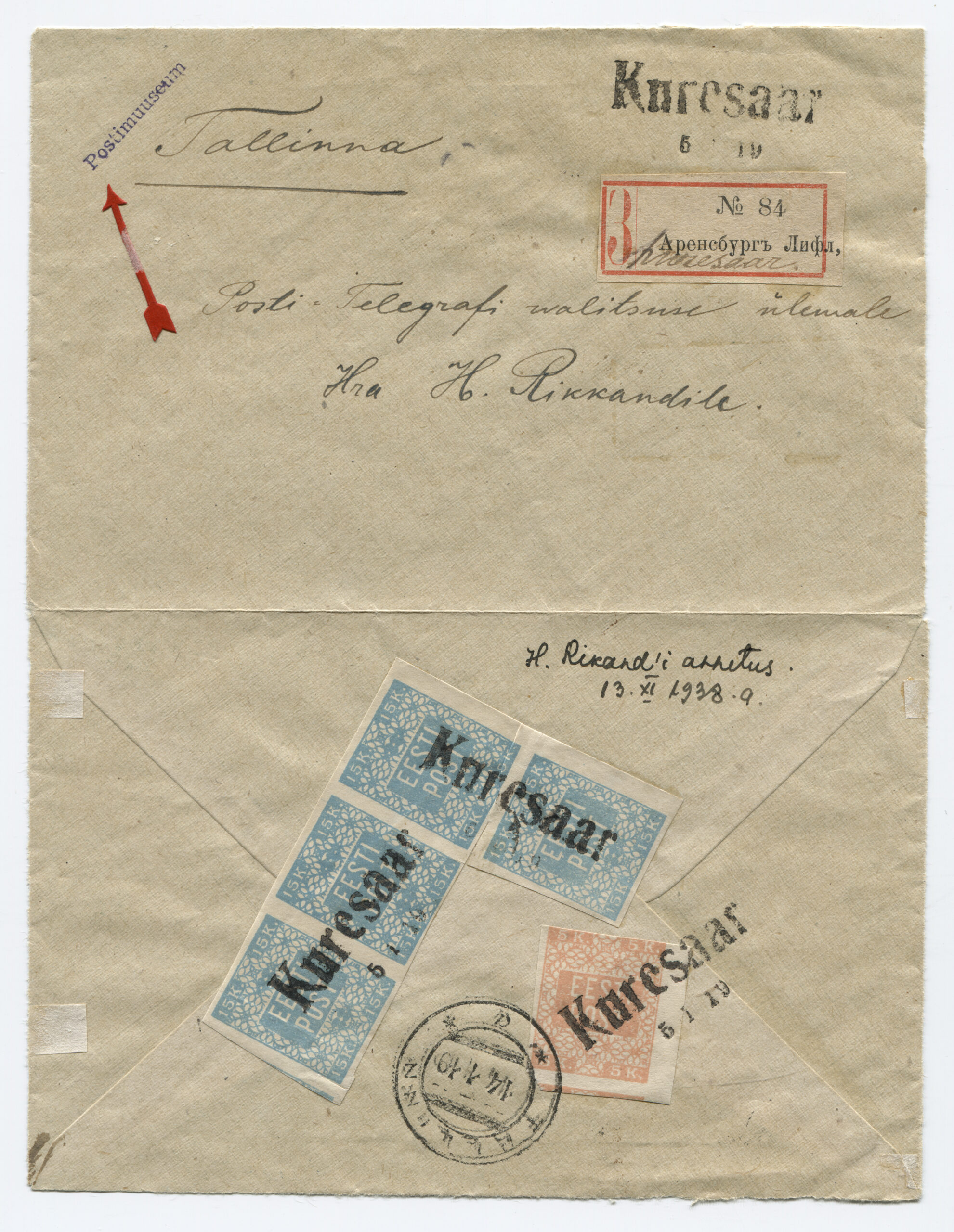 Letter sent from Kuressaare (5 January 1919) to Hindrek Rikand in Tallinn (14 January 1919). Rikand donated the letter to the Postal Museum in 1938. (Estonian National Museum)Registered letter (R-letter) from 23 November 1918. Local overprint of a piece of Russian postal stationery (Rakwere) and 15/20 kop. The surcharge for registered post – 20 kopecks – is handwritten. Letter sent to A. Eichenthal. (Estonian National Museum)A letter home sent bearing a 19 April 1919 postmark of the Danish volunteer company. The letter has a 15-kopeck flower design stamp, a 35-penn grey flower design stamp (cancelled with the postmark of the Danish volunteer company) and a 7-ore Danish stamp (cancelled in Denmark 19 April 1919). Both the grey 35-penn stamp with the flower design and the Danish volunteers’ postmark are rarely seen on letters. The Danish volunteer company was an infantry unit within the Estonian National Forces. (Estonian National Museum)Registered letter from 3 April 1919 was sent from Paldiski to Denmark. The letter bears the postmark of the Danish volunteer company. The stamps have local perforations and are cancelled with the “Baltiski” postmark. The Danish volunteer company took part in the Estonian War of Independence. The company arrived back in Tallinn on 4 April 1919, and they were sent to the Võru front in mid-May. The company included 12 officers, 12 NCOs and 189 soldiers. They left Estonia on 2 September 1919. (Estonian National Museum)Letter from 19 November 1918. Russian postal stationery with local overprint (Rakwere) and 15/7 kop. The “Rakwere” overprint on stamps and postal stationery was in use from 16-27 November 1918. (Estonian National Museum)Russian postal stationery. Local Rakvere overprint and 15/20 kop. Domestic letter sent to A. Eichenthal. The surcharge for registered post – 20 kopecks – is handwritten. (Estonian National Museum)Local letter. The stamp is cancelled with a temporary postmark – “Rakwere“. Local overprint of a Russian stamp (Rakwere) and 15/2 kop. (Estonian National Museum)Domestic letter from 18 November 1919. Local overprint of a Russian stamp (Rakwere) and 20/2 kop. (Estonian National Museum)Local letter (postcard) from 24 November 1918. Local overprint of a Russian stamp (Rakwere) and 10/2 kop. Wesenberg (Rakvere). (Private collection)Local registered letter (“R-letter”) Local overprint of a piece of Russian postal stationery (Rakwere) and 15/20. A stamp with a local overprint (Rakwere) and 20/2 kop. has been added as a surcharge for a registered letter. The letter is addressed to the Rakvere postmaster A. Torn. (Private collection)Registered postcard from 23 November 1918. Russian postal stationery, local overprint (Rakwere) and 10/3 kop. The surcharge for registered post – 15 kopecks – is handwritten. Letter sent to A. Eichenthal. (Private collection)Russian postal stationery sent to Valga, 10 January 1919. The Commune of the Working People of Estonia controlled Tartu from 21 December 1918 to 14 January 1919. The postcard rate was 10 kopecks. A surcharge of 7 kopecks has been handwritten on a 3-kopeck piece of postal stationery. (Private collection)The Commune of the Working People of Estonia was in power in Otepää from 12 December 1918 to 21 January 1919. During this time, the Russian-language ”Нустаку“ (Nuustaku) postmark were used. The letter was sent from Otepää to Tallinn, to the Estonian postmaster general Hindrek Rikand. The rate for a letter, 15 kopecks, was written by hand. (Private collection)Registered letter from 30 October 1919, sent from Tallinn to Germany. Postmark indicating receipt, “Heubude 16.11.1919“. Letters sent abroad during the War of Independence were routed through the Nordic countries. (Private collection)Northwestern Army stamps were printed at Bernhard Mäns printing plant in Tallinn on 20 August 1919. When General Yudenich retreated, the stamps fell into Bolshevik hands and were destroyed by them. The stamps are cancelled with a field postmark of the Northwestern Army ,13 December 1919. The letter bears a 35-penn seagull stamp cancelled with the “Narwa” postmark. (Private collection)The flower patterned stamps in the 35-penn denomination were printed in three runs (18 January to 2 May 1919), and all exhibited colour variations. Brown (with colour differences), grey, olive-grey and olive-green. Pairs of grey stamps are rare. (Private collection)On the left, a grey 35-penn stamp and on the right, an olive-green 35-penn flower design stamp. (Private collection)Letter from 29 September 1919, sent from Tallinn by surface mail to Helsinki and on to Switzerland. Marine mail was censored with the impression of a red triangular seal that was in use from September to November 1919. The letter bears a 15-kopeck flower design stamp that was both cut and perforated. Perforated 15-kopeck stamps are rare, particularly on letters. (Private collection)Letter from 20 March 1919, sent from Tallinn to Borgå (Porvoo), Finland. Colour variations occurred in the printing of the 35-penn flower design stamp. Grey stamps are rare, in particular on letters. (Private collection)Letter sent 1 July 1919 from Tallinn to Stuttgart. Inspected in Tallinn, letter bears the impression of the triangular censor’s seal, S.K. The S.K. (Sõjakontroll, military inspection) mark was in use in Tallinn from 5 January 1919. (Private collection)A registered letter from 8 April 1919, sent from Tallinn to Borna, Germany. The registered letter (R-letter) postmark with numbers, the date postmark “Ревель” (Revel, the old name for Tallinn) in use in the tsarist era, both the Tallinn and Finland military inspection postmark. The first Estonian-language postmark “Tallinn” has been added over the “Ревель” postmark. The letter also bears the first Estonian-language R-postmark “Tallinn”. (Private collection)9 December 1918. The postcard was sent from Tartu to Riga in the early stages o