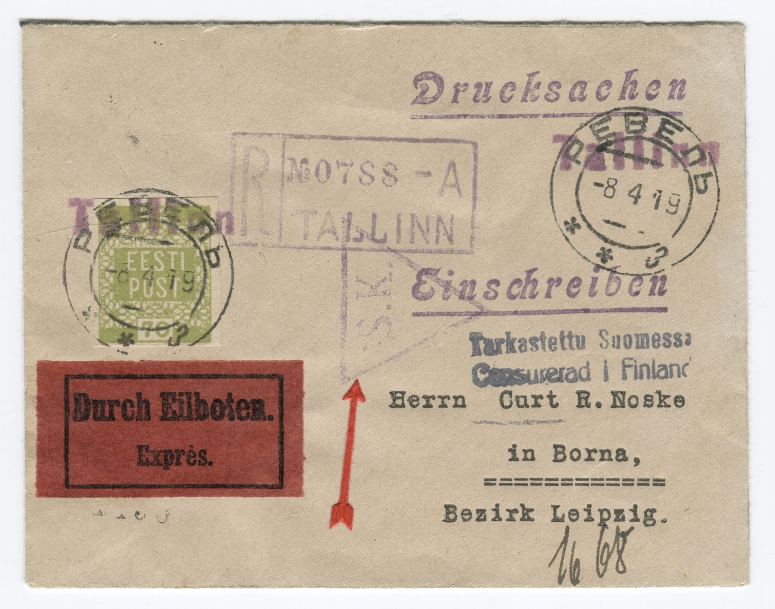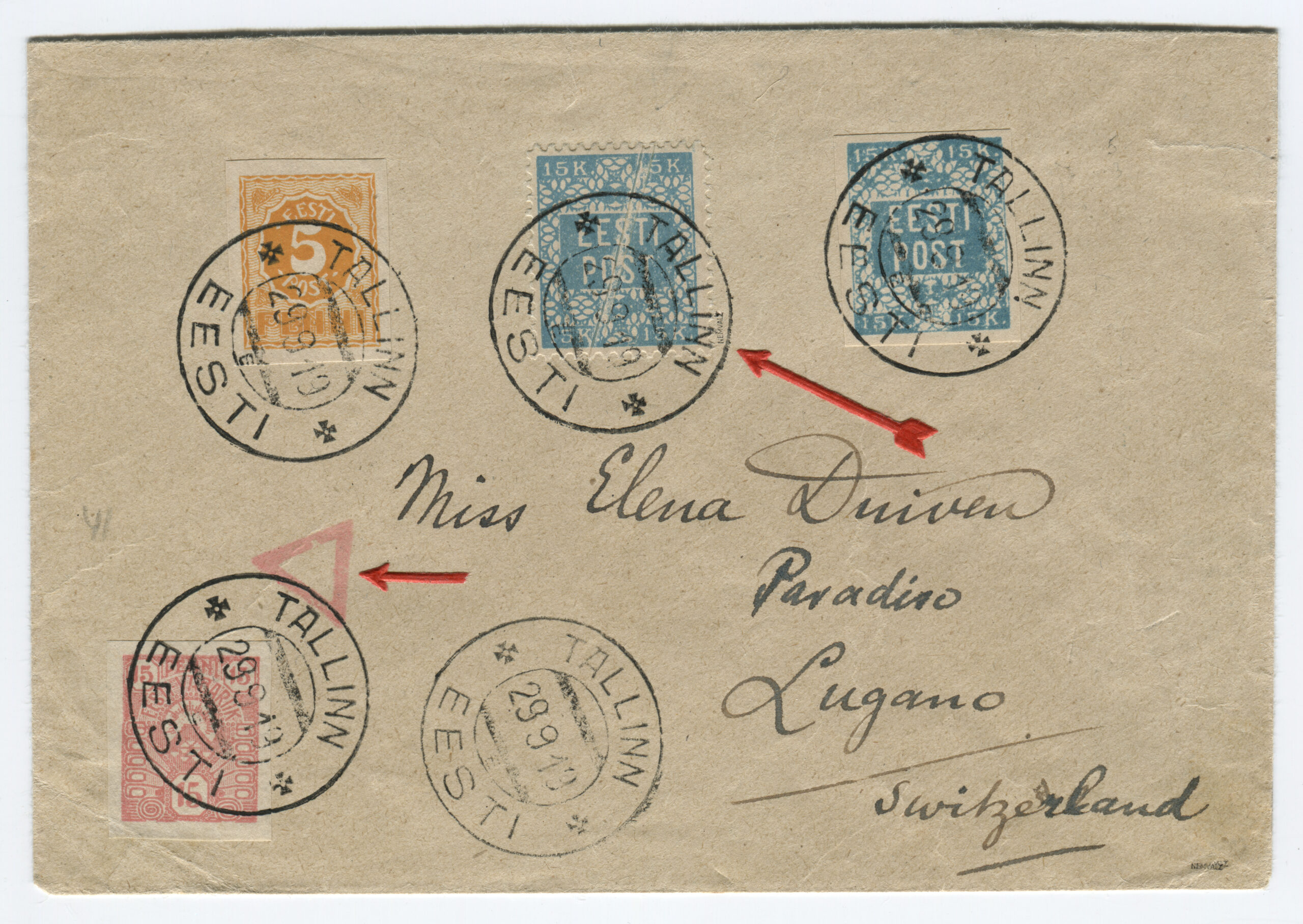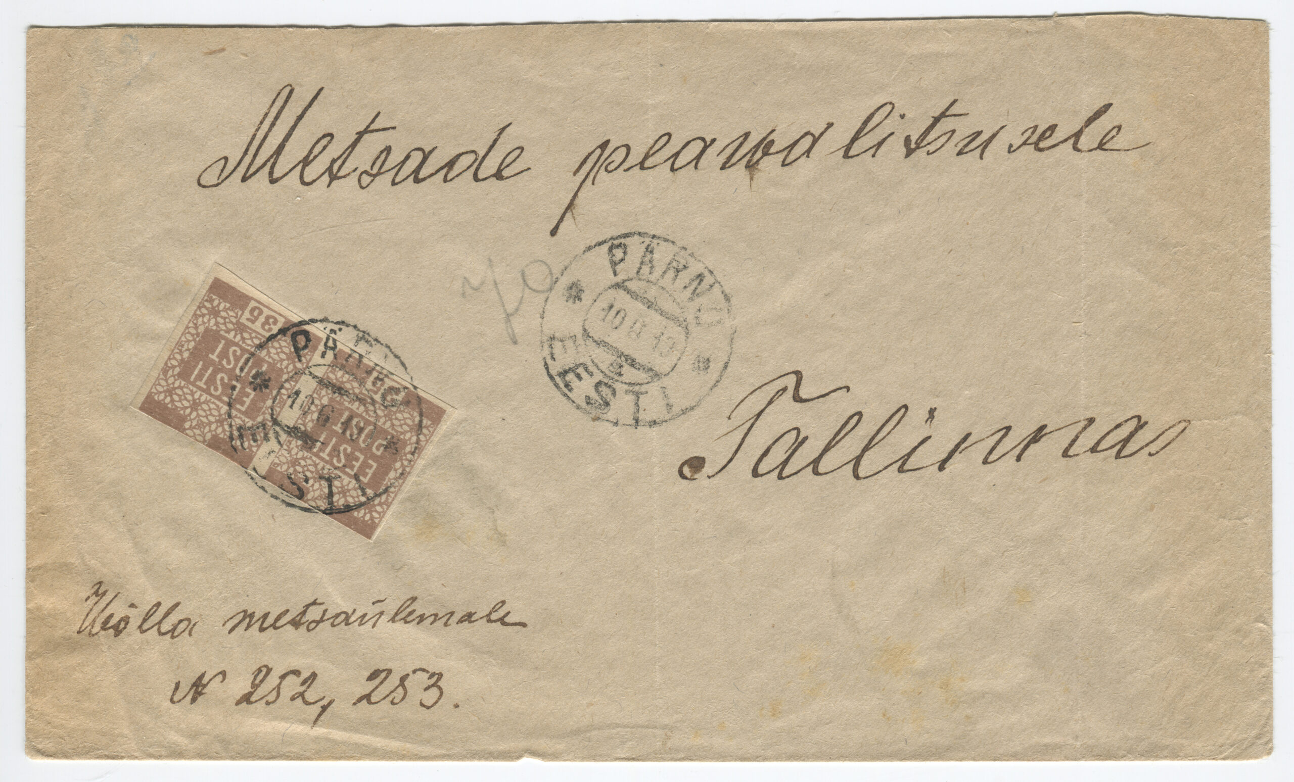 Letter sent from Kuressaare (5 January 1919) to Hindrek Rikand in Tallinn (14 January 1919). Rikand donated the letter to the Postal Museum in 1938. (Estonian National Museum)Registered letter (R-letter) from 23 November 1918. Local overprint of a piece of Russian postal stationery (Rakwere) and 15/20 kop. The surcharge for registered post – 20 kopecks – is handwritten. Letter sent to A. Eichenthal. (Estonian National Museum)A letter home sent bearing a 19 April 1919 postmark of the Danish volunteer company. The letter has a 15-kopeck flower design stamp, a 35-penn grey flower design stamp (cancelled with the postmark of the Danish volunteer company) and a 7-ore Danish stamp (cancelled in Denmark 19 April 1919). Both the grey 35-penn stamp with the flower design and the Danish volunteers’ postmark are rarely seen on letters. The Danish volunteer company was an infantry unit within the Estonian National Forces. (Estonian National Museum)Registered letter from 3 April 1919 was sent from Paldiski to Denmark. The letter bears the postmark of the Danish volunteer company. The stamps have local perforations and are cancelled with the “Baltiski” postmark. The Danish volunteer company took part in the Estonian War of Independence. The company arrived back in Tallinn on 4 April 1919, and they were sent to the Võru front in mid-May. The company included 12 officers, 12 NCOs and 189 soldiers. They left Estonia on 2 September 1919. (Estonian National Museum)Letter from 19 November 1918. Russian postal stationery with local overprint (Rakwere) and 15/7 kop. The “Rakwere” overprint on stamps and postal stationery was in use from 16-27 November 1918. (Estonian National Museum)Russian postal stationery. Local Rakvere overprint and 15/20 kop. Domestic letter sent to A. Eichenthal. The surcharge for registered post – 20 kopecks – is handwritten. (Estonian National Museum)Local letter. The stamp is cancelled with a temporary postmark – “Rakwere“. Local overprint of a Russian stamp (Rakwere) and 15/2 kop. (Estonian National Museum)Domestic letter from 18 November 1919. Local overprint of a Russian stamp (Rakwere) and 20/2 kop. (Estonian National Museum)Local letter (postcard) from 24 November 1918. Local overprint of a Russian stamp (Rakwere) and 10/2 kop. Wesenberg (Rakvere). (Private collection)Local registered letter (“R-letter”) Local overprint of a piece of Russian postal stationery (Rakwere) and 15/20. A stamp with a local overprint (Rakwere) and 20/2 kop. has been added as a surcharge for a registered letter. The letter is addressed to the Rakvere postmaster A. Torn. (Private collection)Registered postcard from 23 November 1918. Russian postal stationery, local overprint (Rakwere) and 10/3 kop. The surcharge for registered post – 15 kopecks – is handwritten. Letter sent to A. Eichenthal. (Private collection)Russian postal stationery sent to Valga, 10 January 1919. The Commune of the Working People of Estonia controlled Tartu from 21 December 1918 to 14 January 1919. The postcard rate was 10 kopecks. A surcharge of 7 kopecks has been handwritten on a 3-kopeck piece of postal stationery. (Private collection)The Commune of the Working People of Estonia was in power in Otepää from 12 December 1918 to 21 January 1919. During this time, the Russian-language ”Нустаку“ (Nuustaku) postmark were used. The letter was sent from Otepää to Tallinn, to the Estonian postmaster general Hindrek Rikand. The rate for a letter, 15 kopecks, was written by hand. (Private collection)Registered letter from 30 October 1919, sent from Tallinn to Germany. Postmark indicating receipt, “Heubude 16.11.1919“. Letters sent abroad during the War of Independence were routed through the Nordic countries. (Private collection)Northwestern Army stamps were printed at Bernhard Mäns printing plant in Tallinn on 20 August 1919. When General Yudenich retreated, the stamps fell into Bolshevik hands and were destroyed by them. The stamps are cancelled with a field postmark of the Northwestern Army ,13 December 1919. The letter bears a 35-penn seagull stamp cancelled with the “Narwa” postmark. (Private collection)The flower patterned stamps in the 35-penn denomination were printed in three runs (18 January to 2 May 1919), and all exhibited colour variations. Brown (with colour differences), grey, olive-grey and olive-green. Pairs of grey stamps are rare. (Private collection)On the left, a grey 35-penn stamp and on the right, an olive-green 35-penn flower design stamp. (Private collection)Letter from 29 September 1919, sent from Tallinn by surface mail to Helsinki and on to Switzerland. Marine mail was censored with the impression of a red triangular seal that was in use from September to November 1919. The letter bears a 15-kopeck flower design stamp that was both cut and perforated. Perforated 15-kopeck stamps are rare, particularly on letters. (Private collection)Letter from 20 March 1919, sent from Tallinn to Borgå (Porvoo), Finland. Colour variations occurred in the printing of the 35-penn flower design stamp. Grey stamps are rare, in particular on letters. (Private collection)Letter sent 1 July 1919 from Tallinn to Stuttgart. Inspected in Tallinn, letter bears the impression of the triangular censor’s seal, S.K. The S.K. (Sõjakontroll, military inspection) mark was in use in Tallinn from 5 January 1919. (Private collection)A registered letter from 8 April 1919, sent from Tallinn to Borna, Germany. The registered letter (R-letter) postmark with numbers, the date postmark “Ревель” (Revel, the old name for Tallinn) in use in the tsarist era, both the Tallinn and Finland military inspection postmark. The first Estonian-language postmark “Tallinn” has been added over the “Ревель” postmark. The letter also bears the first Estonian-language R-postmark “Tallinn”. (Private collection)9 December 1918. The postcard was sent from Tartu to Riga in the early stages o
