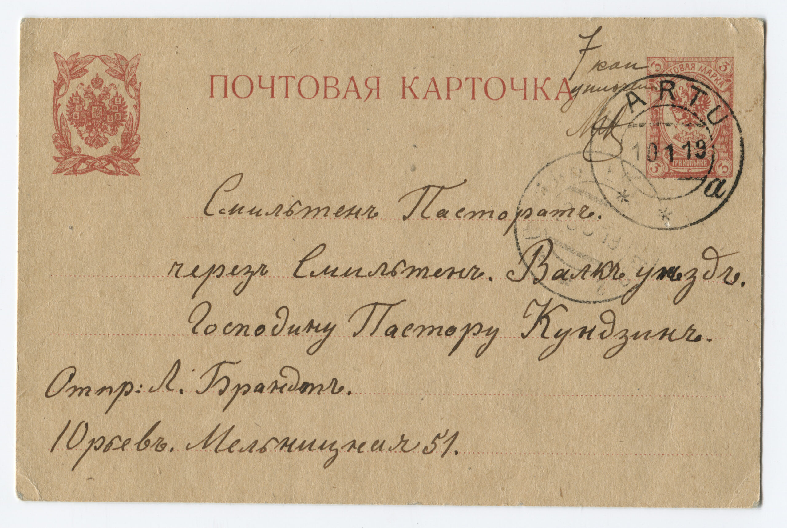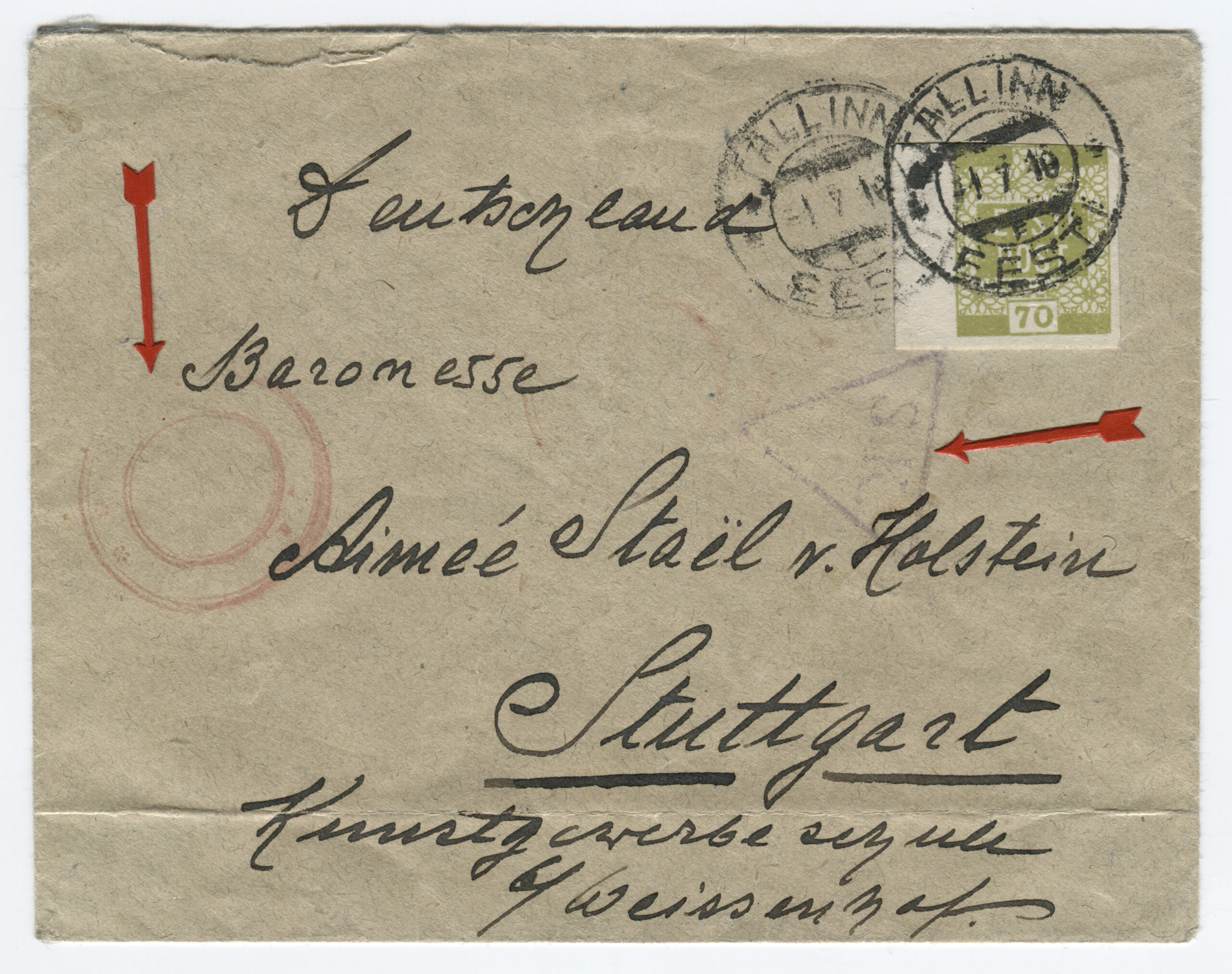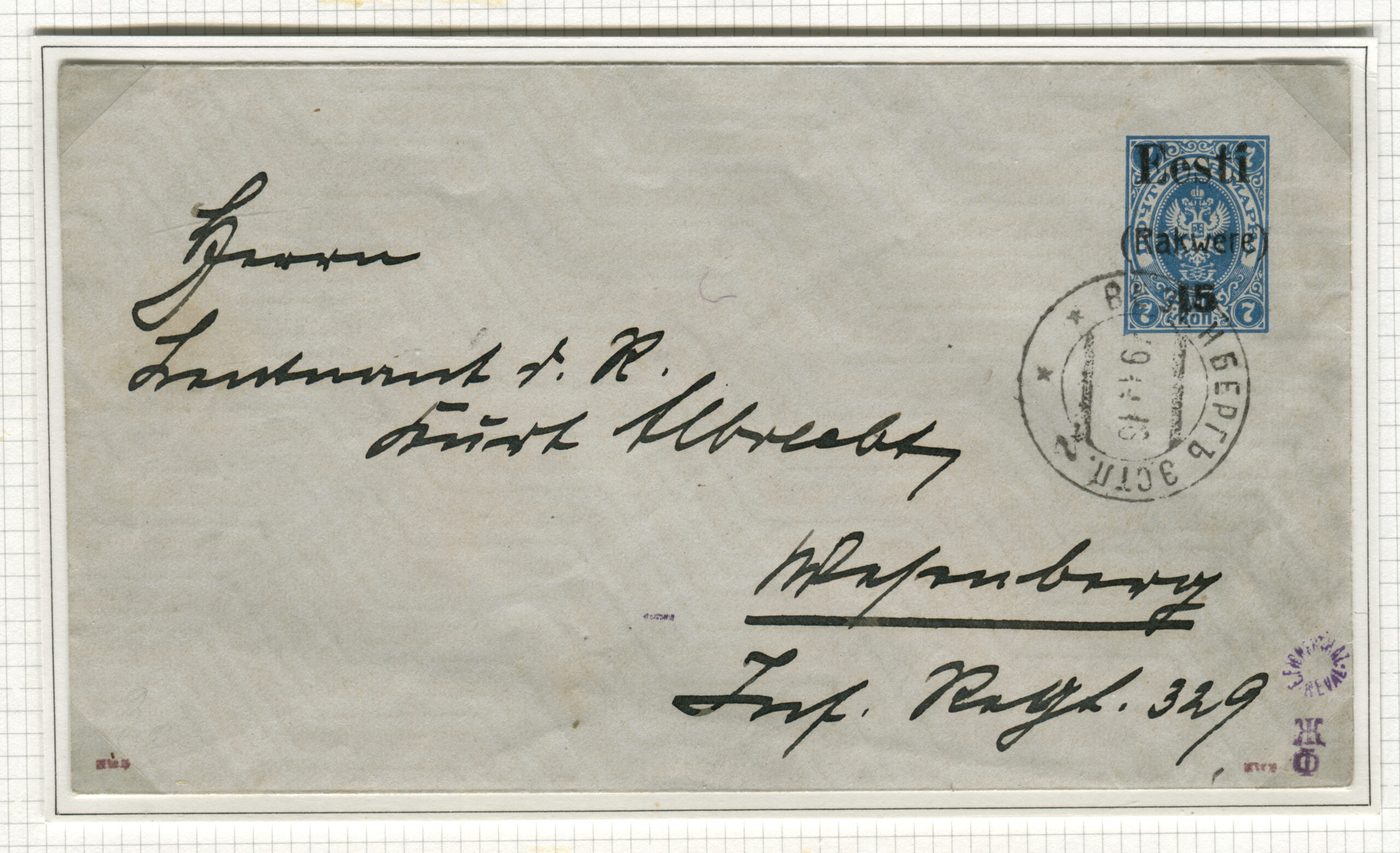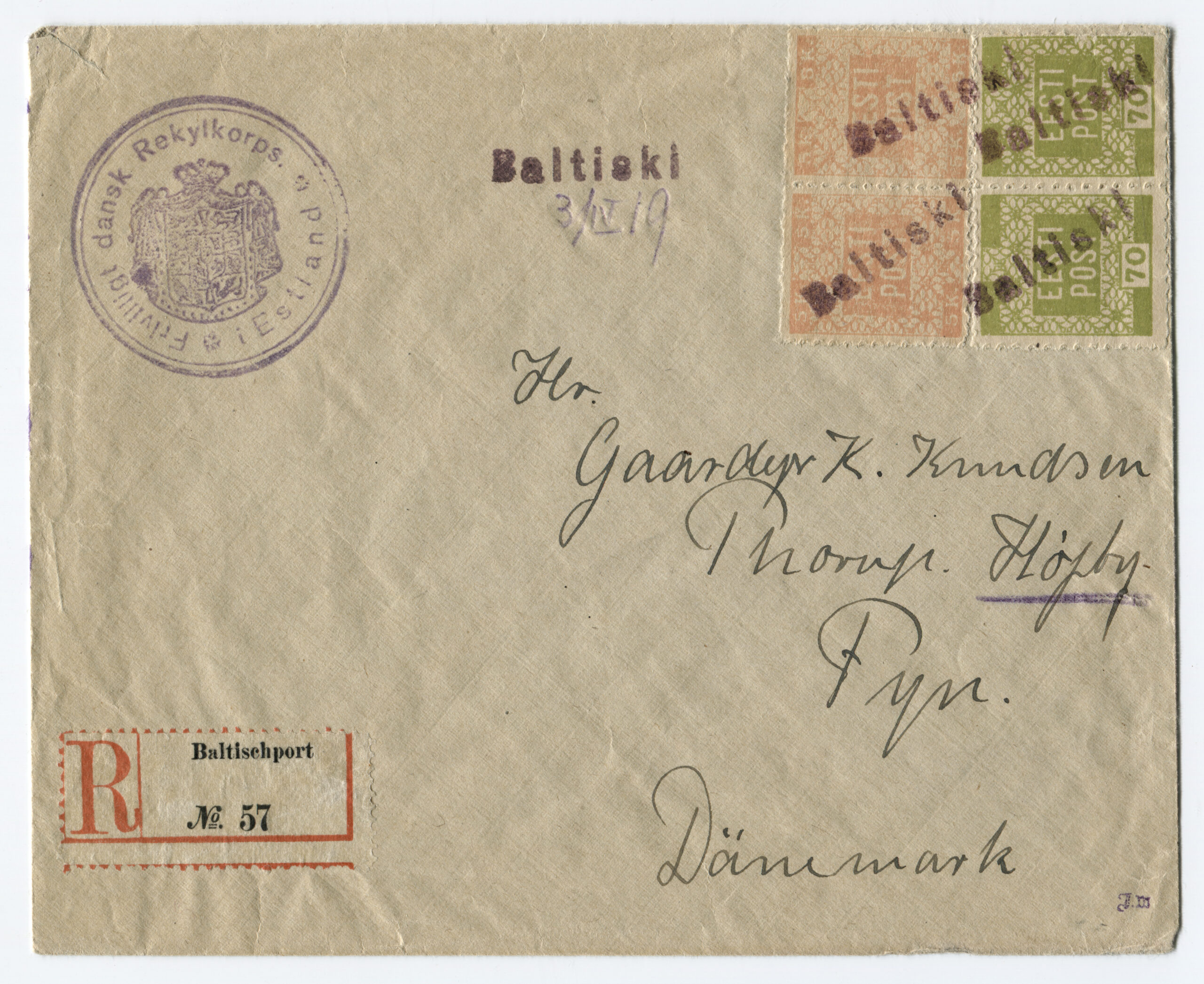 Letter sent from Kuressaare (5 January 1919) to Hindrek Rikand in Tallinn (14 January 1919). Rikand donated the letter to the Postal Museum in 1938. (Estonian National Museum)Registered letter (R-letter) from 23 November 1918. Local overprint of a piece of Russian postal stationery (Rakwere) and 15/20 kop. The surcharge for registered post – 20 kopecks – is handwritten. Letter sent to A. Eichenthal. (Estonian National Museum)A letter home sent bearing a 19 April 1919 postmark of the Danish volunteer company. The letter has a 15-kopeck flower design stamp, a 35-penn grey flower design stamp (cancelled with the postmark of the Danish volunteer company) and a 7-ore Danish stamp (cancelled in Denmark 19 April 1919). Both the grey 35-penn stamp with the flower design and the Danish volunteers’ postmark are rarely seen on letters. The Danish volunteer company was an infantry unit within the Estonian National Forces. (Estonian National Museum)Registered letter from 3 April 1919 was sent from Paldiski to Denmark. The letter bears the postmark of the Danish volunteer company. The stamps have local perforations and are cancelled with the “Baltiski” postmark. The Danish volunteer company took part in the Estonian War of Independence. The company arrived back in Tallinn on 4 April 1919, and they were sent to the Võru front in mid-May. The company included 12 officers, 12 NCOs and 189 soldiers. They left Estonia on 2 September 1919. (Estonian National Museum)Letter from 19 November 1918. Russian postal stationery with local overprint (Rakwere) and 15/7 kop. The “Rakwere” overprint on stamps and postal stationery was in use from 16-27 November 1918. (Estonian National Museum)Russian postal stationery. Local Rakvere overprint and 15/20 kop. Domestic letter sent to A. Eichenthal. The surcharge for registered post – 20 kopecks – is handwritten. (Estonian National Museum)Local letter. The stamp is cancelled with a temporary postmark – “Rakwere“. Local overprint of a Russian stamp (Rakwere) and 15/2 kop. (Estonian National Museum)Domestic letter from 18 November 1919. Local overprint of a Russian stamp (Rakwere) and 20/2 kop. (Estonian National Museum)Local letter (postcard) from 24 November 1918. Local overprint of a Russian stamp (Rakwere) and 10/2 kop. Wesenberg (Rakvere). (Private collection)Local registered letter (“R-letter”) Local overprint of a piece of Russian postal stationery (Rakwere) and 15/20. A stamp with a local overprint (Rakwere) and 20/2 kop. has been added as a surcharge for a registered letter. The letter is addressed to the Rakvere postmaster A. Torn. (Private collection)Registered postcard from 23 November 1918. Russian postal stationery, local overprint (Rakwere) and 10/3 kop. The surcharge for registered post – 15 kopecks – is handwritten. Letter sent to A. Eichenthal. (Private collection)Russian postal stationery sent to Valga, 10 January 1919. The Commune of the Working People of Estonia controlled Tartu from 21 December 1918 to 14 January 1919. The postcard rate was 10 kopecks. A surcharge of 7 kopecks has been handwritten on a 3-kopeck piece of postal stationery. (Private collection)The Commune of the Working People of Estonia was in power in Otepää from 12 December 1918 to 21 January 1919. During this time, the Russian-language ”Нустаку“ (Nuustaku) postmark were used. The letter was sent from Otepää to Tallinn, to the Estonian postmaster general Hindrek Rikand. The rate for a letter, 15 kopecks, was written by hand. (Private collection)Registered letter from 30 October 1919, sent from Tallinn to Germany. Postmark indicating receipt, “Heubude 16.11.1919“. Letters sent abroad during the War of Independence were routed through the Nordic countries. (Private collection)Northwestern Army stamps were printed at Bernhard Mäns printing plant in Tallinn on 20 August 1919. When General Yudenich retreated, the stamps fell into Bolshevik hands and were destroyed by them. The stamps are cancelled with a field postmark of the Northwestern Army ,13 December 1919. The letter bears a 35-penn seagull stamp cancelled with the “Narwa” postmark. (Private collection)The flower patterned stamps in the 35-penn denomination were printed in three runs (18 January to 2 May 1919), and all exhibited colour variations. Brown (with colour differences), grey, olive-grey and olive-green. Pairs of grey stamps are rare. (Private collection)On the left, a grey 35-penn stamp and on the right, an olive-green 35-penn flower design stamp. (Private collection)Letter from 29 September 1919, sent from Tallinn by surface mail to Helsinki and on to Switzerland. Marine mail was censored with the impression of a red triangular seal that was in use from September to November 1919. The letter bears a 15-kopeck flower design stamp that was both cut and perforated. Perforated 15-kopeck stamps are rare, particularly on letters. (Private collection)Letter from 20 March 1919, sent from Tallinn to Borgå (Porvoo), Finland. Colour variations occurred in the printing of the 35-penn flower design stamp. Grey stamps are rare, in particular on letters. (Private collection)Letter sent 1 July 1919 from Tallinn to Stuttgart. Inspected in Tallinn, letter bears the impression of the triangular censor’s seal, S.K. The S.K. (Sõjakontroll, military inspection) mark was in use in Tallinn from 5 January 1919. (Private collection)A registered letter from 8 April 1919, sent from Tallinn to Borna, Germany. The registered letter (R-letter) postmark with numbers, the date postmark “Ревель” (Revel, the old name for Tallinn) in use in the tsarist era, both the Tallinn and Finland military inspection postmark. The first Estonian-language postmark “Tallinn” has been added over the “Ревель” postmark. The letter also bears the first Estonian-language R-postmark “Tallinn”. (Private collection)9 December 1918. The postcard was sent from Tartu to Riga in the early stages o