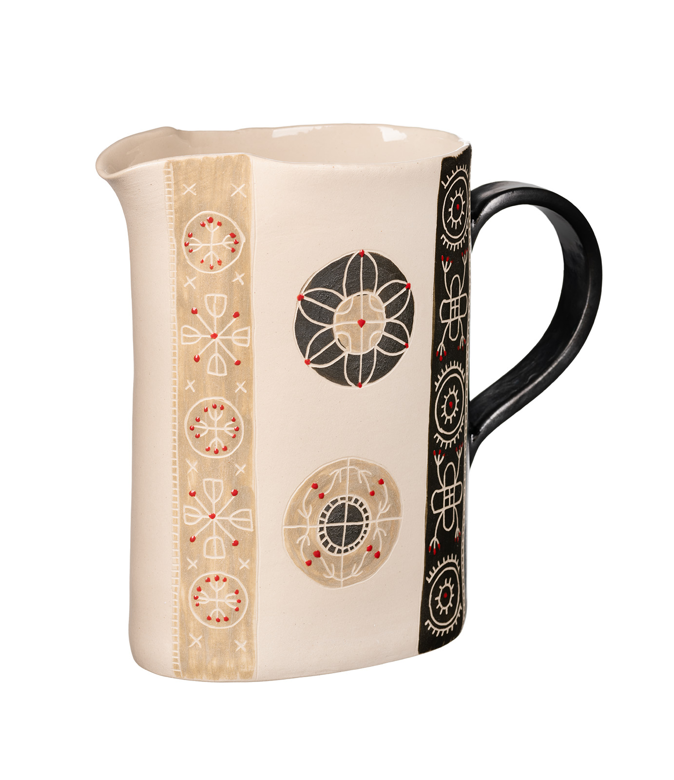 Arhailise tikandiga kaunistatud savist kann on valmistatud käsitööna Mulgi Savikojas.