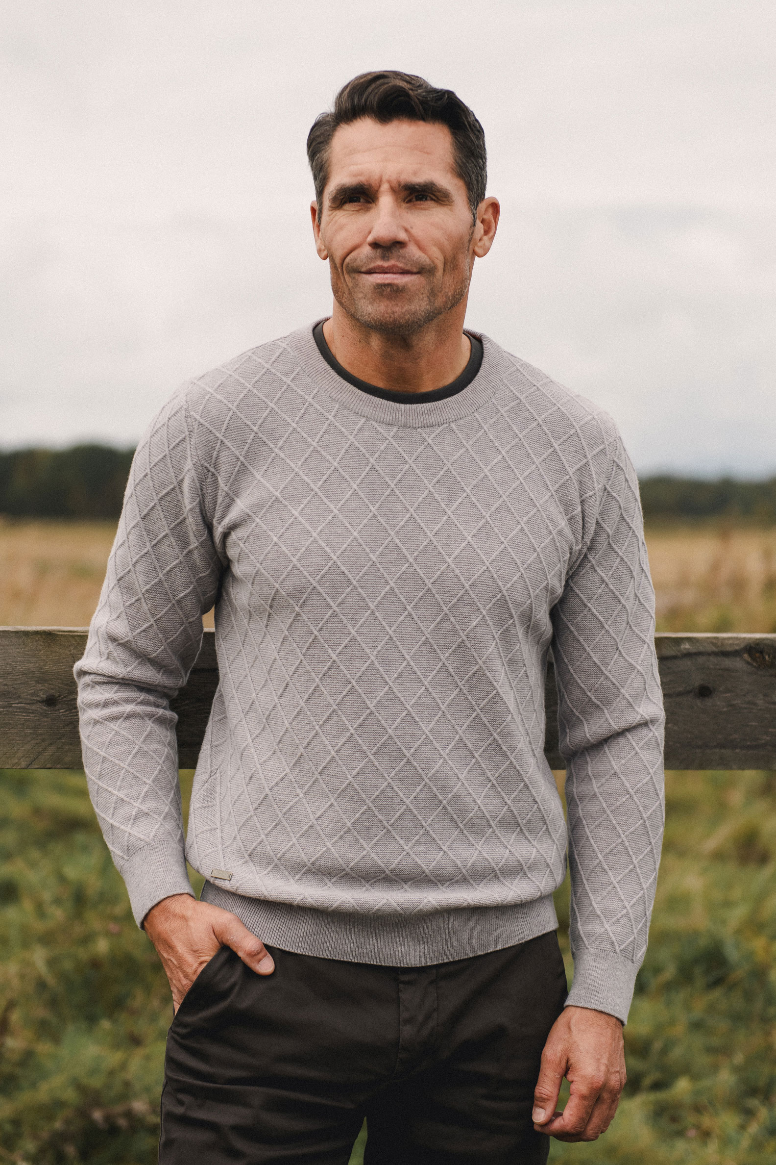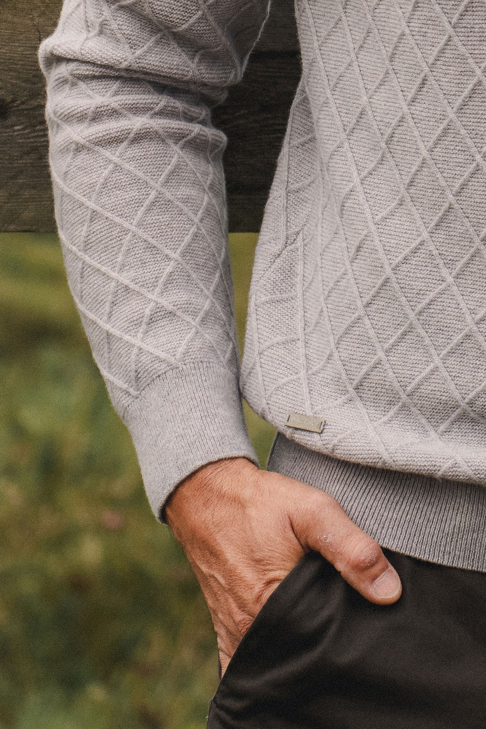 Meeste O-kaelusega õhem pehme ja soe täisvillane kampsun on üleni rombi koemustriga, mille ruudustike sees on ripskude.