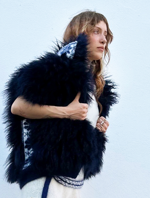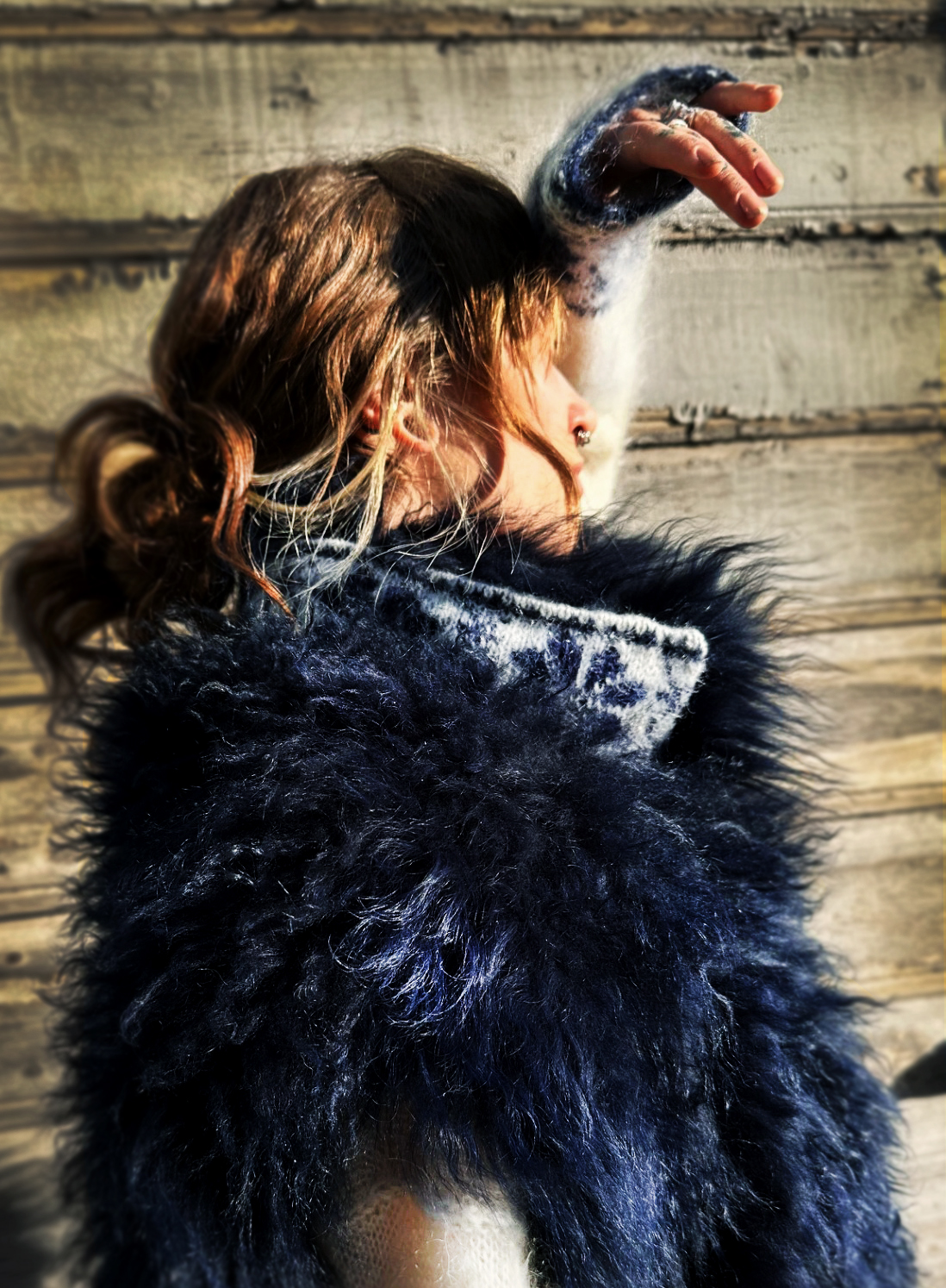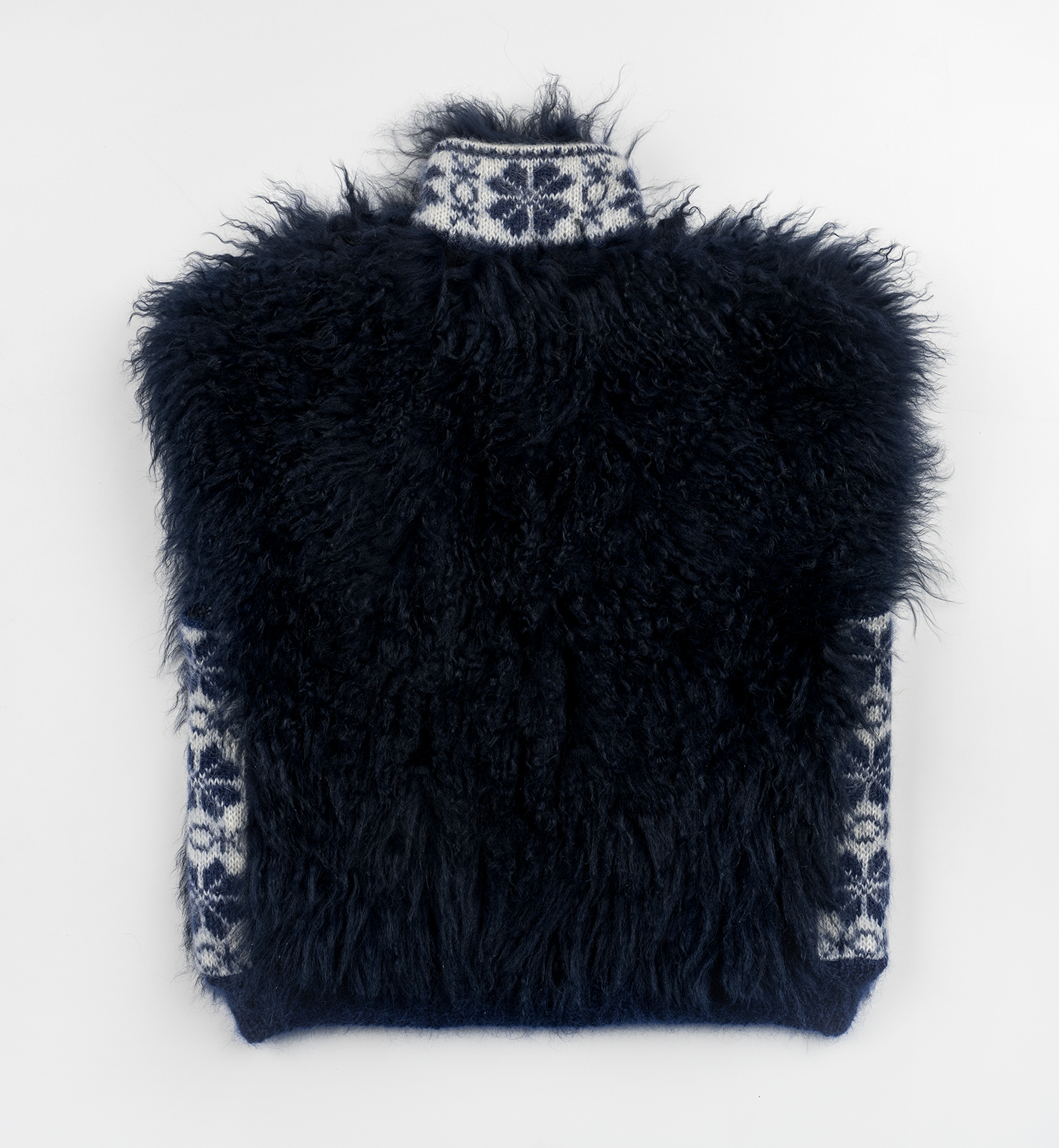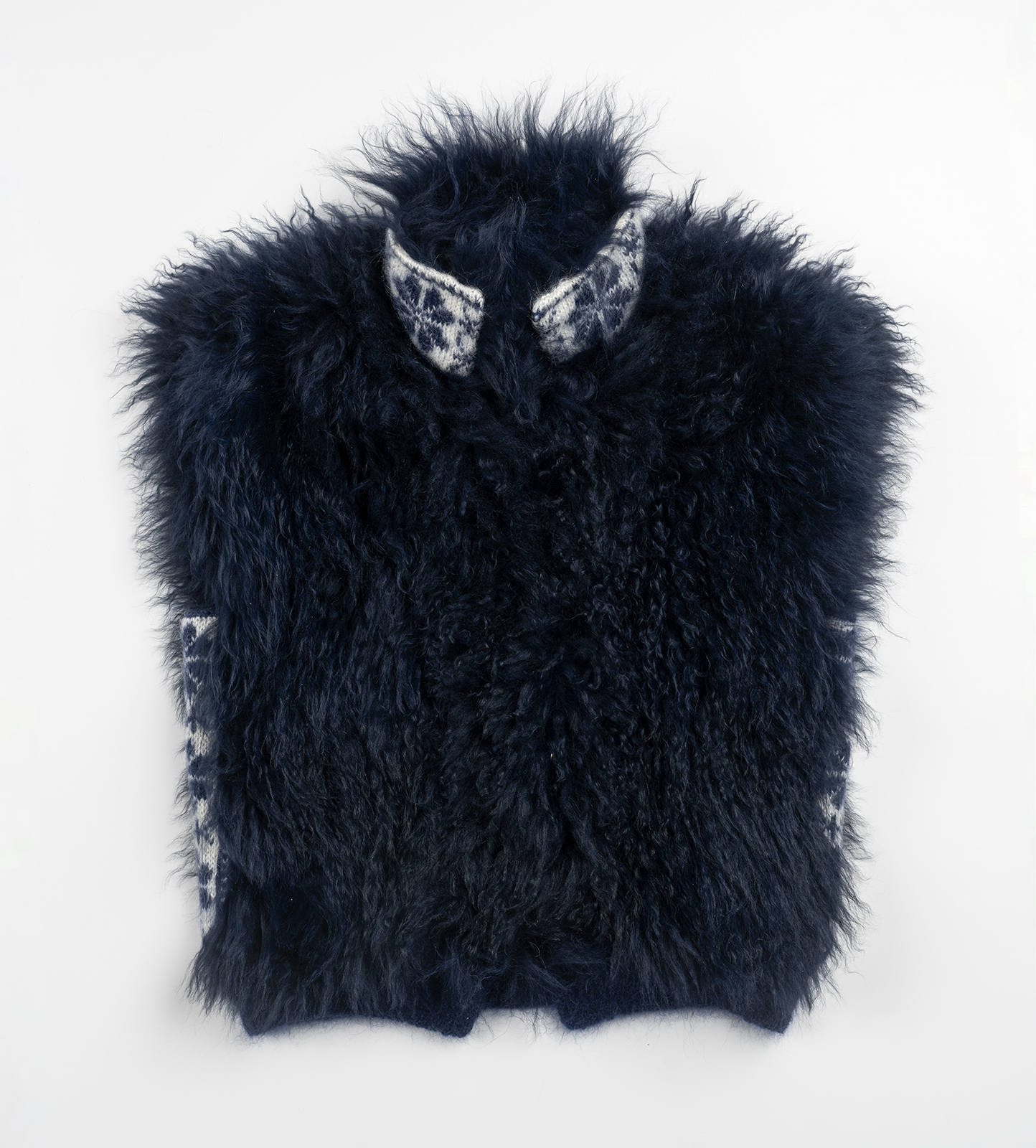 Lambanahkset vesti täiendab mohääri ja siidisegu lõngast varrastel kootud mustridetailid, mis on inspireeritud Lääne-Eesti saarte rannarootsi mustritest. Traditsioonilised tumesinised värvid toovad esile rahulikud rütmid ja põlvest põlve edasi kantud kujundid tänases tõlgenduses.