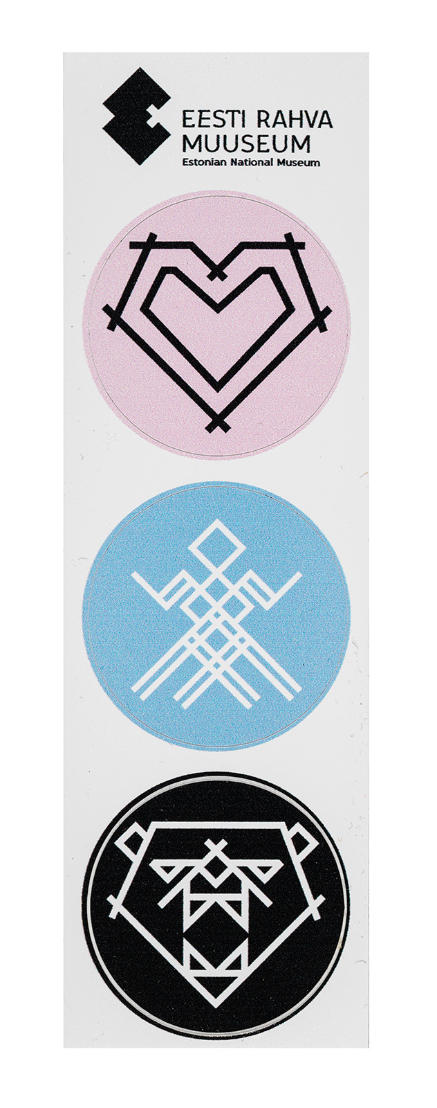Kolm ümmargust kleepsu 13 x 4 cm paberil. Sümbolid on pärit soome-ugri püsinäitusest “Uurali kaja”.