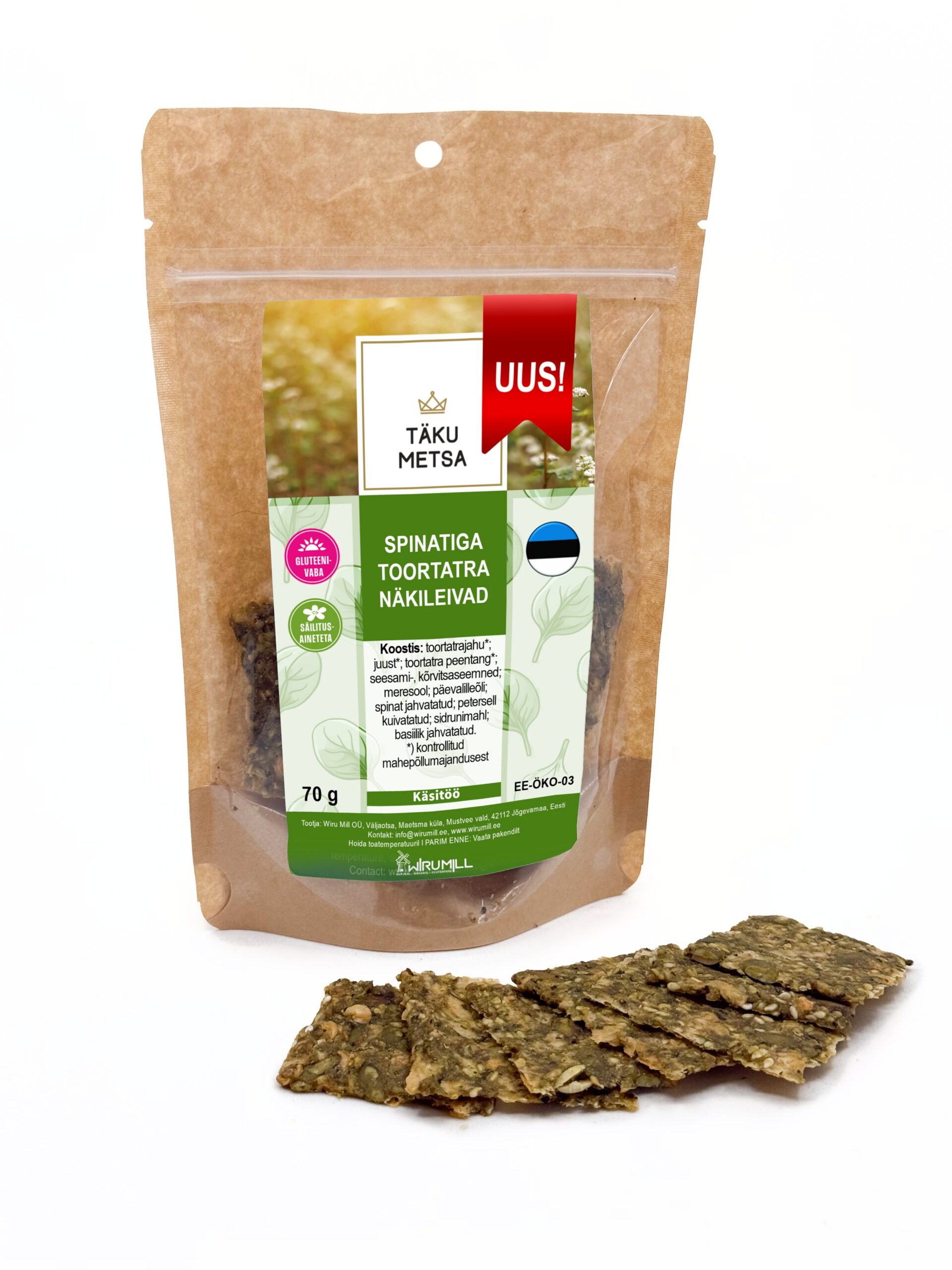 Koostis: toortatrajahu*, juust* , toortatratang*, seesamiseemned , kõrvitsaseemned, meresool, päevalilleõli, spinat (jahvatatud), petersell (kuivatatud), sidrunimahl, basiilik (jahvatatud).