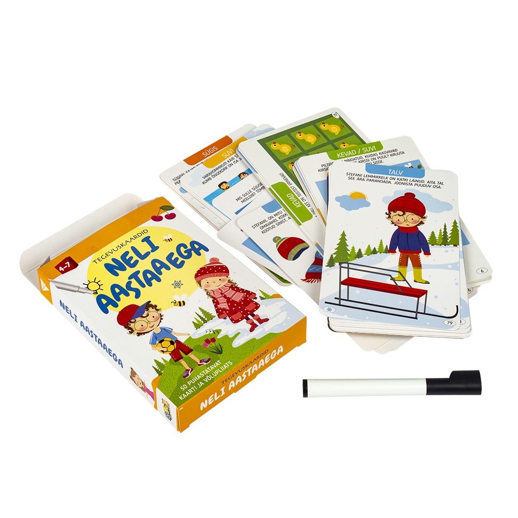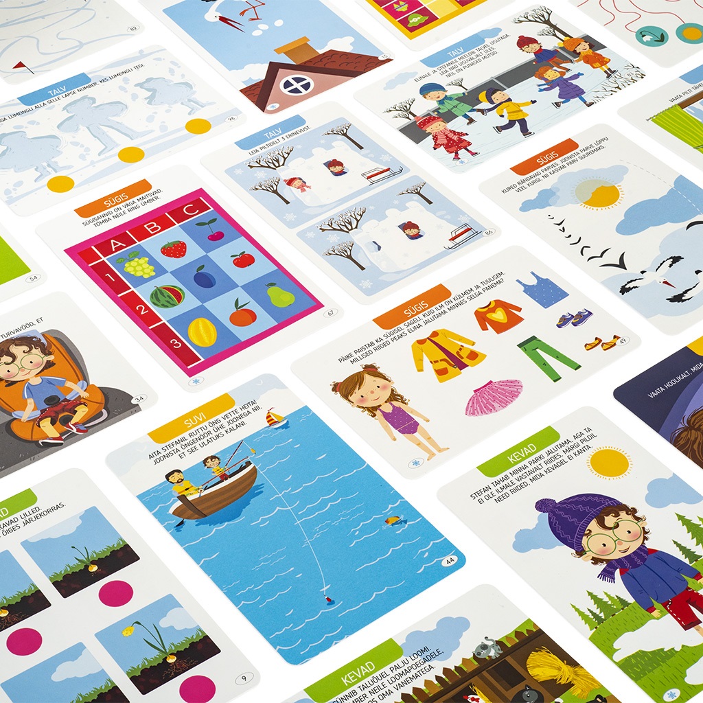 Mängida saab igal aastaajal. Eks ole? Elina ja Stefan leiavad lõbusat tegevust iga ilmaga. Nende kaartide abil õpivad lapsed paremini tundma nelja aastaaega, lahendama loogikaülesandeid, arendama tähelepanu ja mõtlemisvõimet.