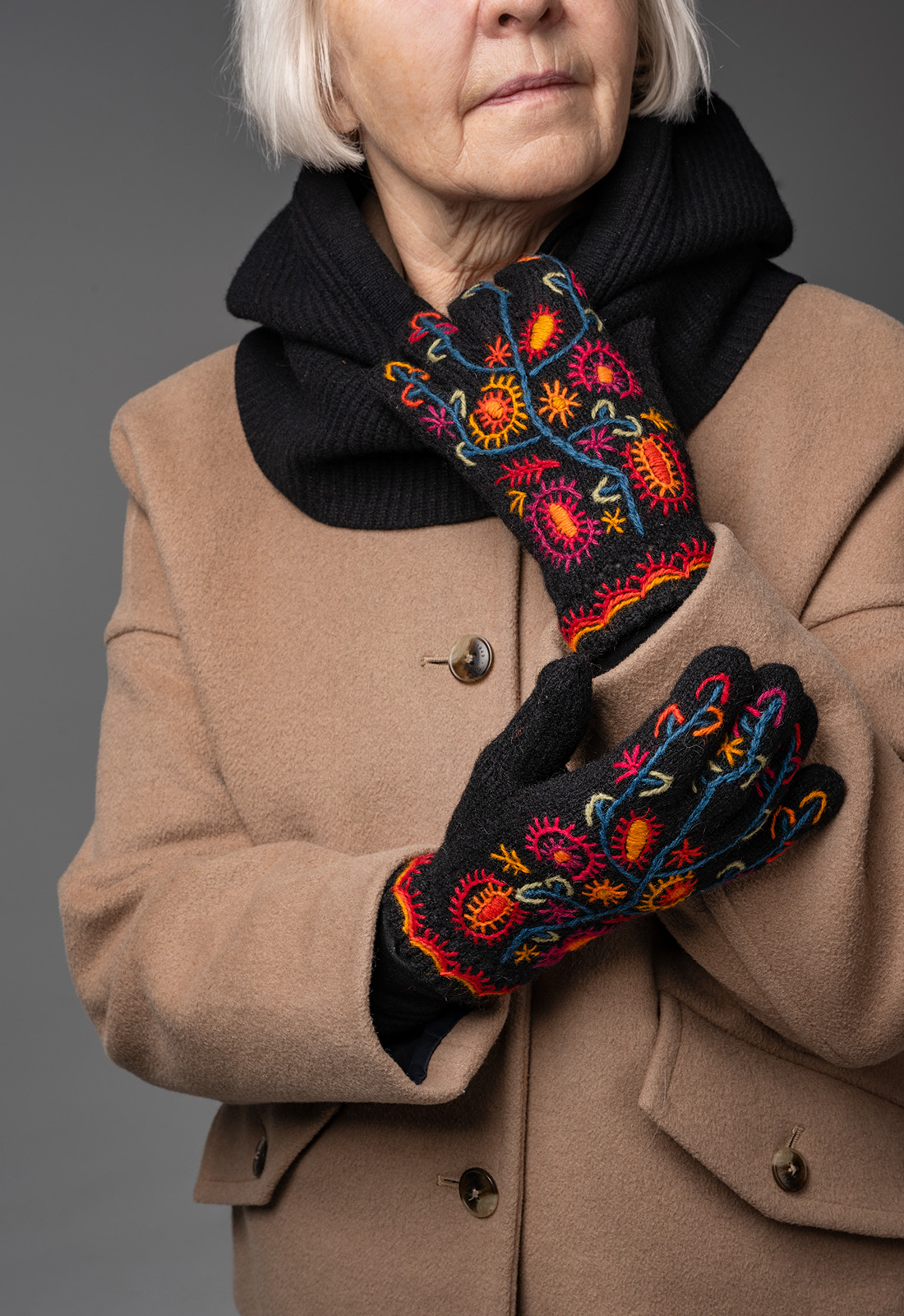 Käsitsi tikitud villaste sõrmkinnaste “Elupuu” muster on inspireeritud Eesti rahvarõivaste Paistu põlle tikandist.