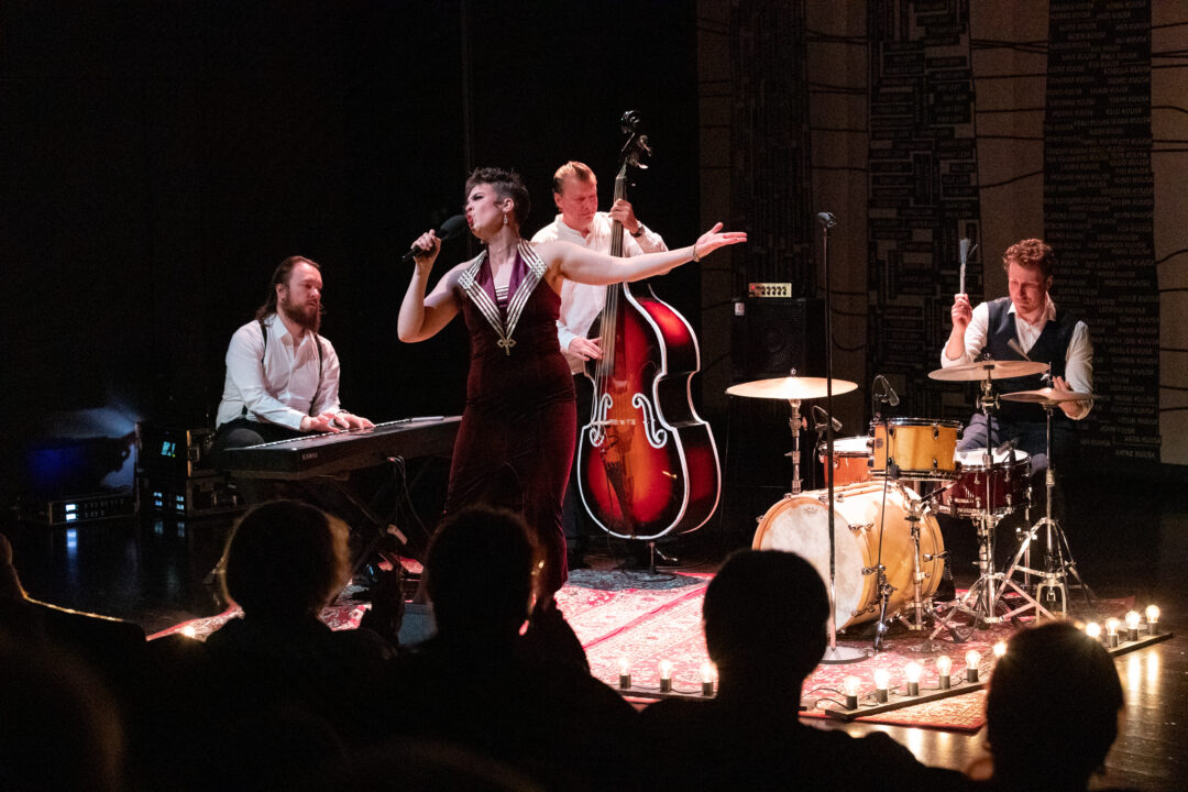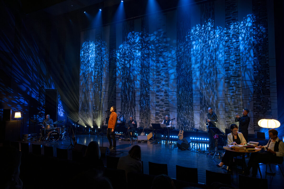 Saali seinas asuv hiigelvaip „Käbid ja kännud“ on võimalik üles tõsta, avades lavale ainulaadse vaate veesilmale ja ümbritsevale loodusele – efektne taust nii kontsertidele kui esinemistele.