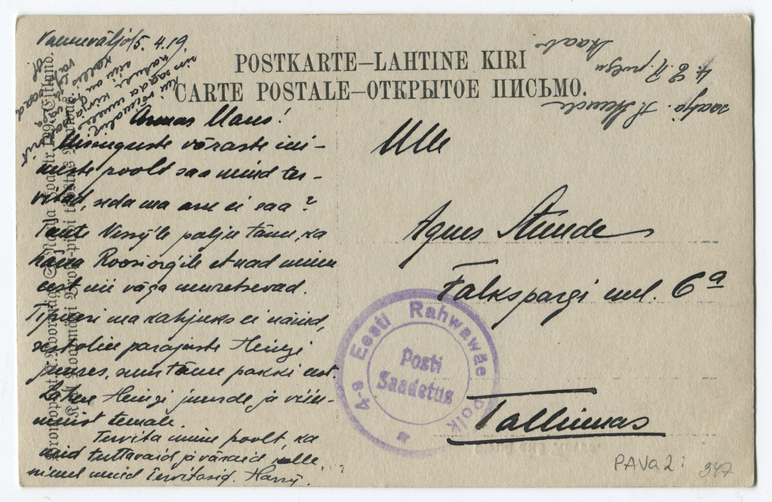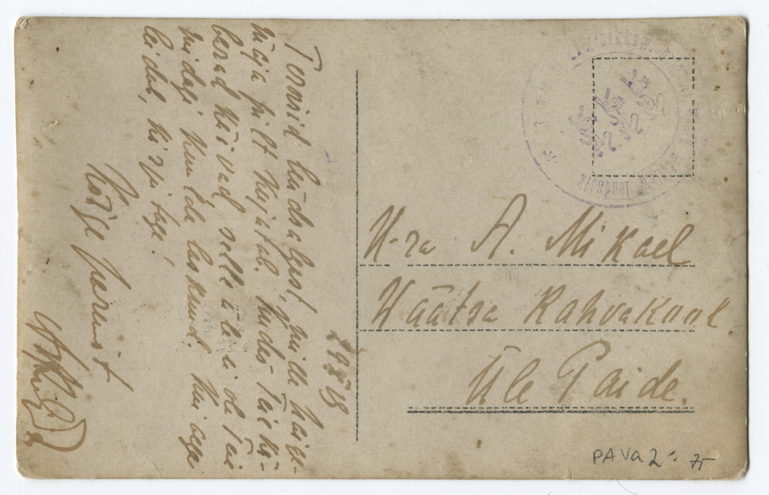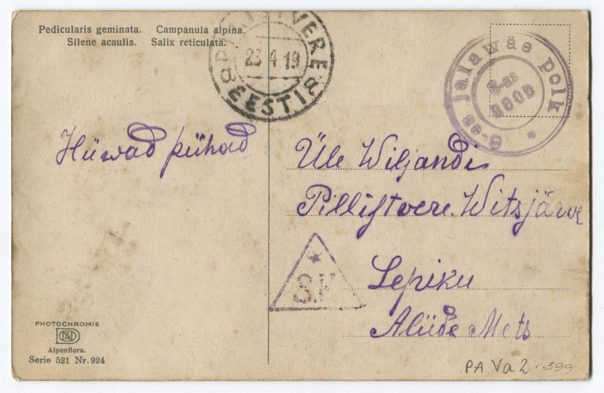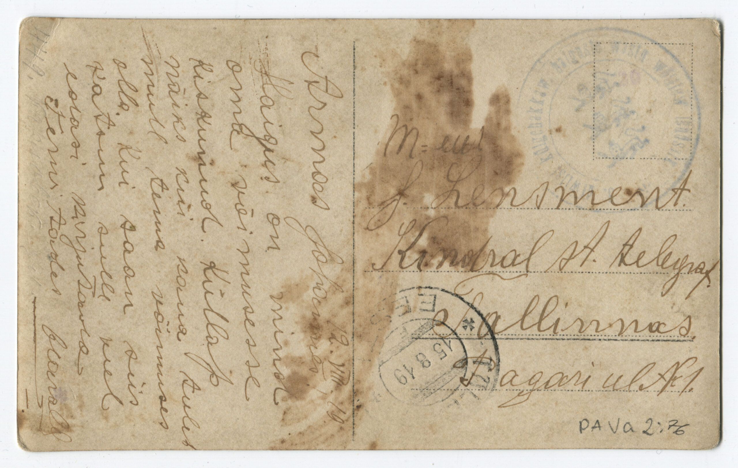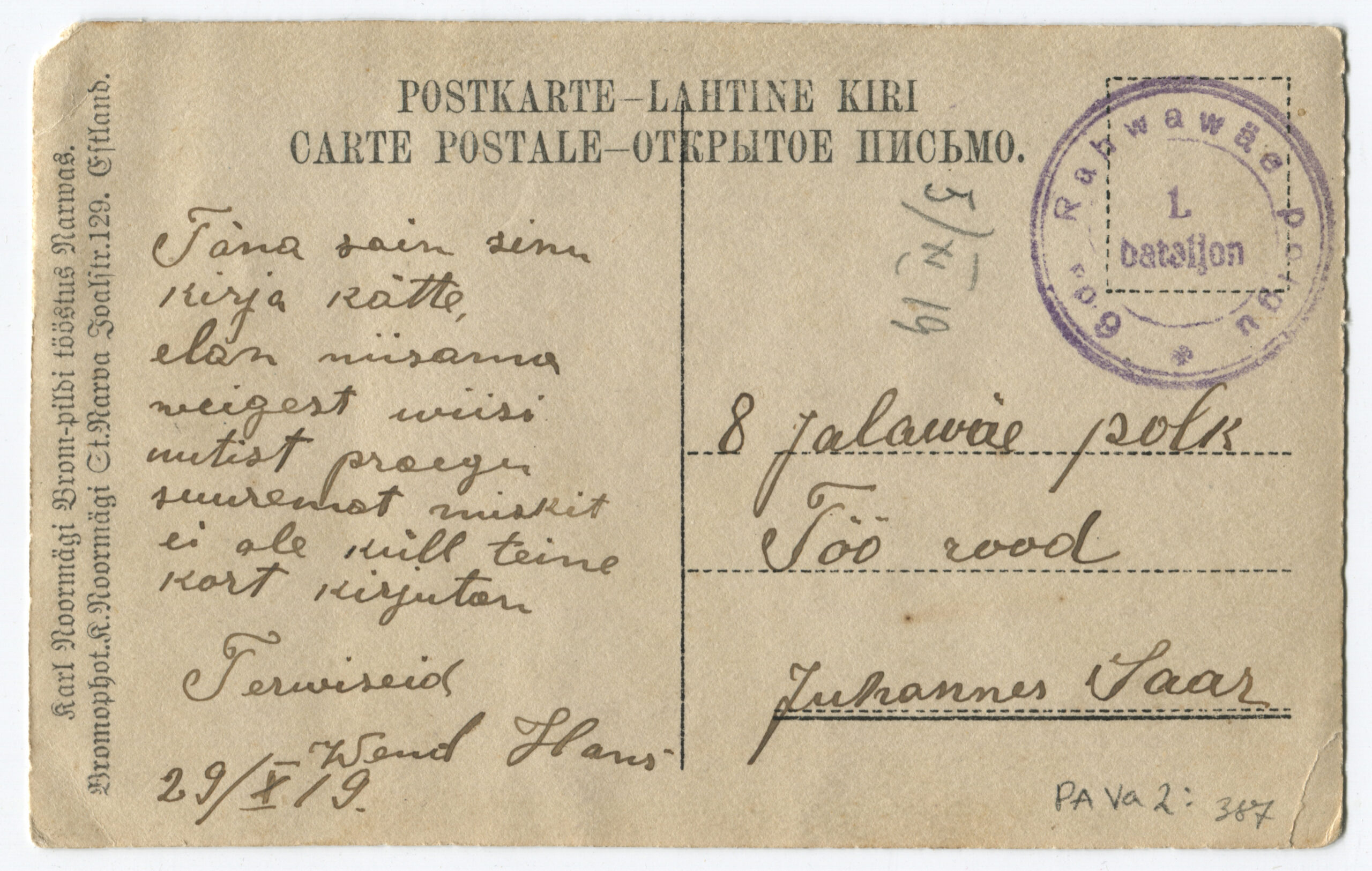 Rahvahulk Estonia teatrimaja ees Asutava Kogu avamise päeval, 23.04.1919. Foto: I. & P. Parikas Tallinnas.Kiri on saadetud 6. jalaväepolgu sidekomando teenistujale 19.02.1920. 6. jalaväepolgu sidekomando ülemaks määrati 20.02.1919 leitnant Aleksander Kulbusch (Kulgver). 23.10.1919 sai ta alamkapteni auastme.