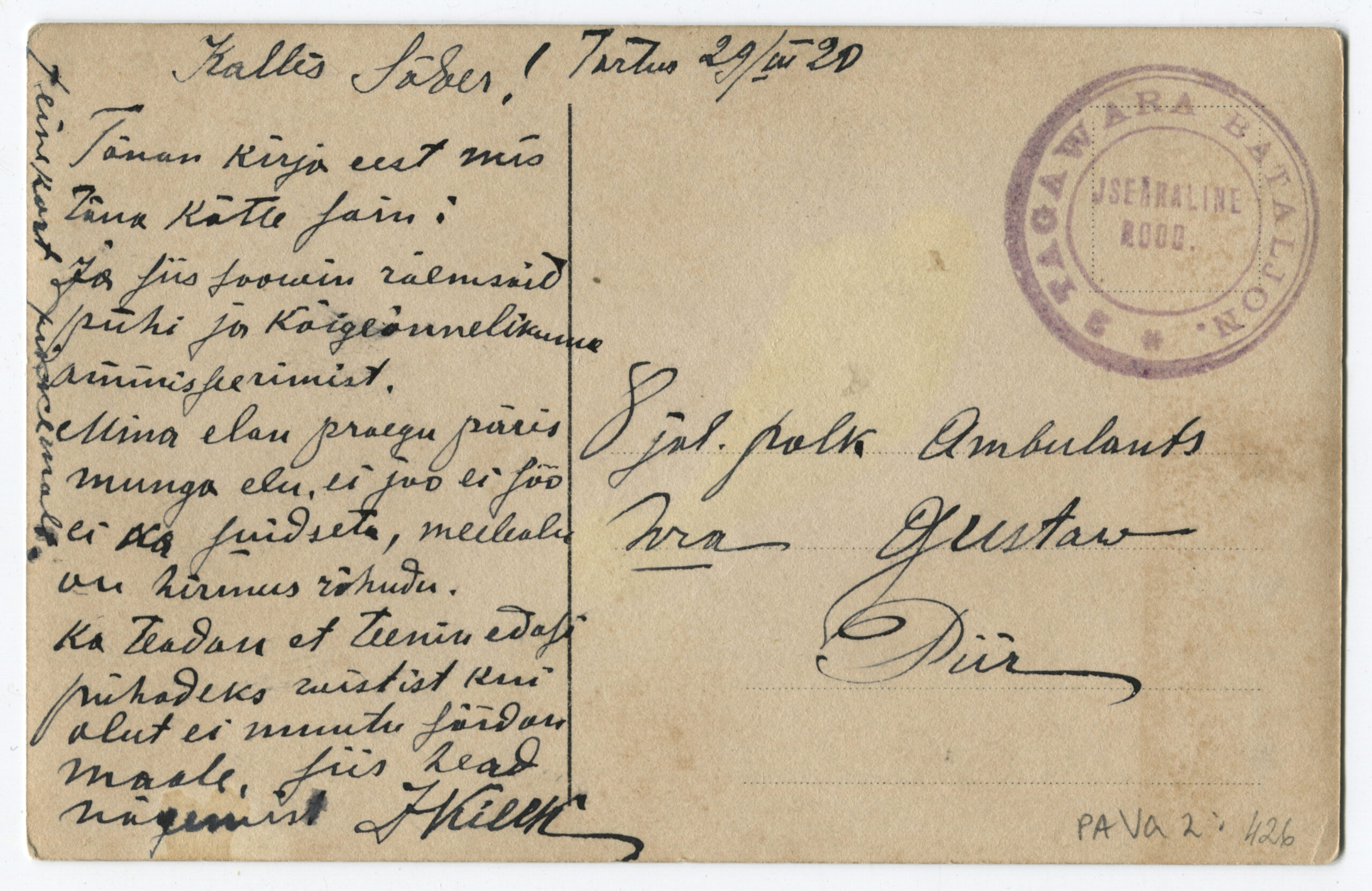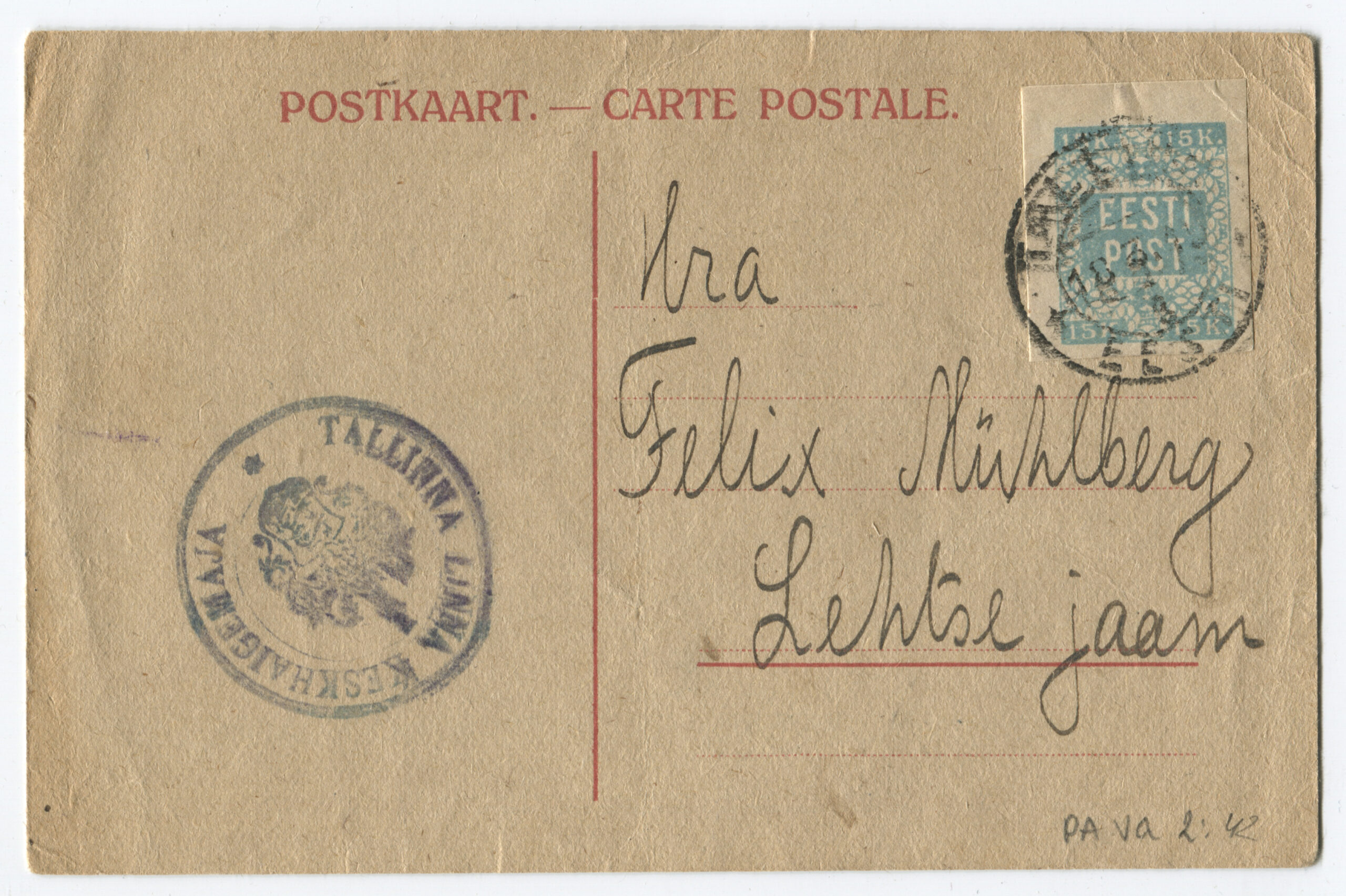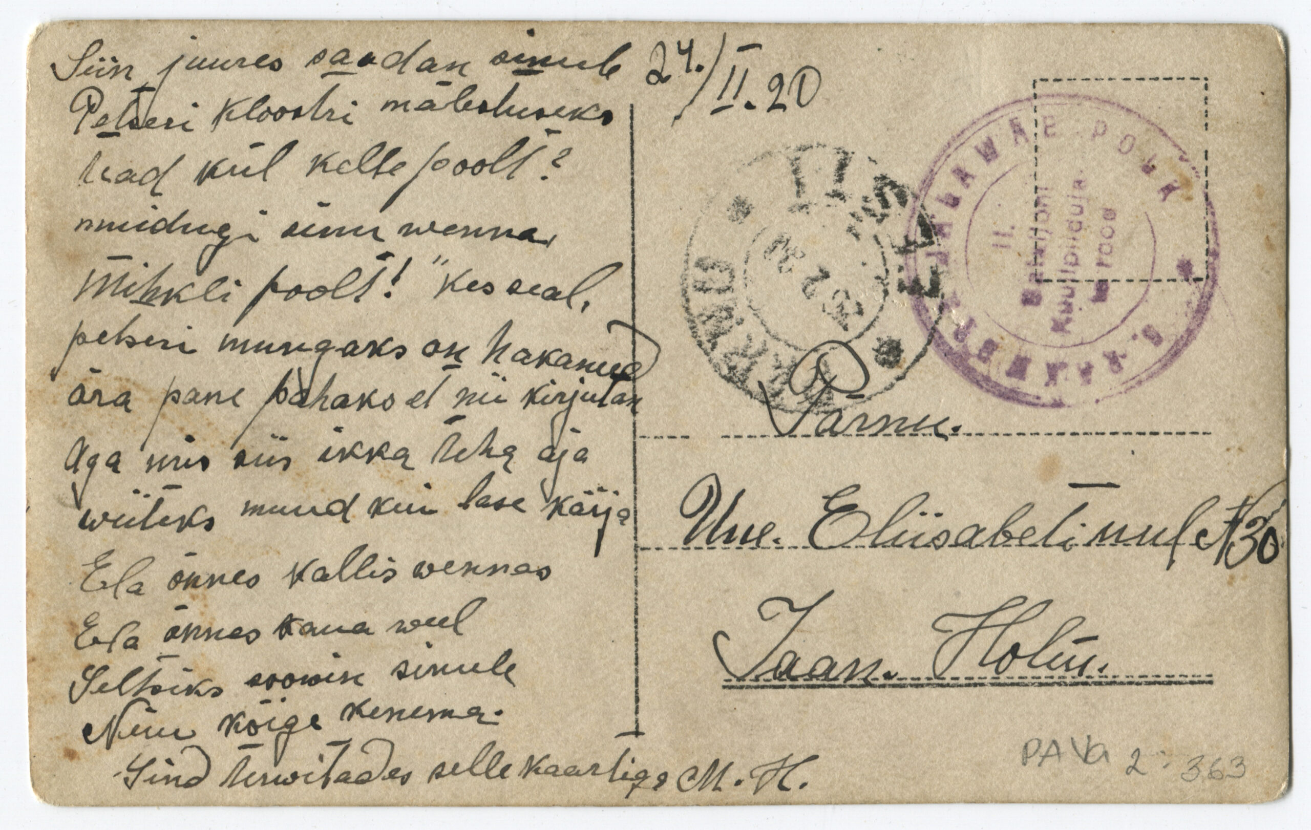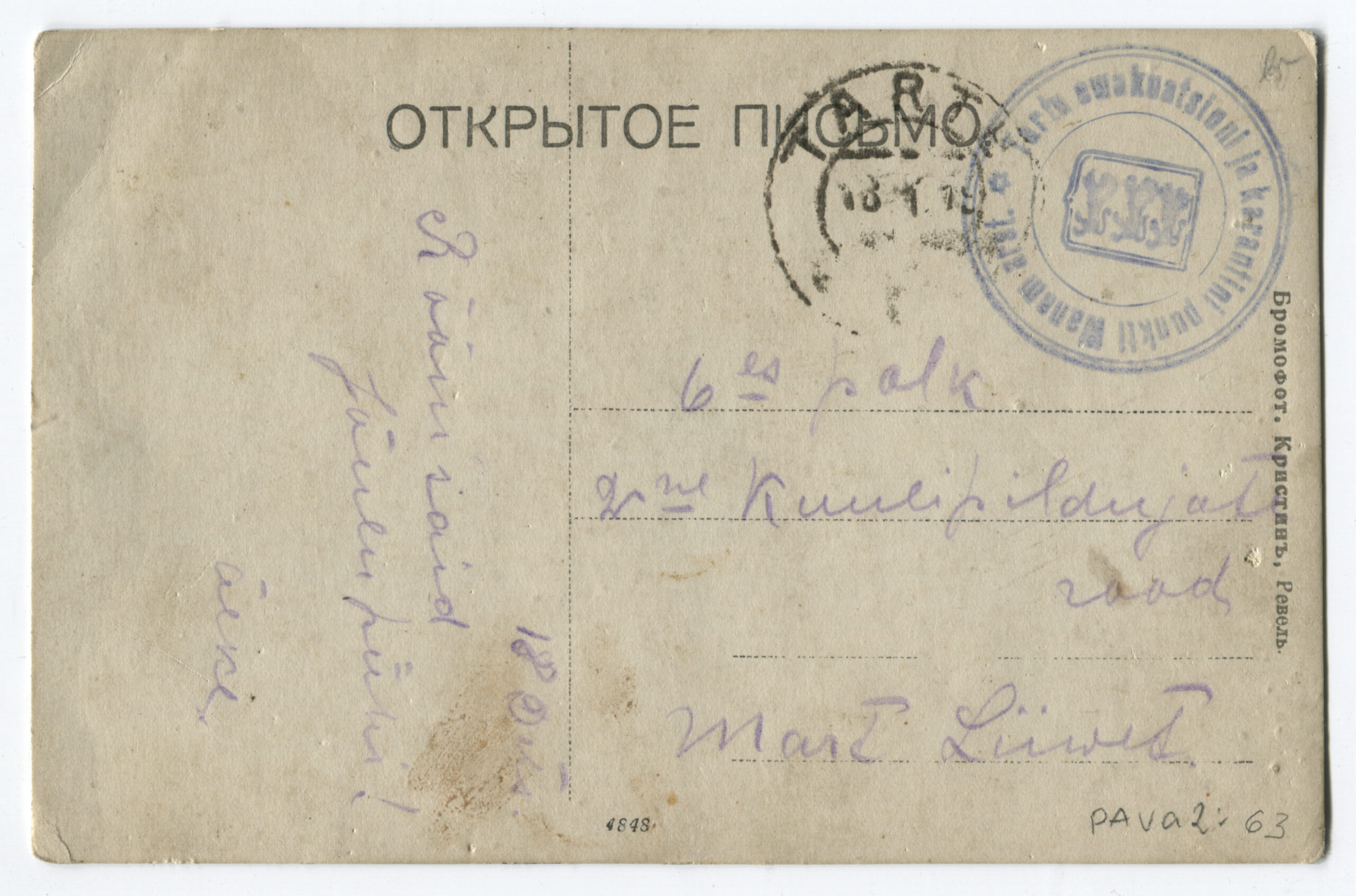 Rahvahulk Estonia teatrimaja ees Asutava Kogu avamise päeval, 23.04.1919. Foto: I. & P. Parikas Tallinnas.Kiri on saadetud 6. jalaväepolgu sidekomando teenistujale 19.02.1920. 6. jalaväepolgu sidekomando ülemaks määrati 20.02.1919 leitnant Aleksander Kulbusch (Kulgver). 23.10.1919 sai ta alamkapteni auastme.