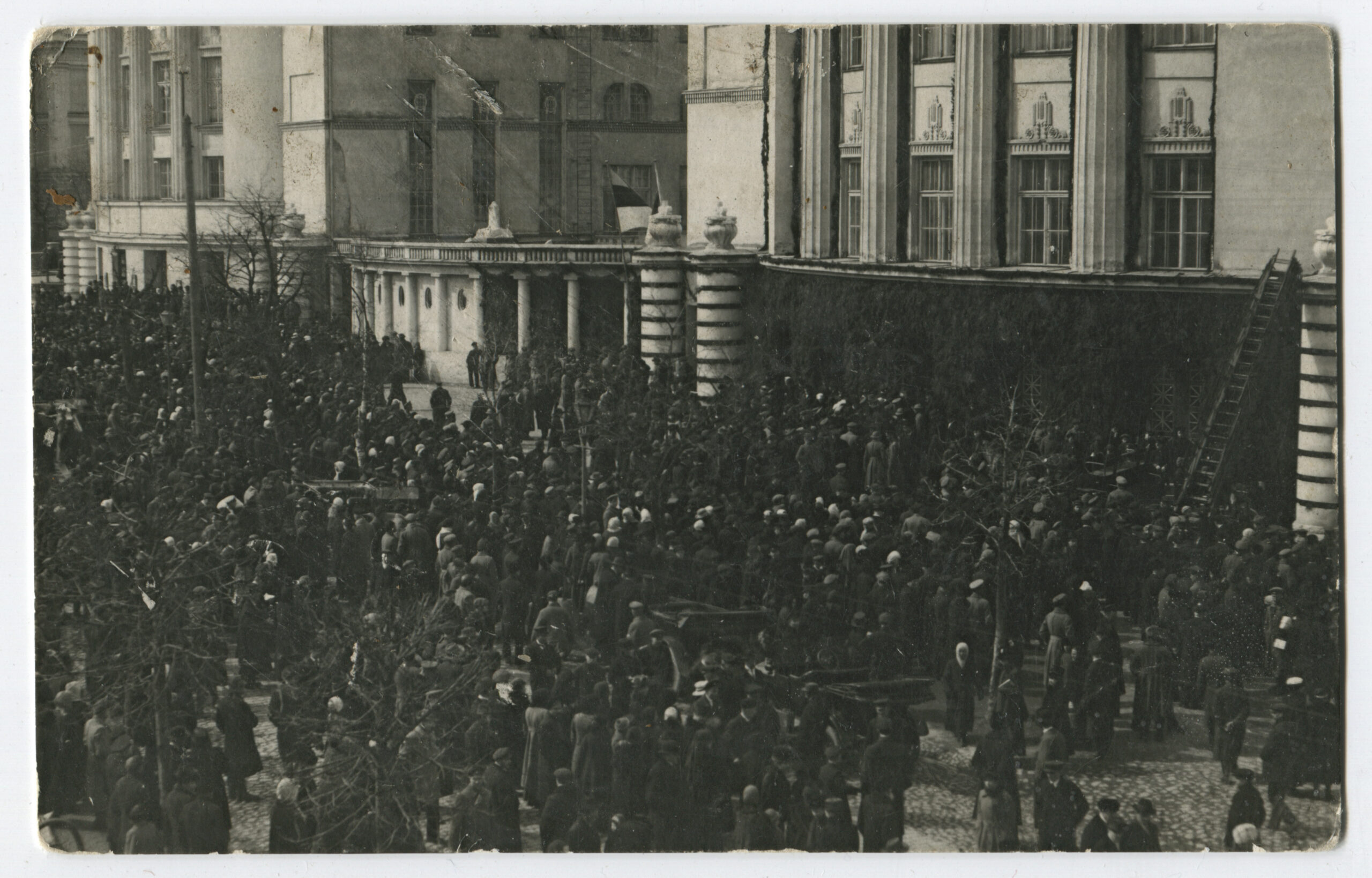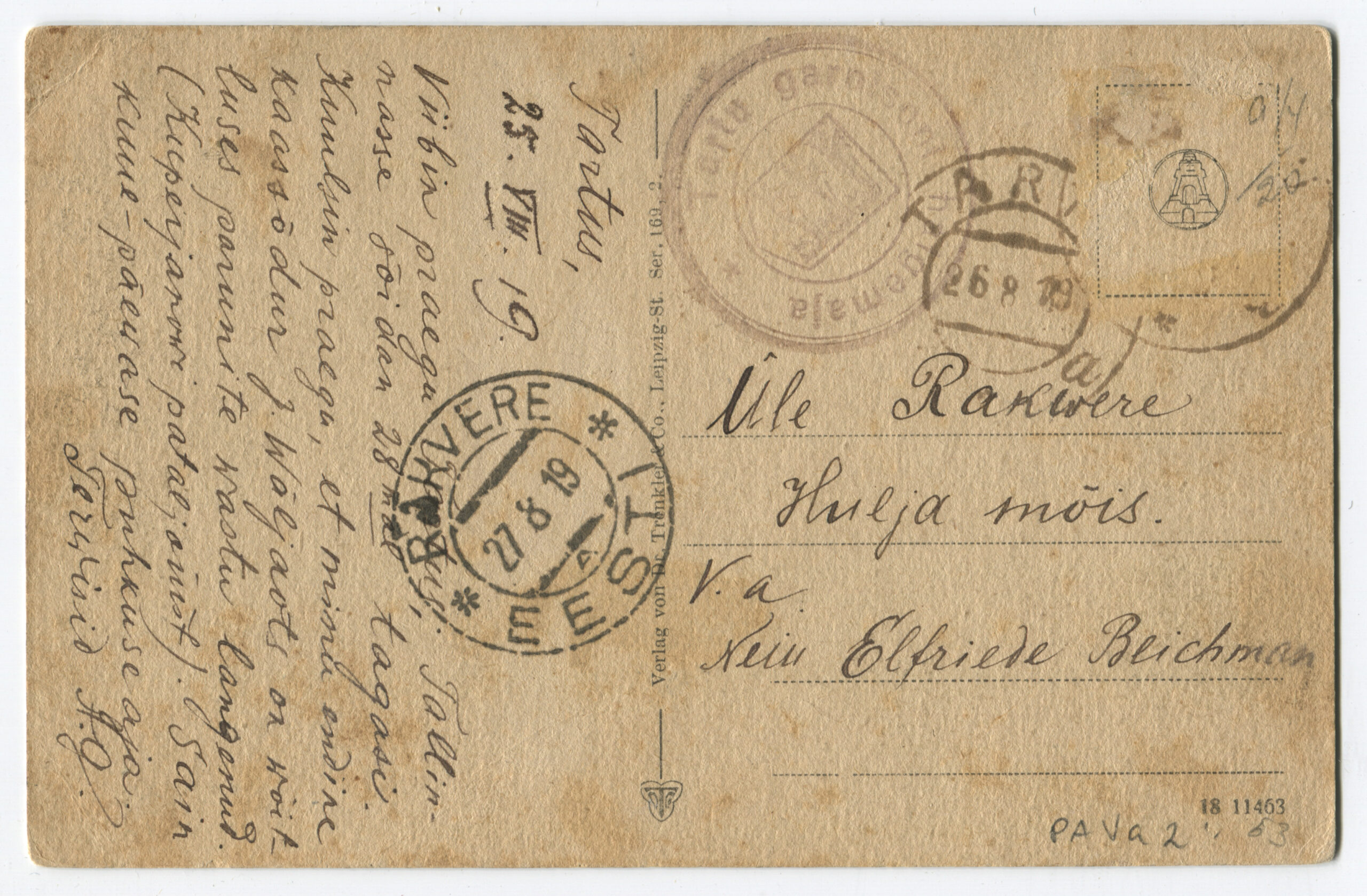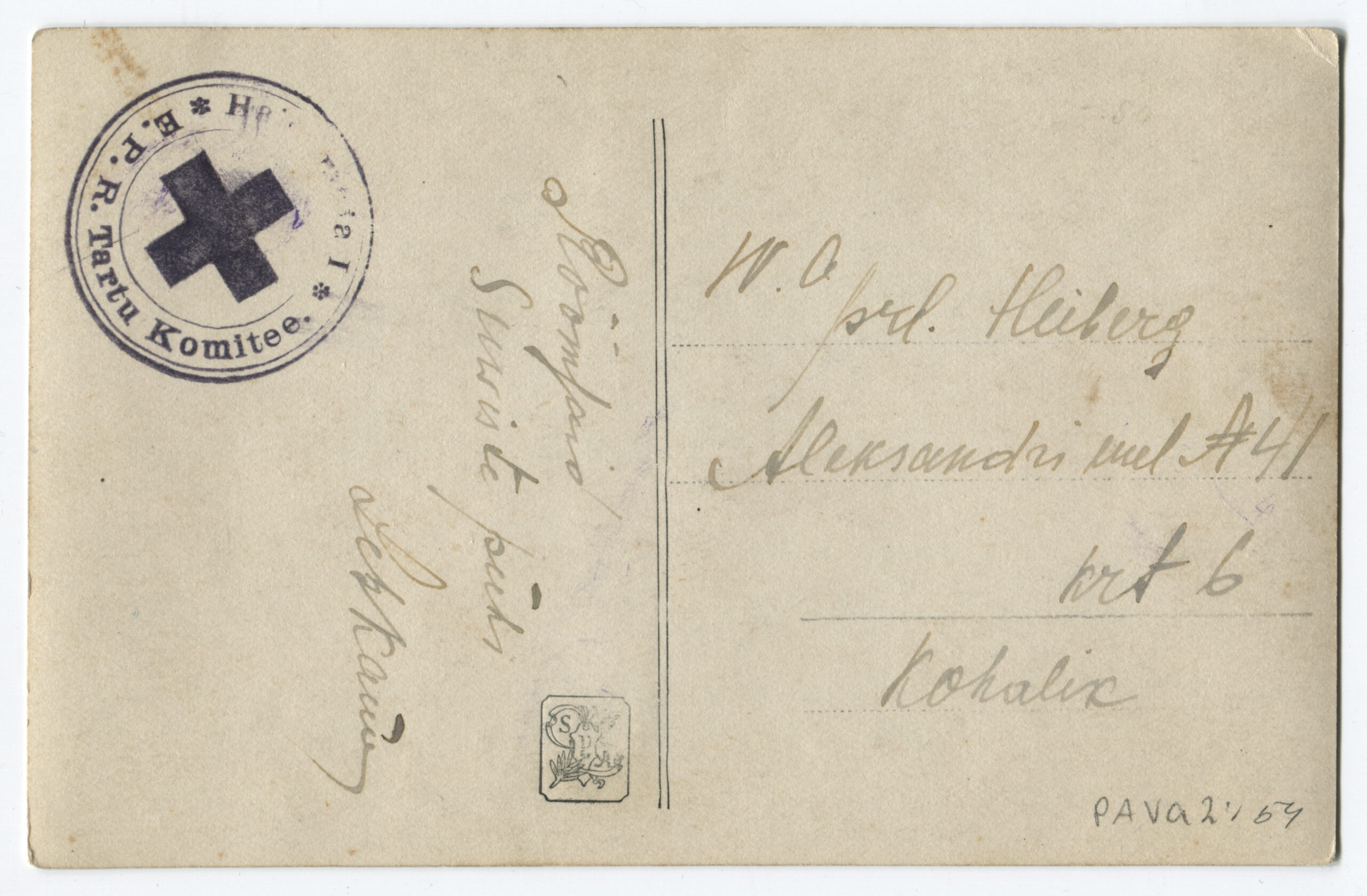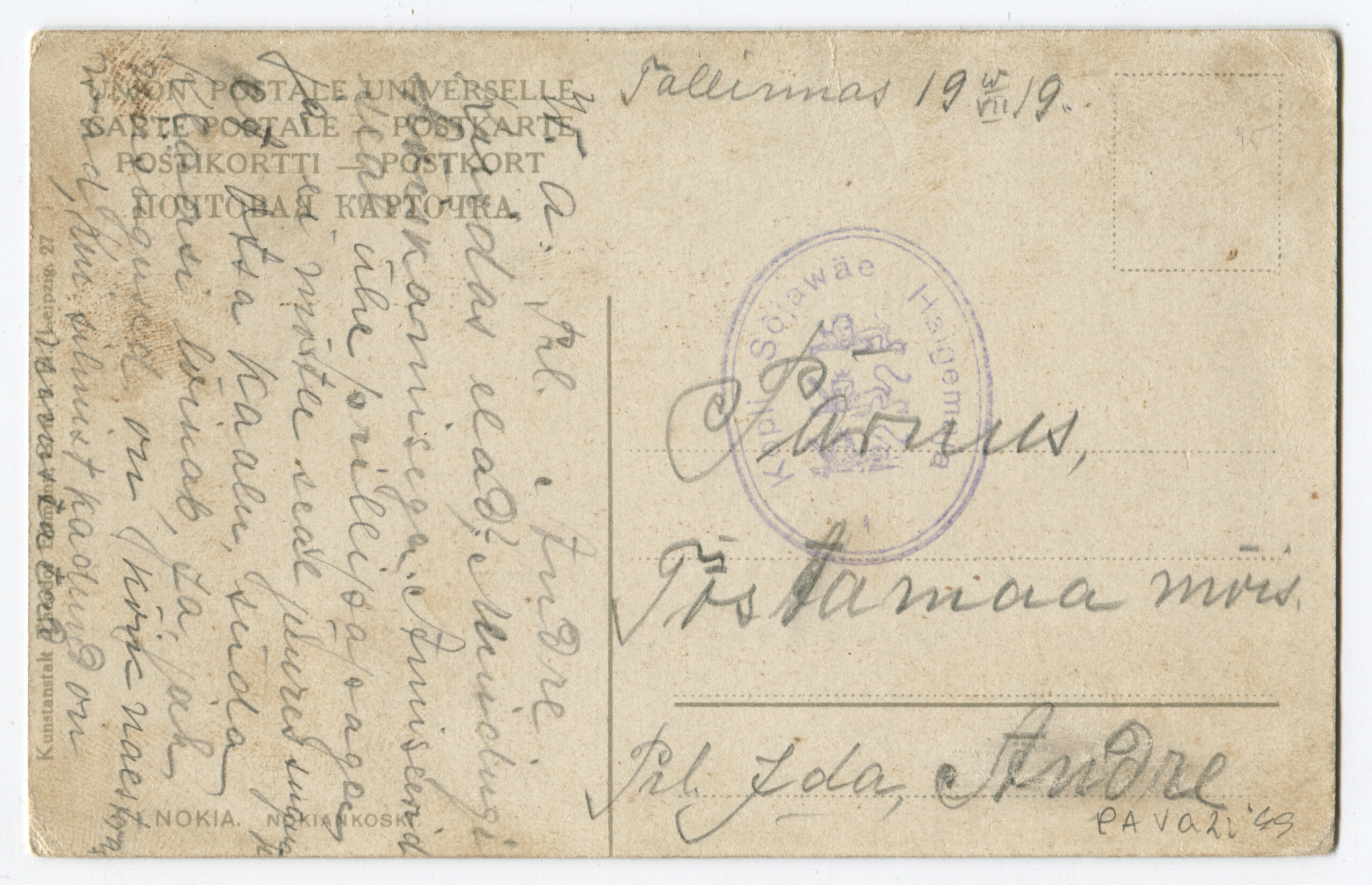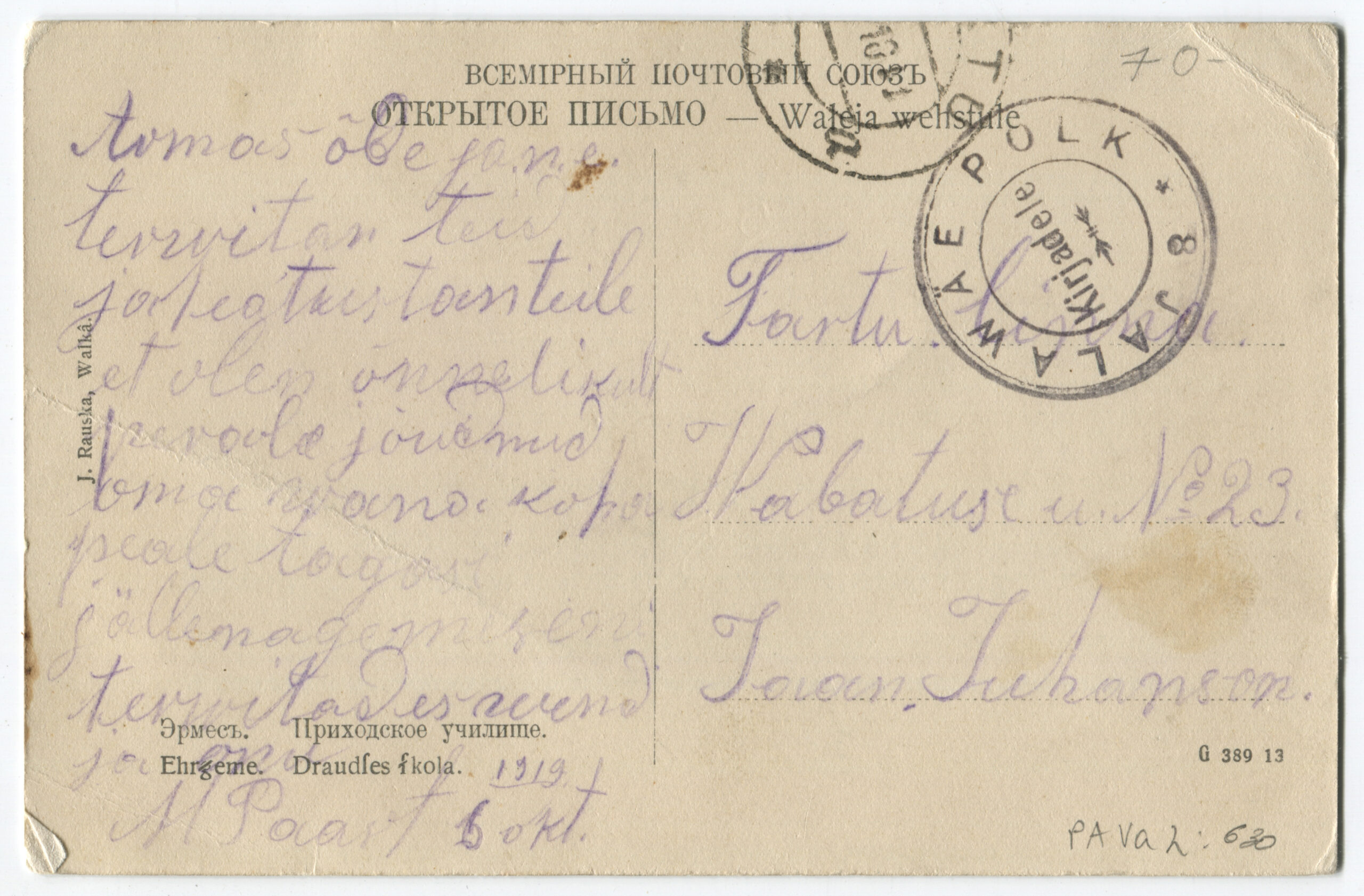 Rahvahulk Estonia teatrimaja ees Asutava Kogu avamise päeval, 23.04.1919. Foto: I. & P. Parikas Tallinnas.Kiri on saadetud 6. jalaväepolgu sidekomando teenistujale 19.02.1920. 6. jalaväepolgu sidekomando ülemaks määrati 20.02.1919 leitnant Aleksander Kulbusch (Kulgver). 23.10.1919 sai ta alamkapteni auastme.