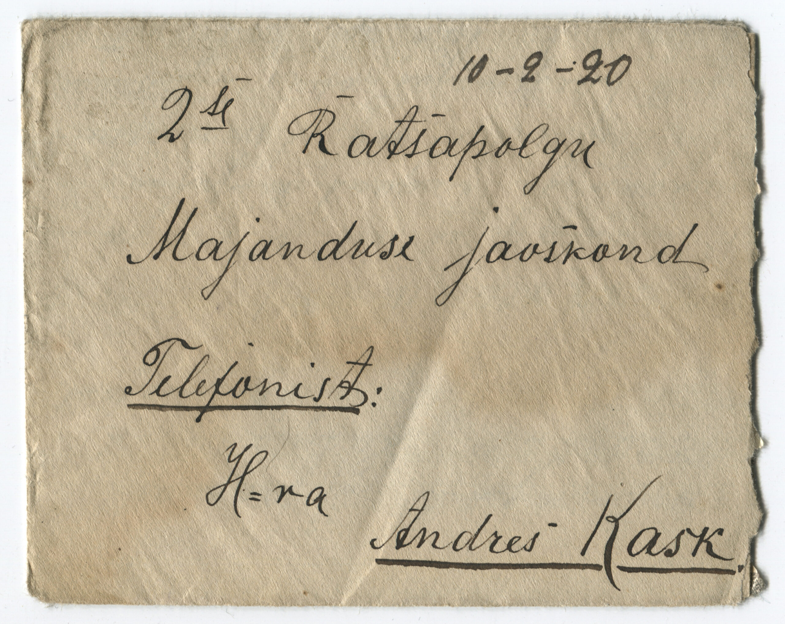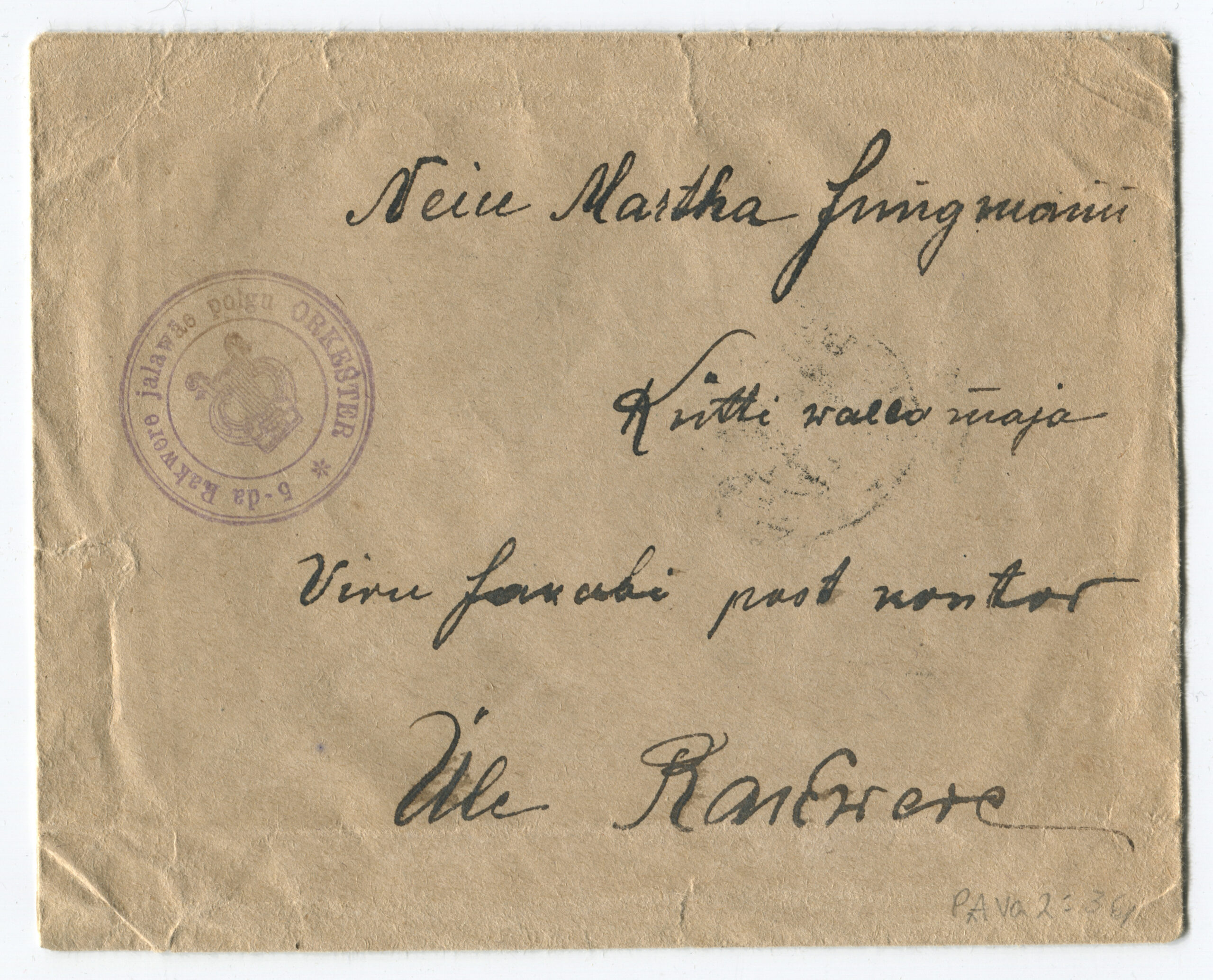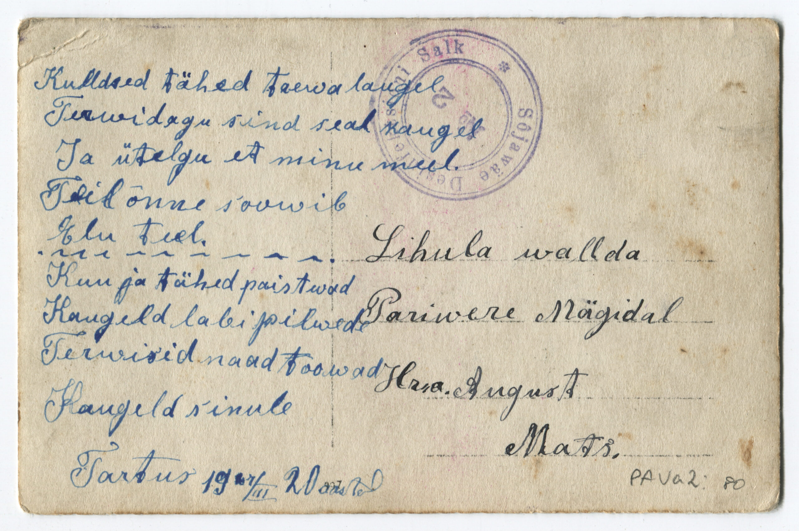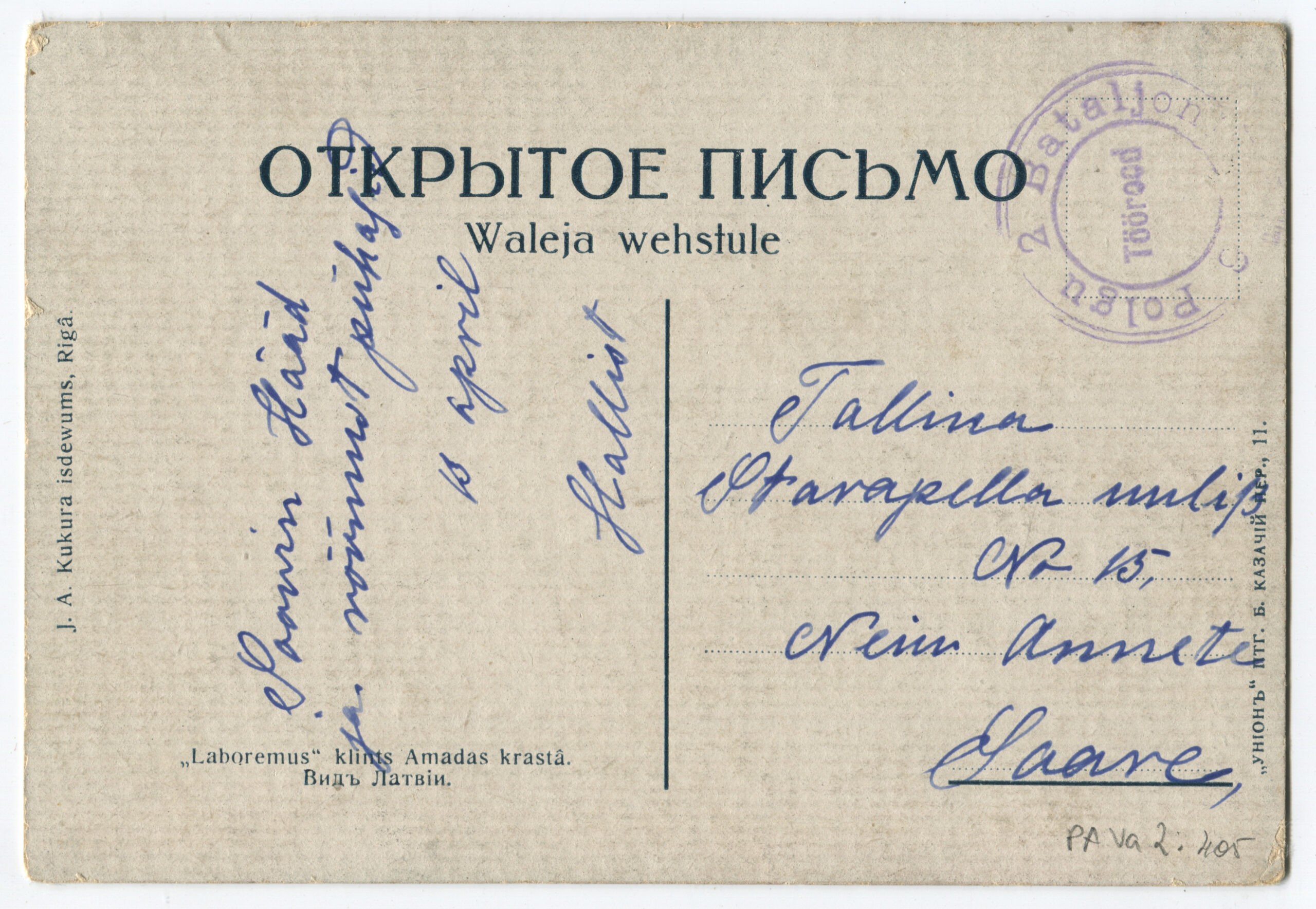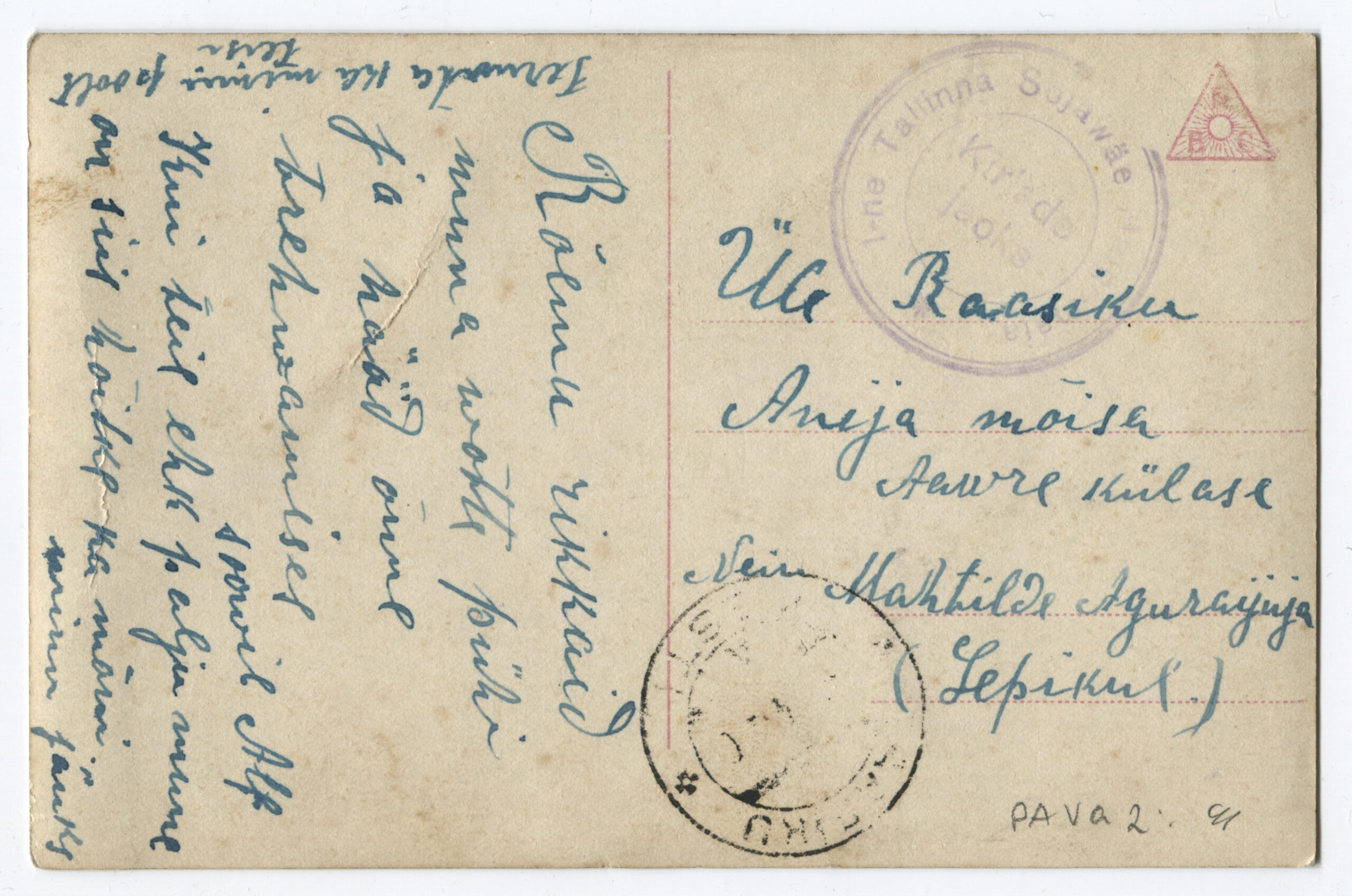 Rahvahulk Estonia teatrimaja ees Asutava Kogu avamise päeval, 23.04.1919. Foto: I. & P. Parikas Tallinnas.Kiri on saadetud 6. jalaväepolgu sidekomando teenistujale 19.02.1920. 6. jalaväepolgu sidekomando ülemaks määrati 20.02.1919 leitnant Aleksander Kulbusch (Kulgver). 23.10.1919 sai ta alamkapteni auastme.