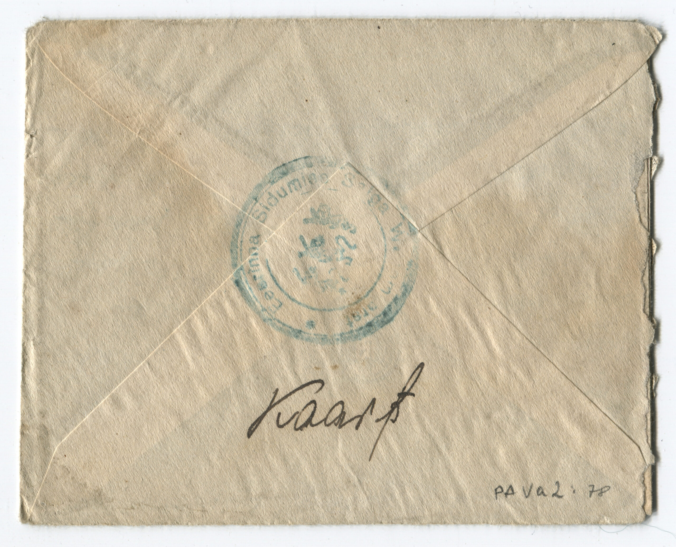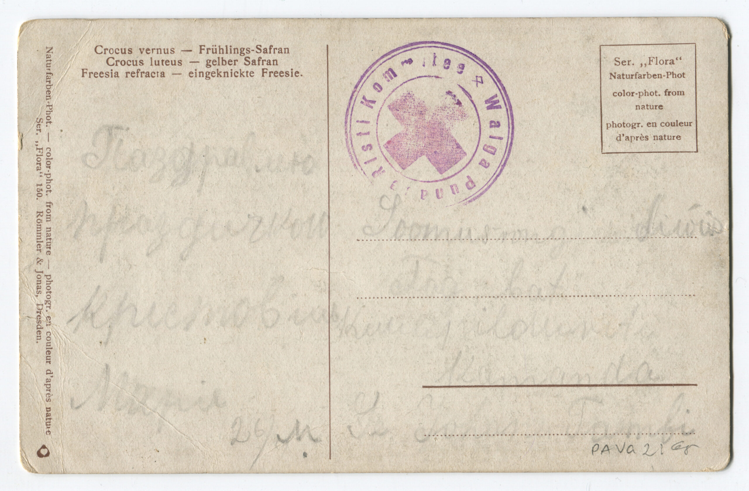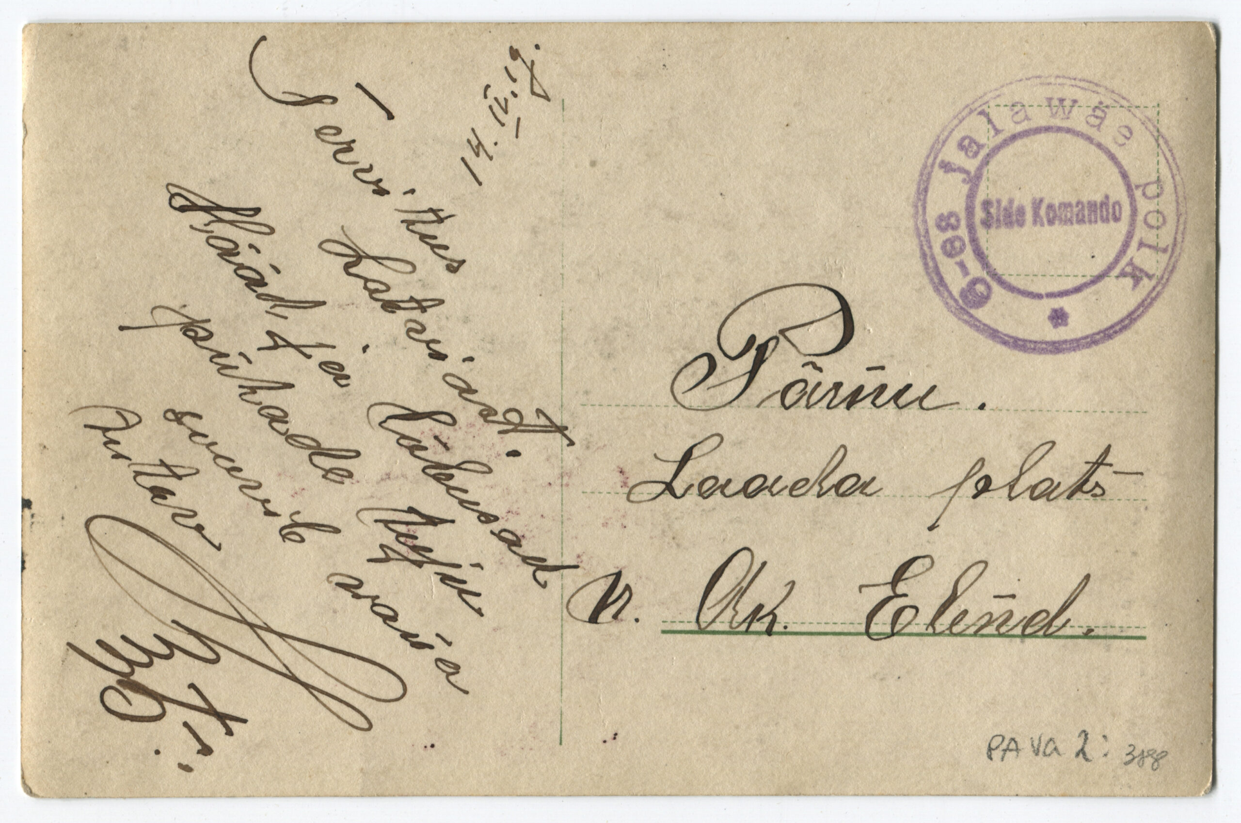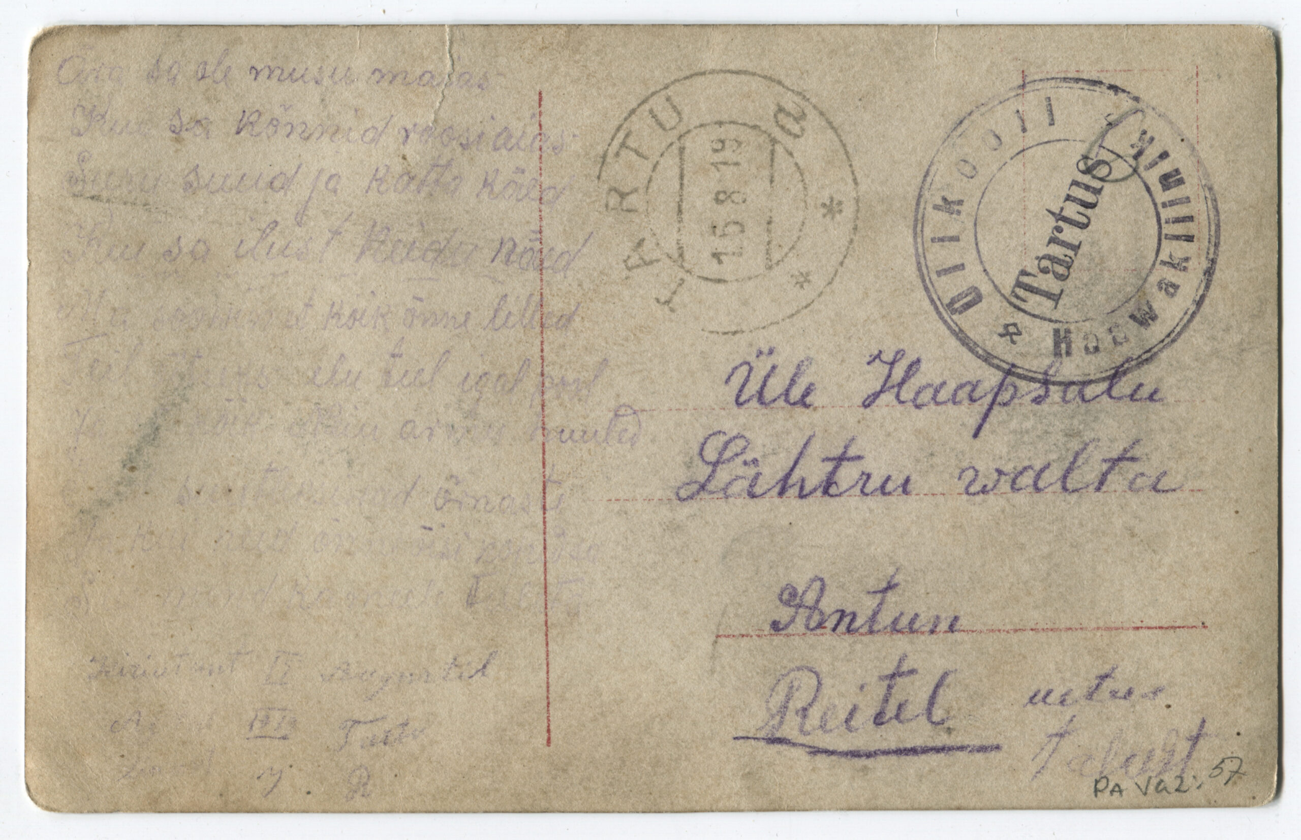 Rahvahulk Estonia teatrimaja ees Asutava Kogu avamise päeval, 23.04.1919. Foto: I. & P. Parikas Tallinnas.Kiri on saadetud 6. jalaväepolgu sidekomando teenistujale 19.02.1920. 6. jalaväepolgu sidekomando ülemaks määrati 20.02.1919 leitnant Aleksander Kulbusch (Kulgver). 23.10.1919 sai ta alamkapteni auastme.