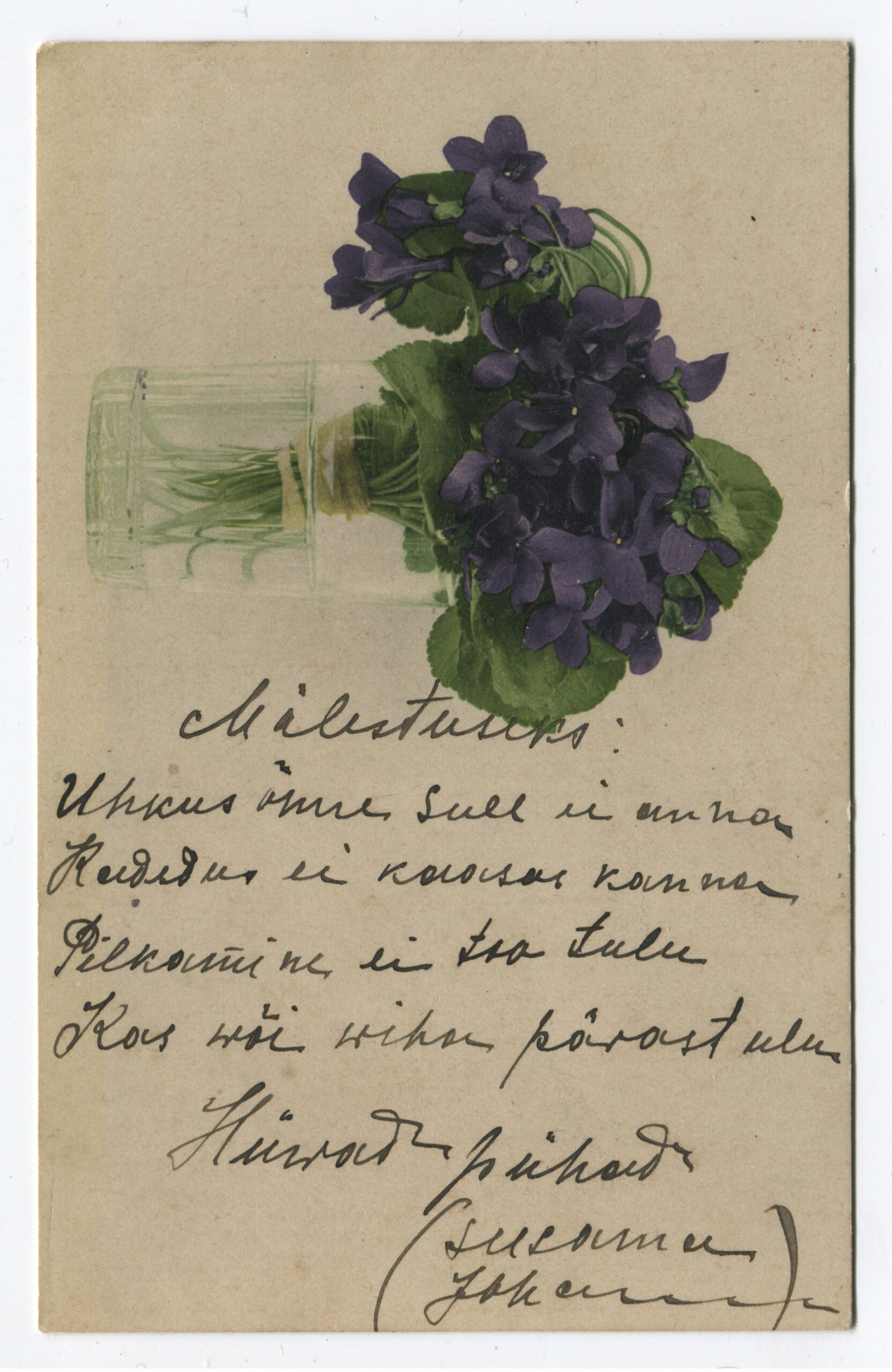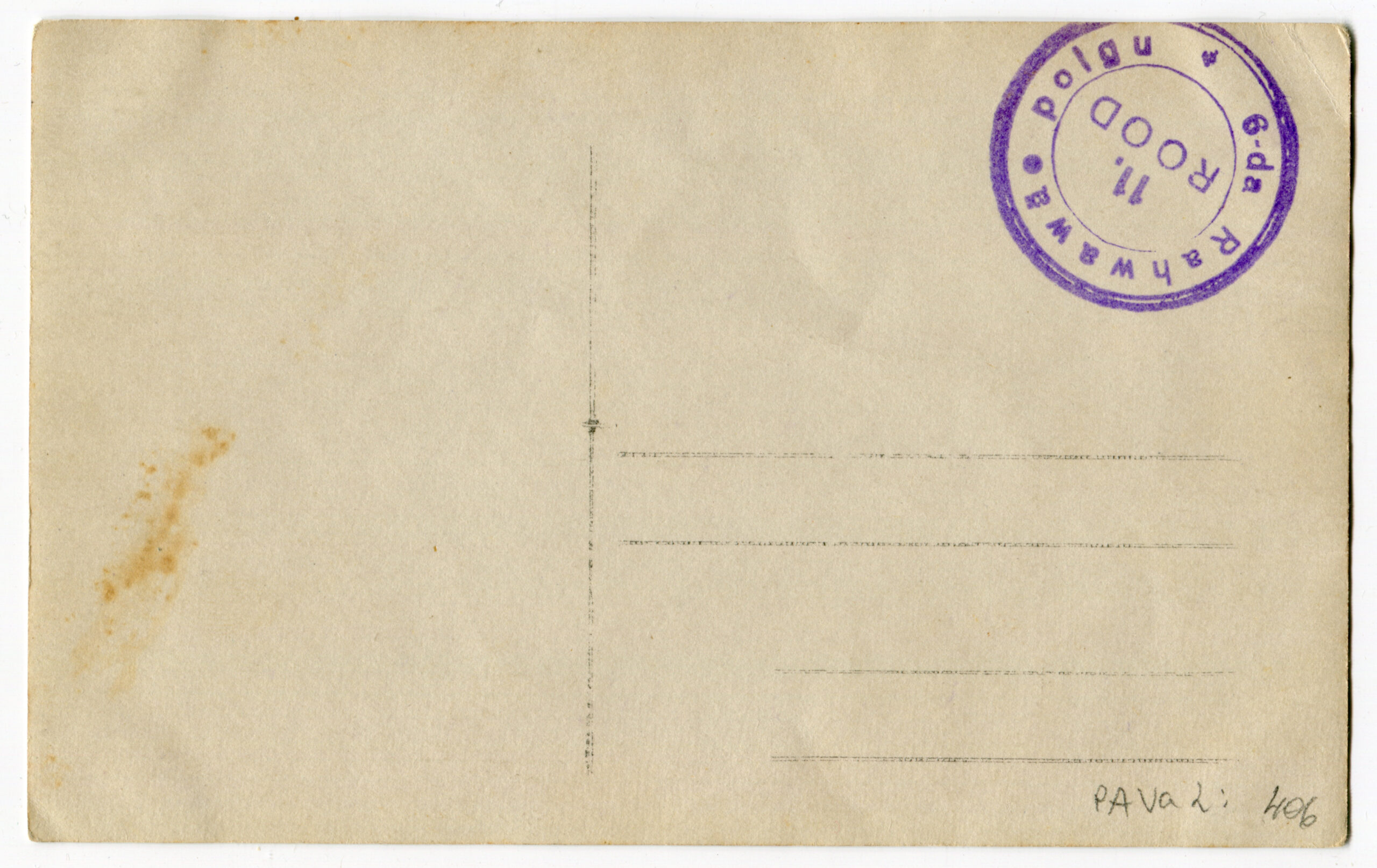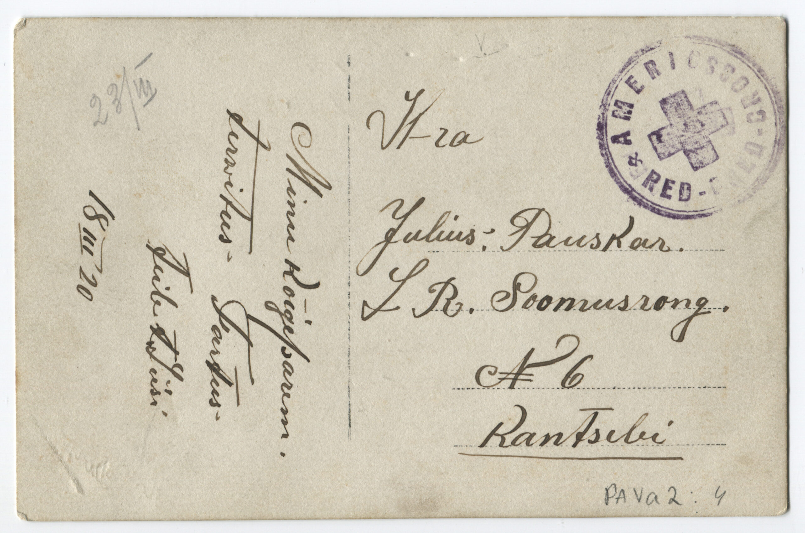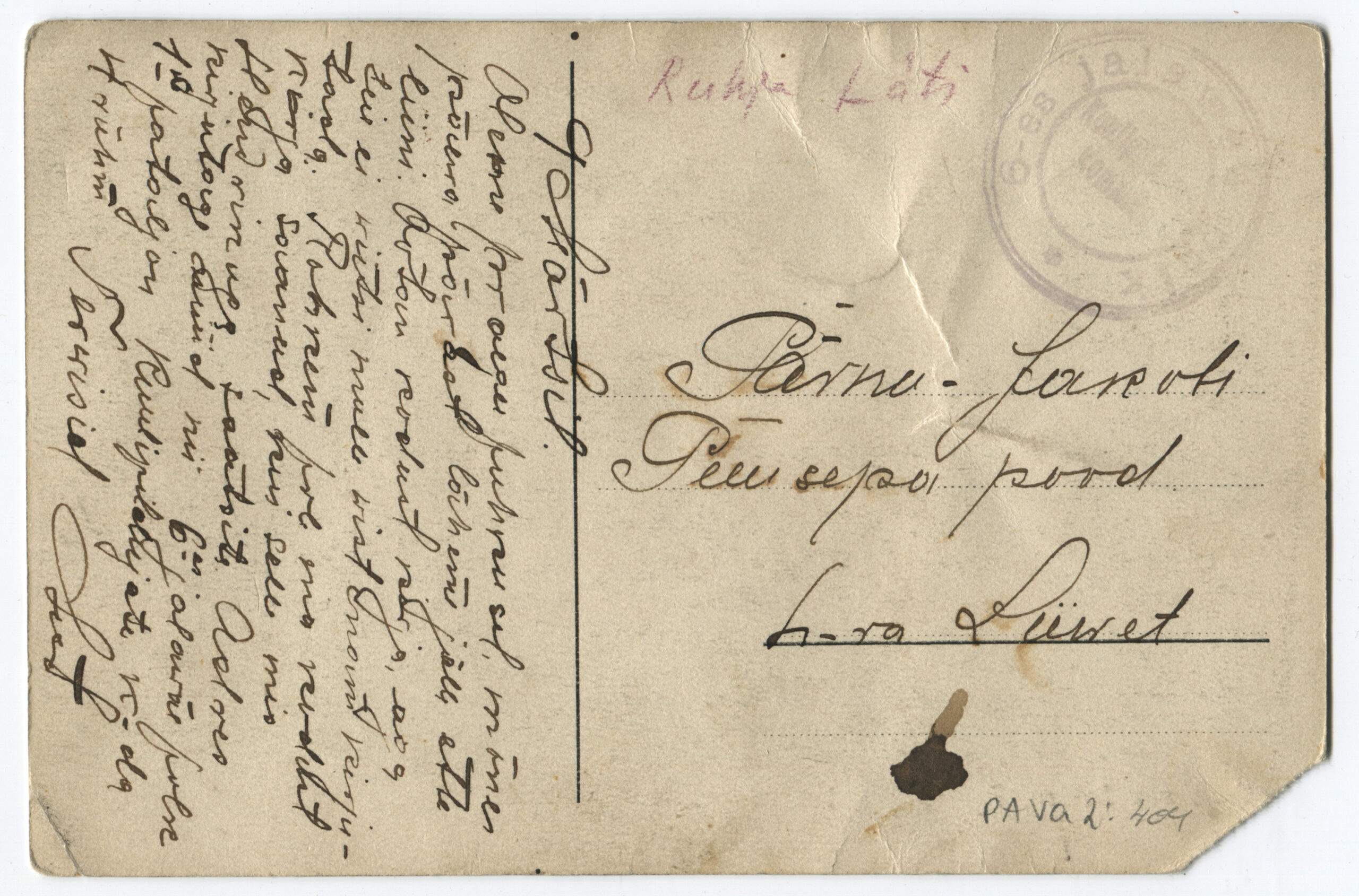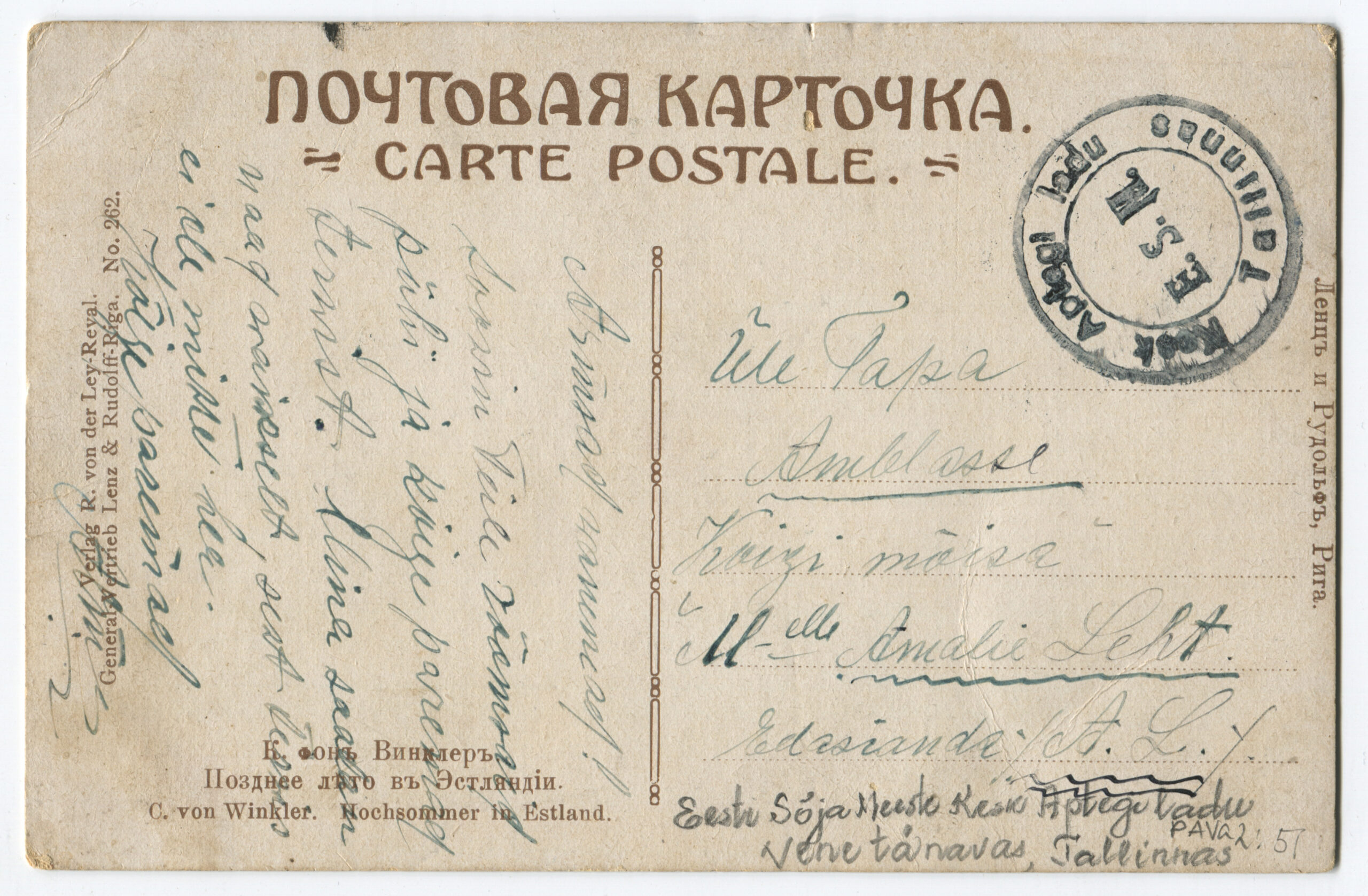 Rahvahulk Estonia teatrimaja ees Asutava Kogu avamise päeval, 23.04.1919. Foto: I. & P. Parikas Tallinnas.Kiri on saadetud 6. jalaväepolgu sidekomando teenistujale 19.02.1920. 6. jalaväepolgu sidekomando ülemaks määrati 20.02.1919 leitnant Aleksander Kulbusch (Kulgver). 23.10.1919 sai ta alamkapteni auastme.