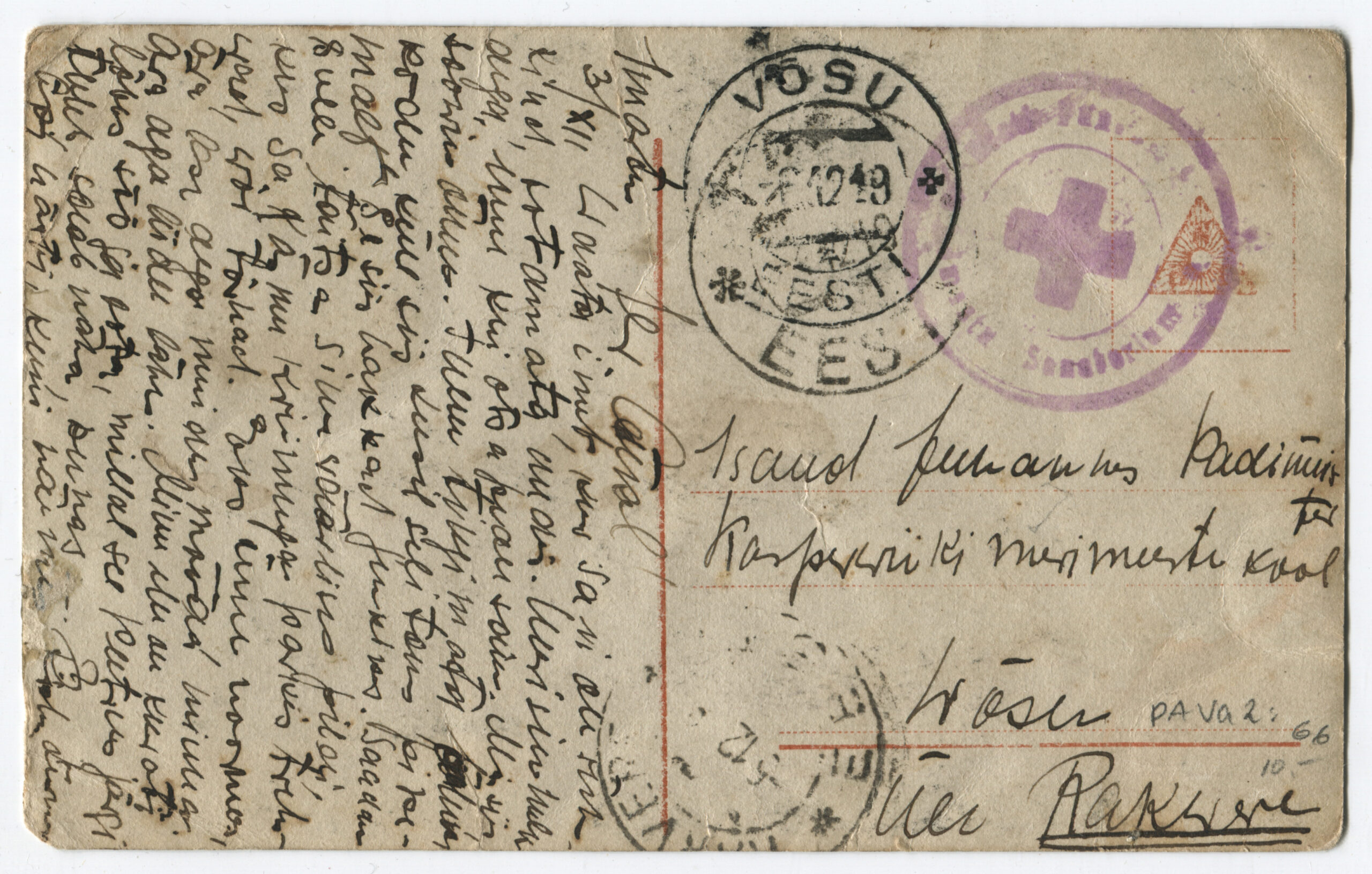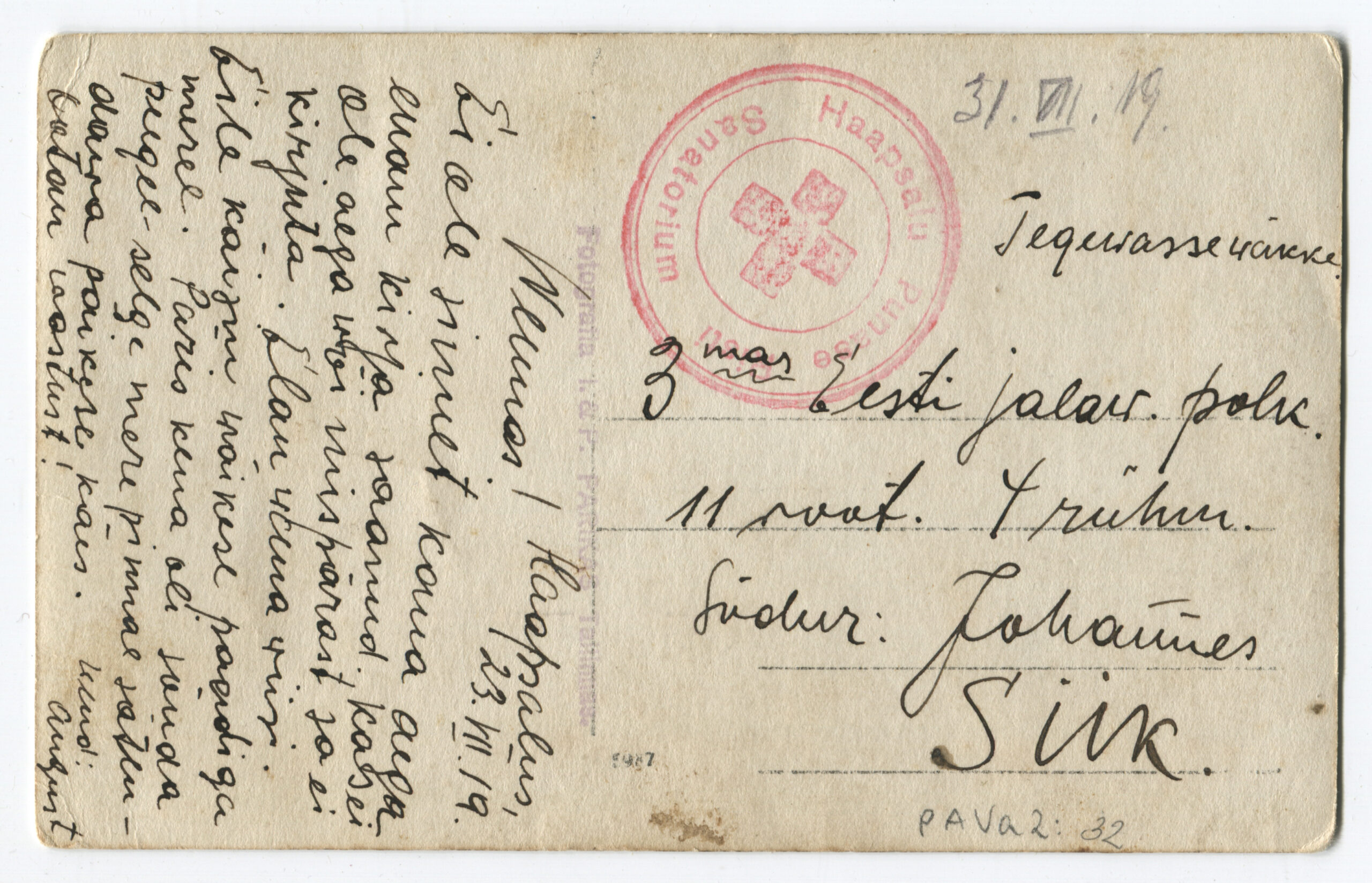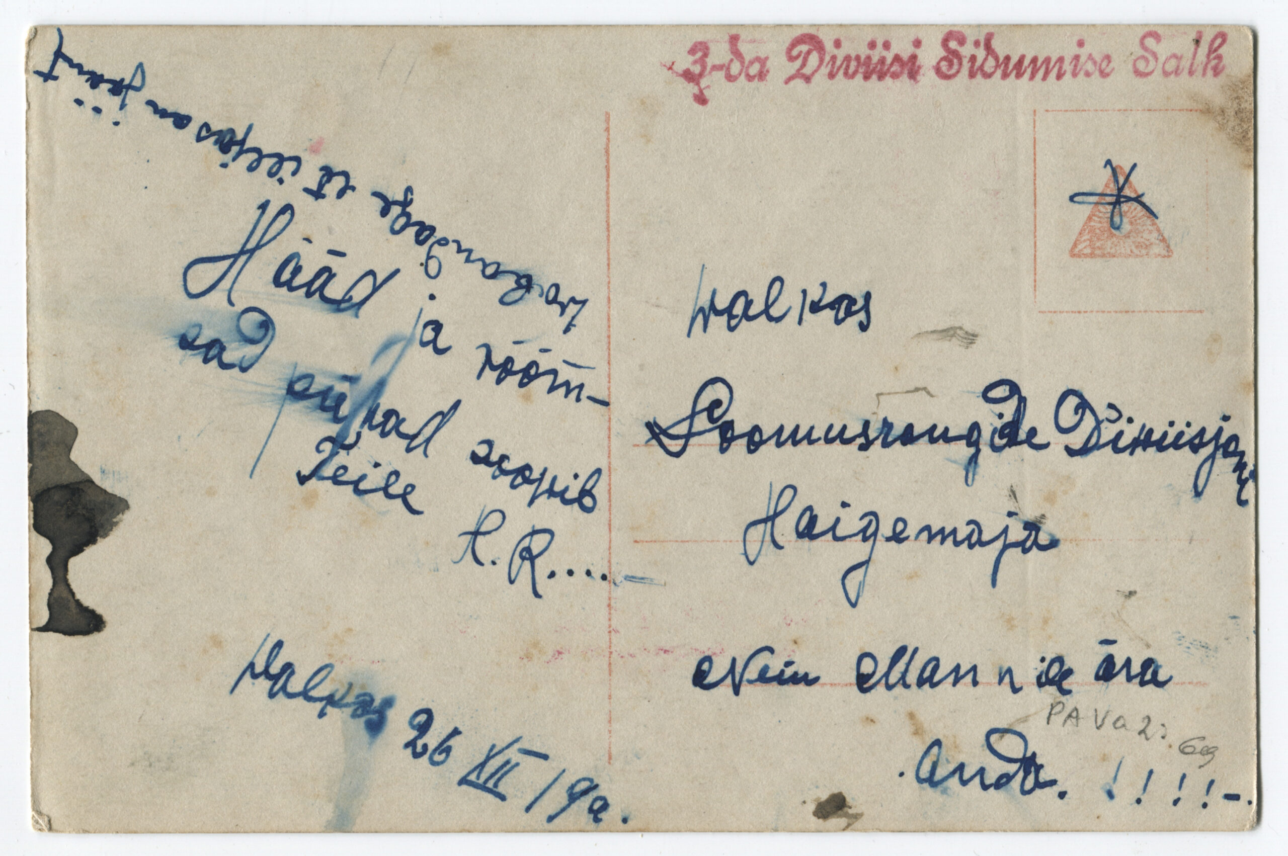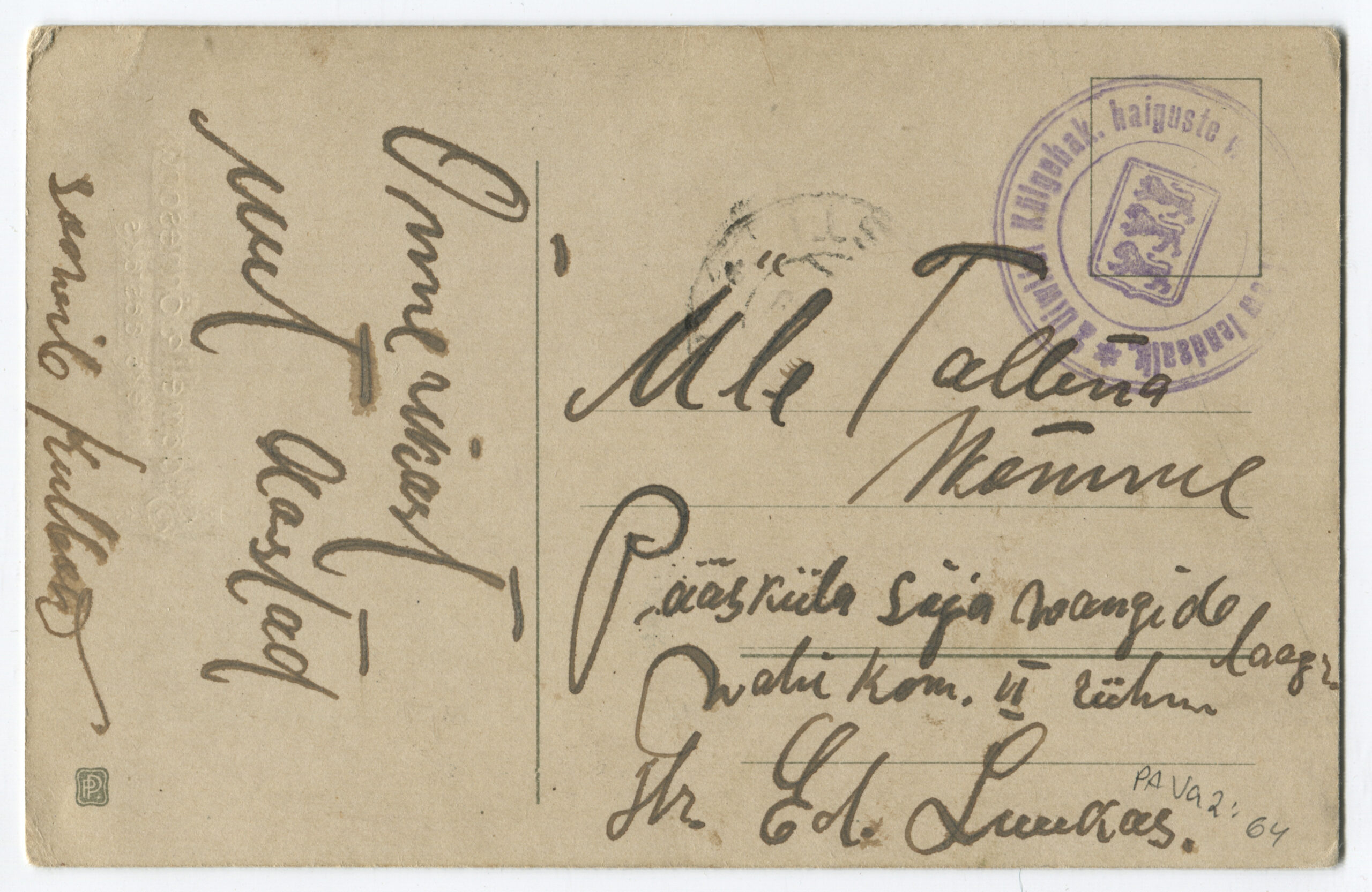 Kiri on saadetud Tunne Kelami isale. „Ta oli Tallinna Kunsttööstuskooli vabatahtlike hulgas, soomusrongil oma sõbra ja toakaaslase Eduard Wiiraltiga, suhteliselt lühikest aega. Mäletan tema juttu mõnest episoodist, mis seotud just rongil olemisega. Kirja saatja peaks olema tema vend, minu onu Kristjan Sink,“ meenutab Tunne Kelam.Kopli Sõjawäe Haigemaja Tallinnas / Kirjade tarwis