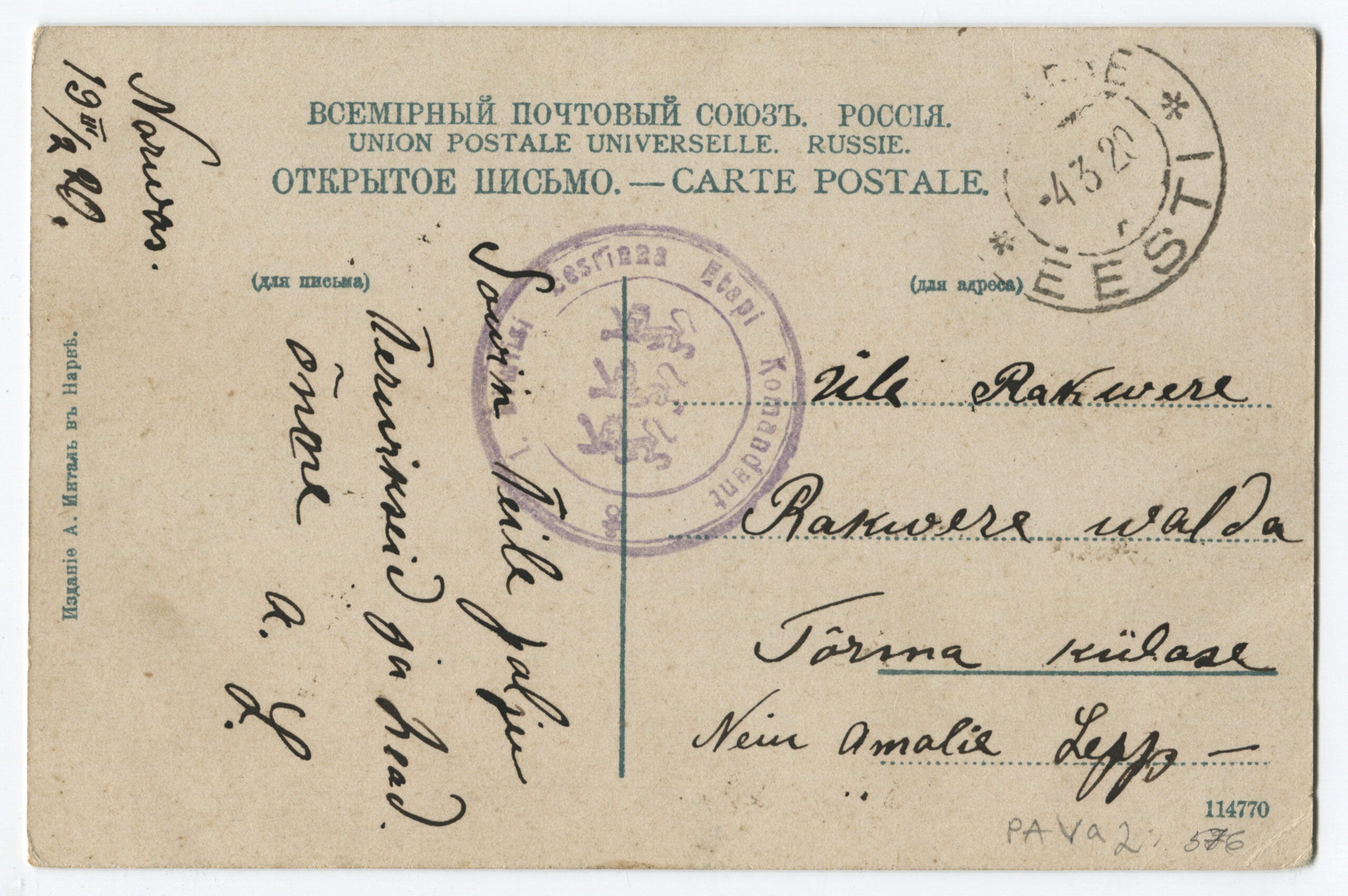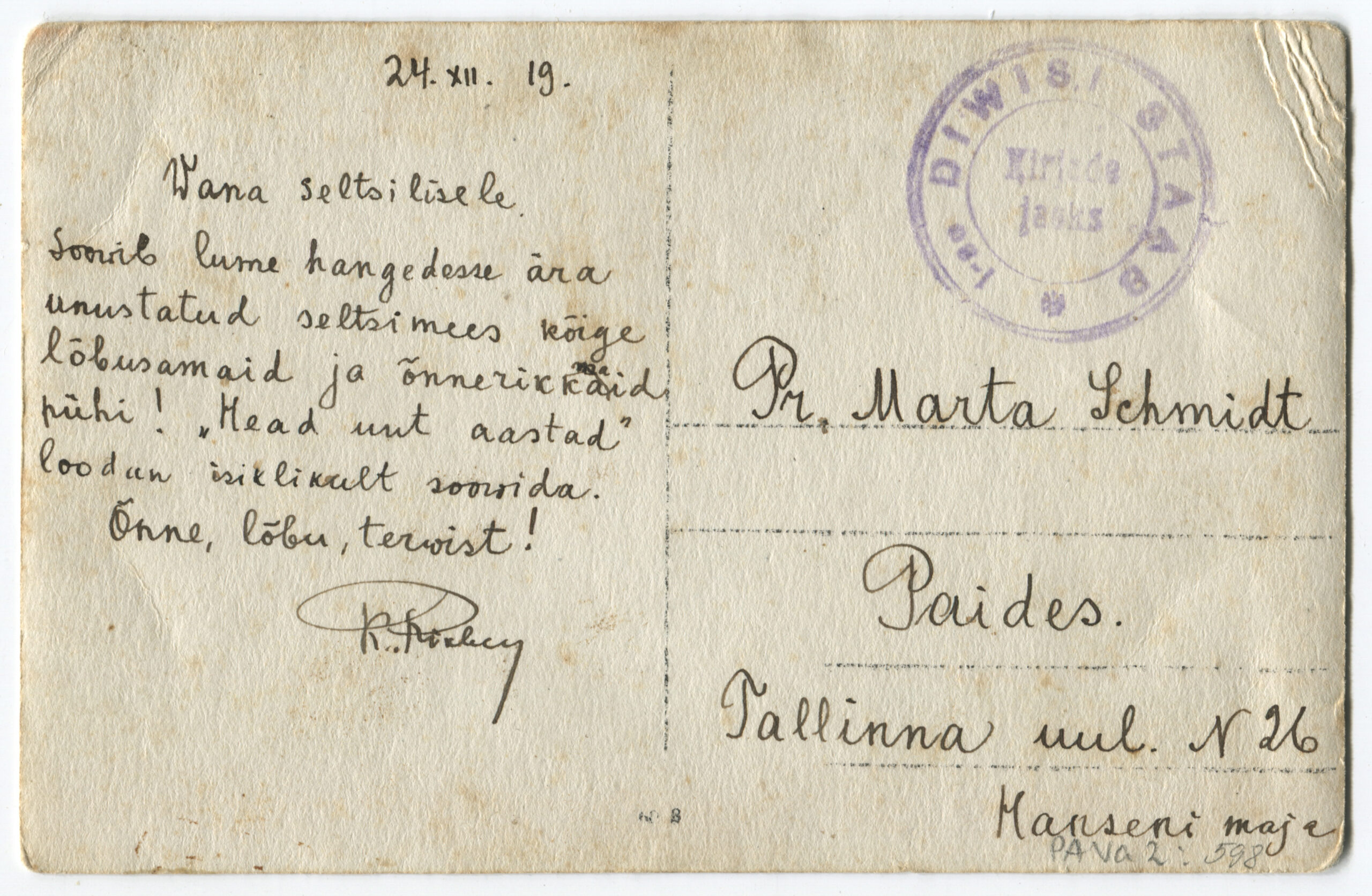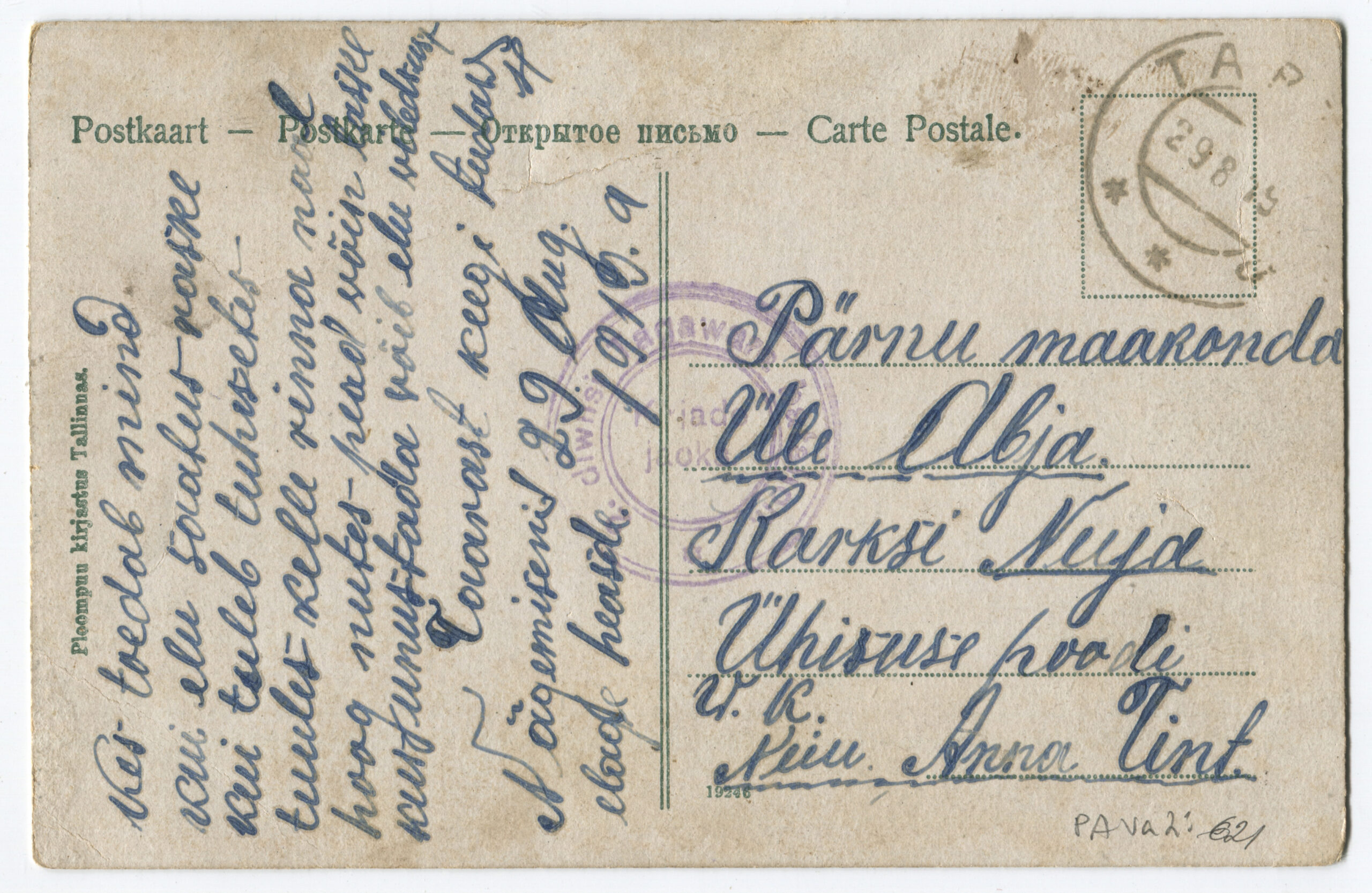 Kiri on saadetud Rakverest Viljandisse 24.06.1919.