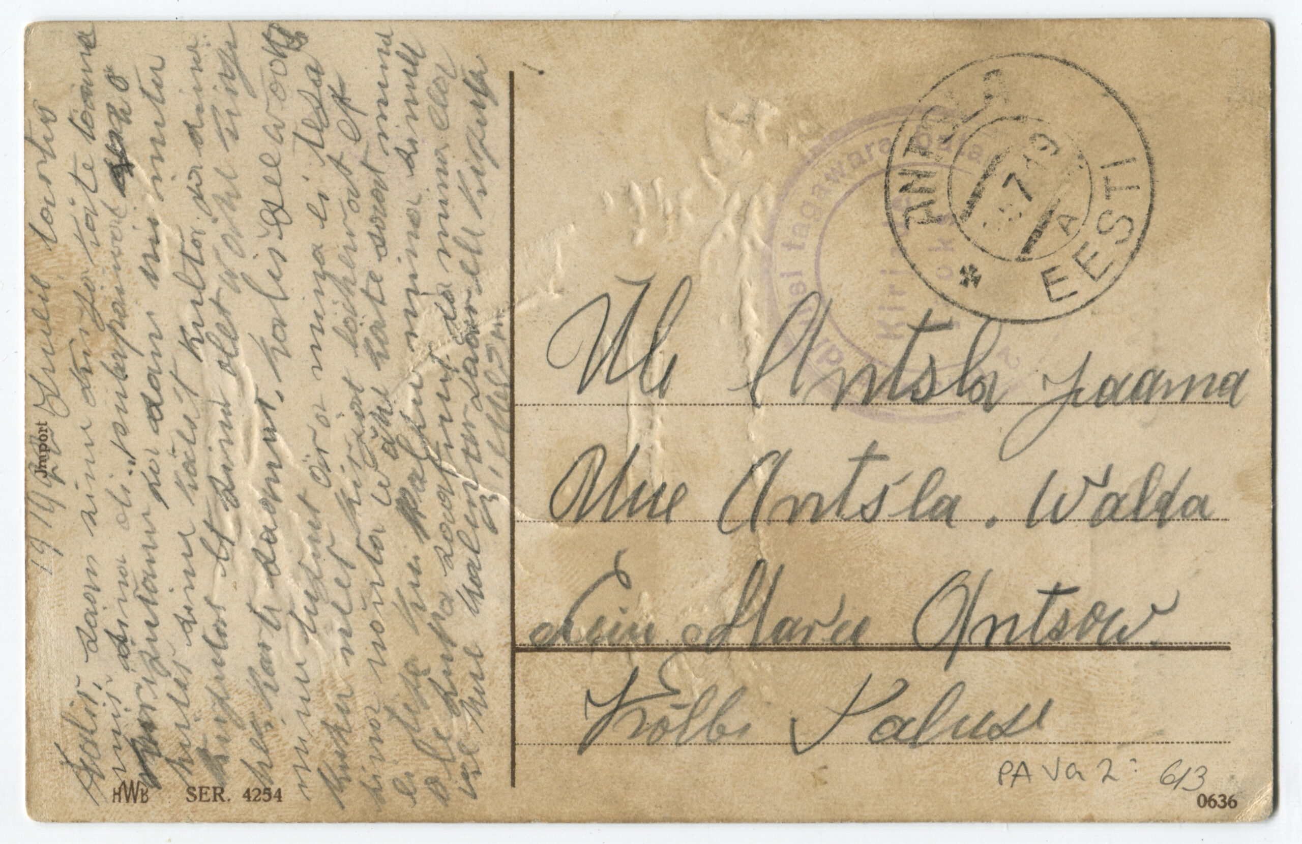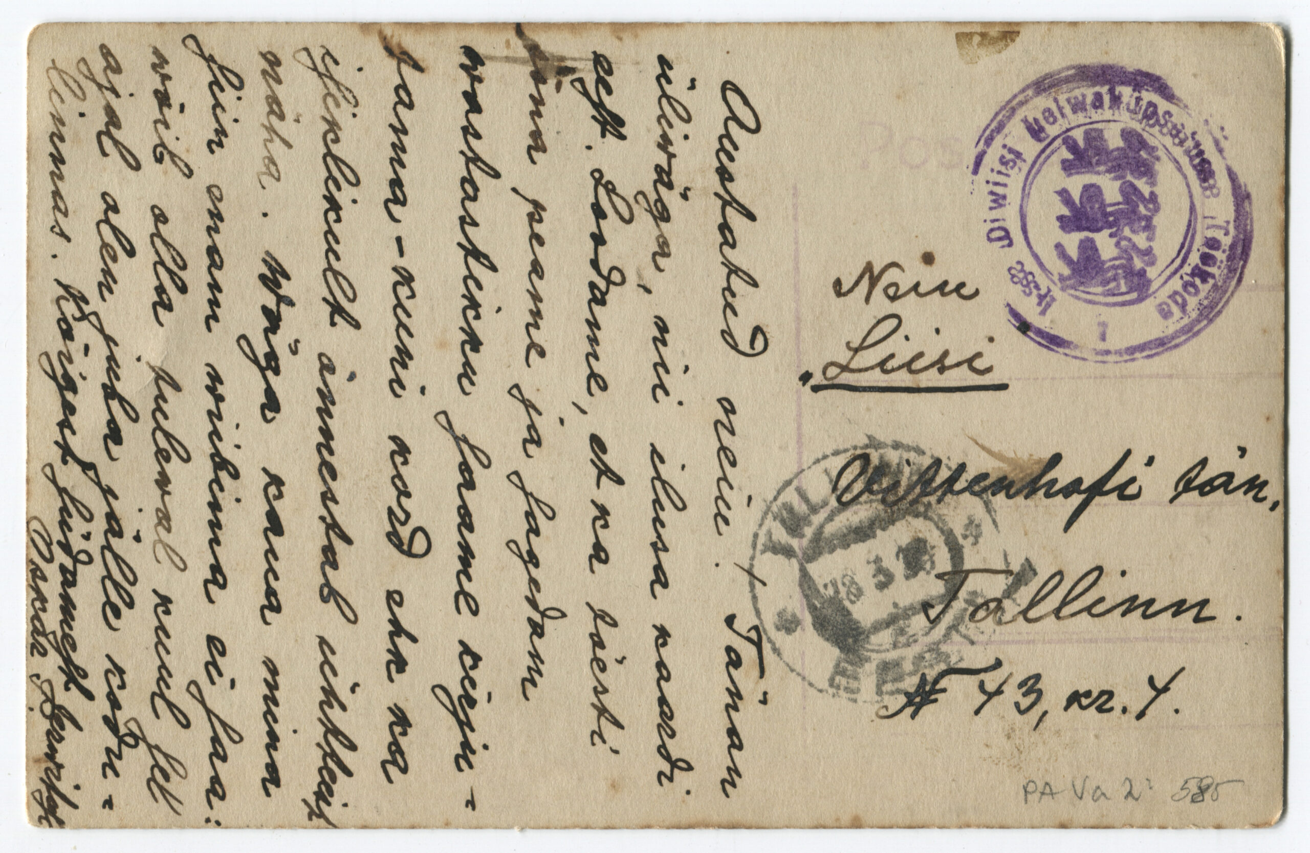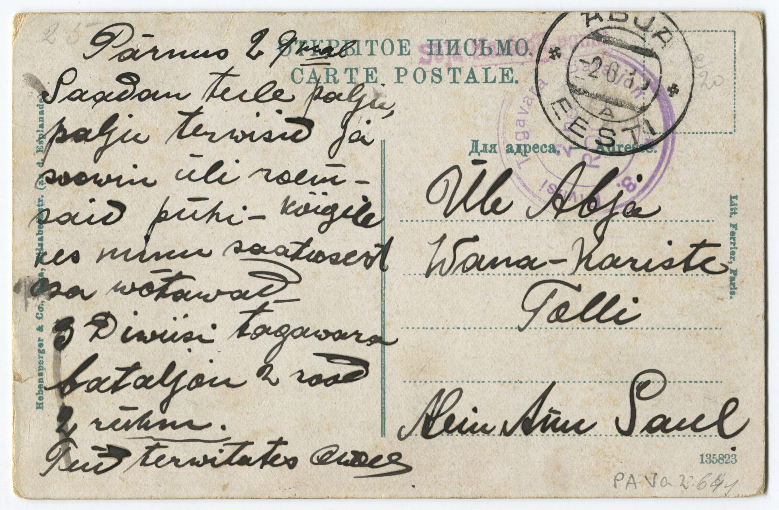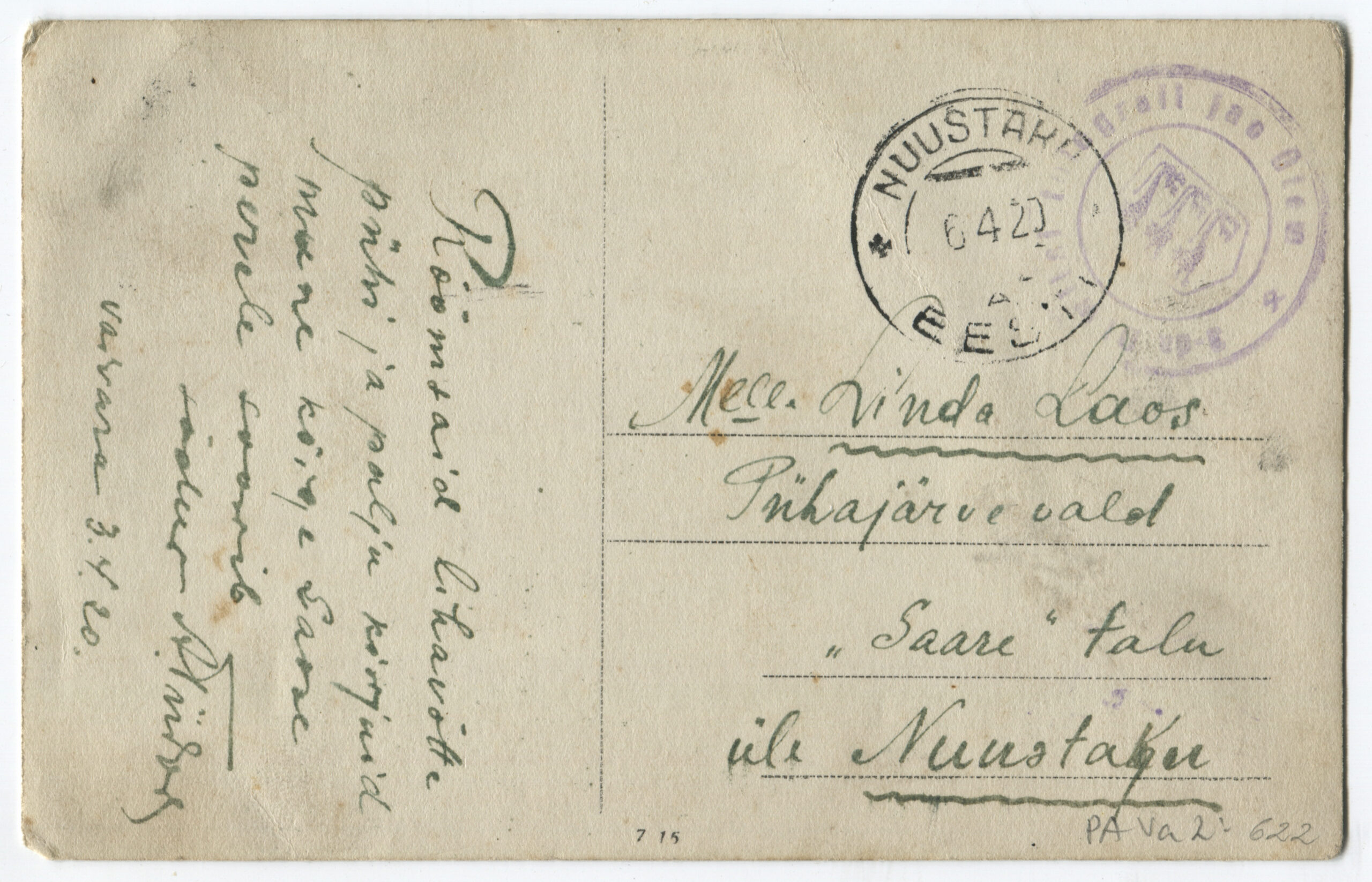 Kiri on saadetud päev pärast Vabadussõja lõppemist. Kalendertempel: Abja, 3.02.1920
