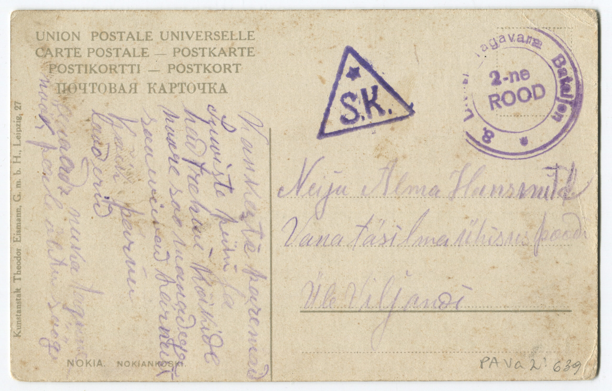 Kolmnurkne Tartu Sõjaväe Kontrolli tempel „SK“. Kohanimed on kustutatud.
