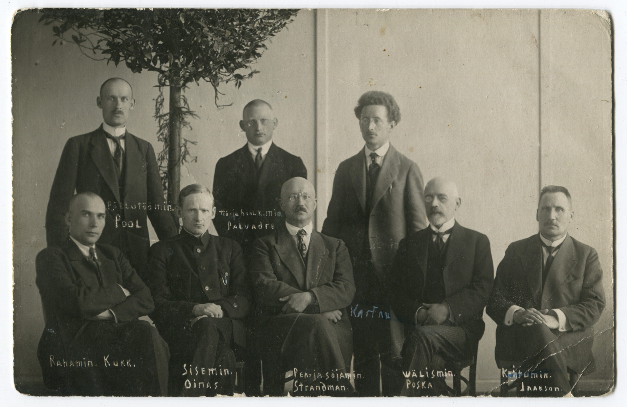 ERMAsutav Kogu kinnitas 9.05.1919 ametisse Vabariigi Valitsuse. Esimeses reas vasakult: rahandusminister J. Kukk, siseminister A. Oinas, pea- ja sõjaminister Otto Standman, välisminister Jaan Poska, kohtuminister Jüri Jaakson. Teises reas vasakult: põllutööminister Theodor Pool, töö- ja hoolekandeminister Anton Palvadre, haridusminister Juhan Kartau. Fotolt puudub tööstus-kaubandus- ja teedeminister Nikolai Köstner.