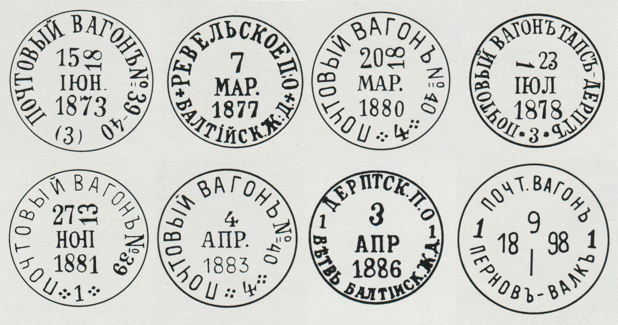 Esimene rong sõitis Tartu 21.04.1878. Templid: ПОЧТОВЫЙ ВАГОНЬ (postivagun), nr 89, 18.04.1880; PEBEЛЬ, 19.04.1880