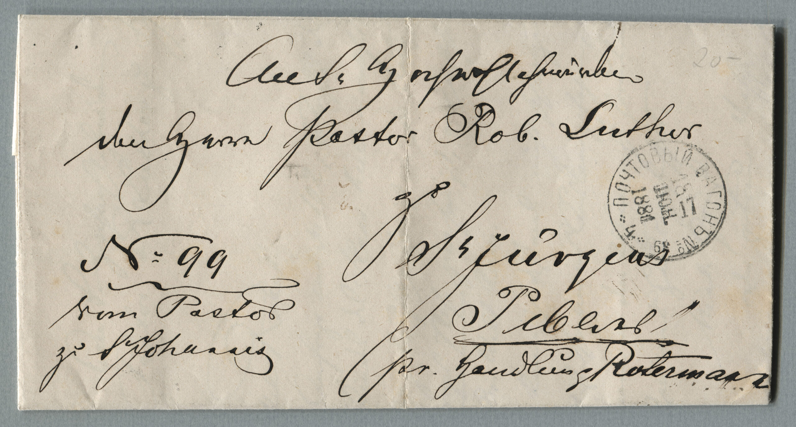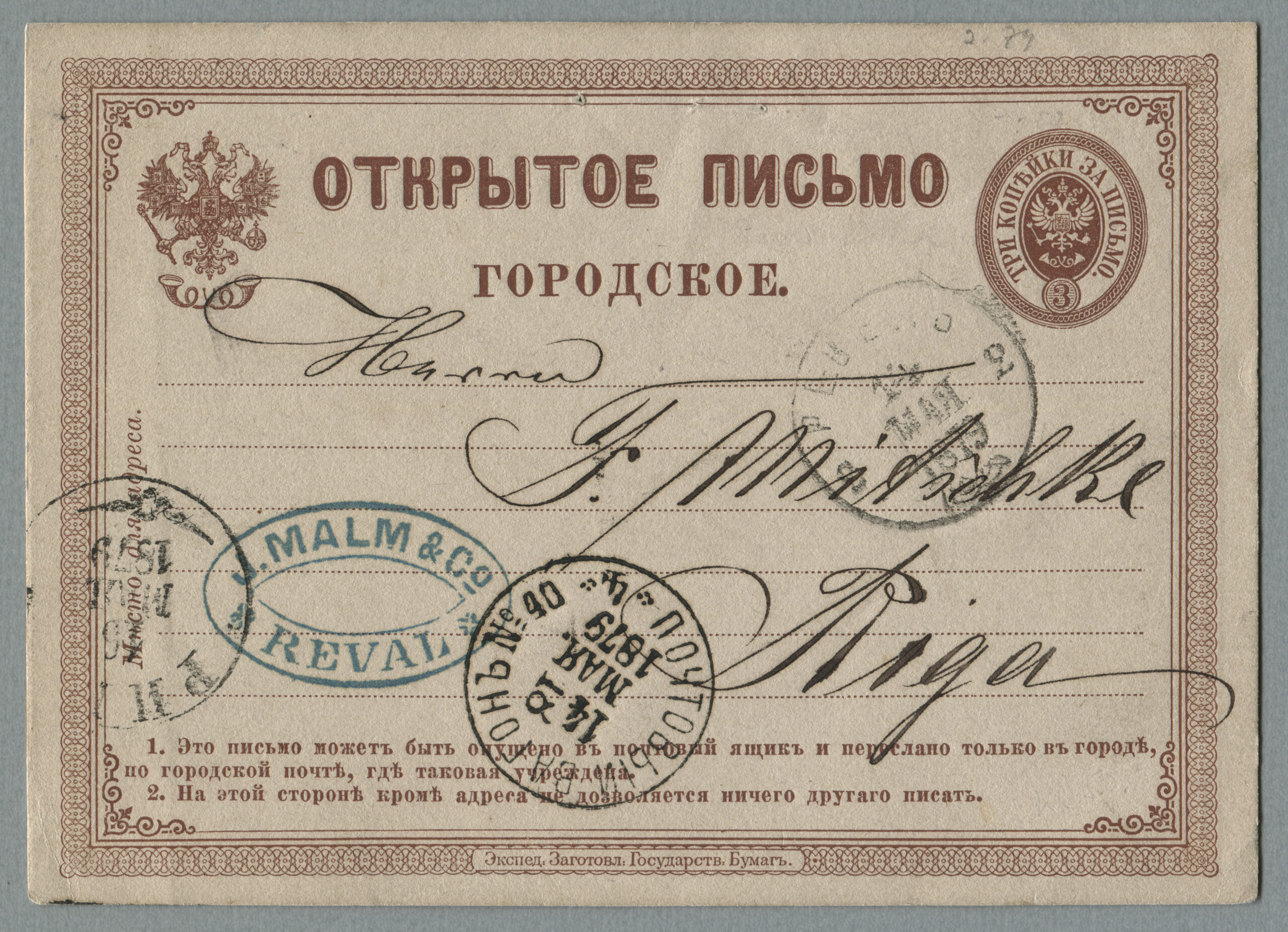 Erakogu (Ants Linnard) Avatud kiri Revalist Riiga, tempel: ПОЧТОВЫЙ ВАГОНЬ nr 40, 14.05.1879