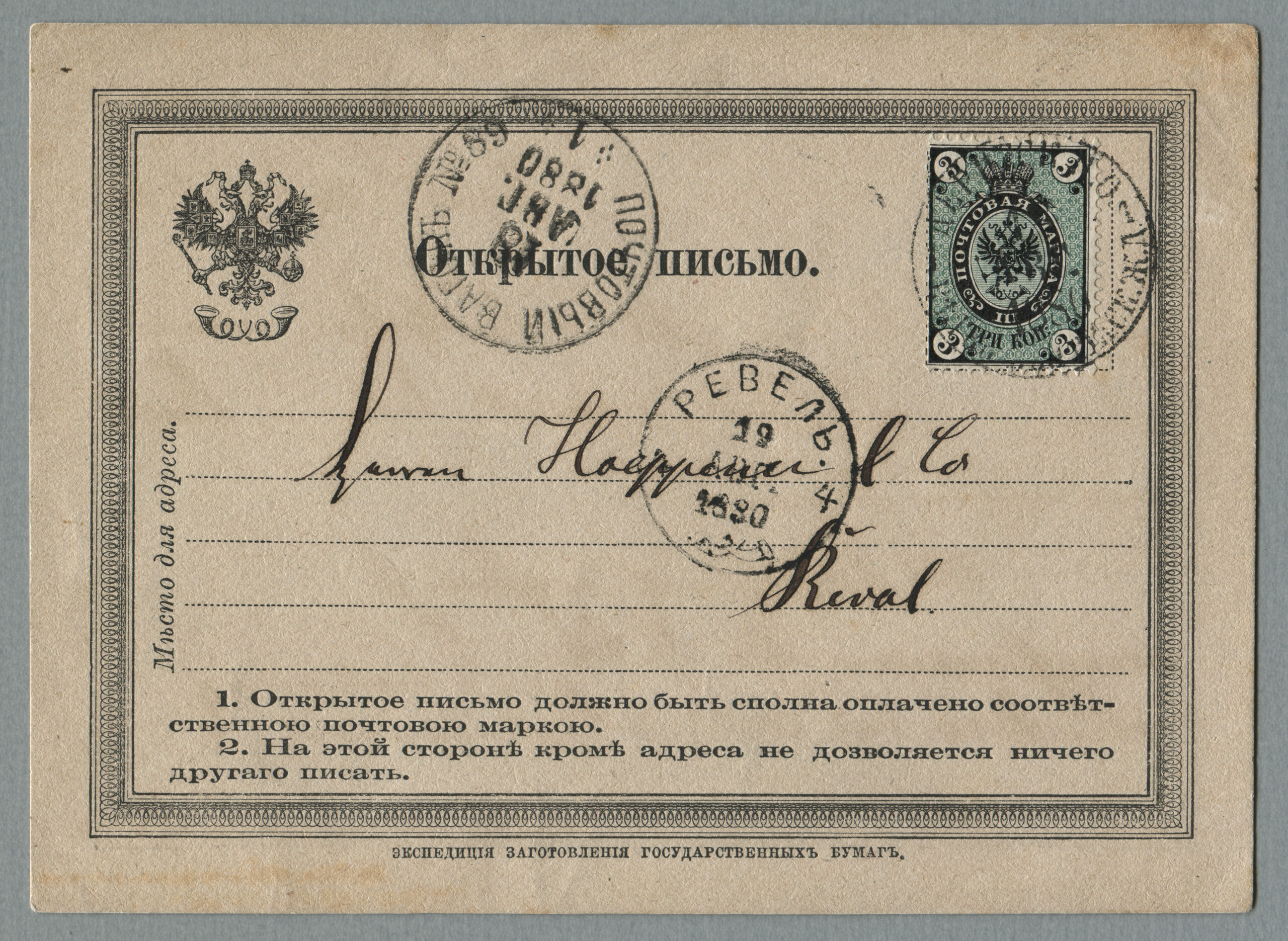 Erakogu (Ants Linnard)Avatud kiri Dorpatist Revali, postivagun nr 89 Dorpat–Taps (1880–1894)