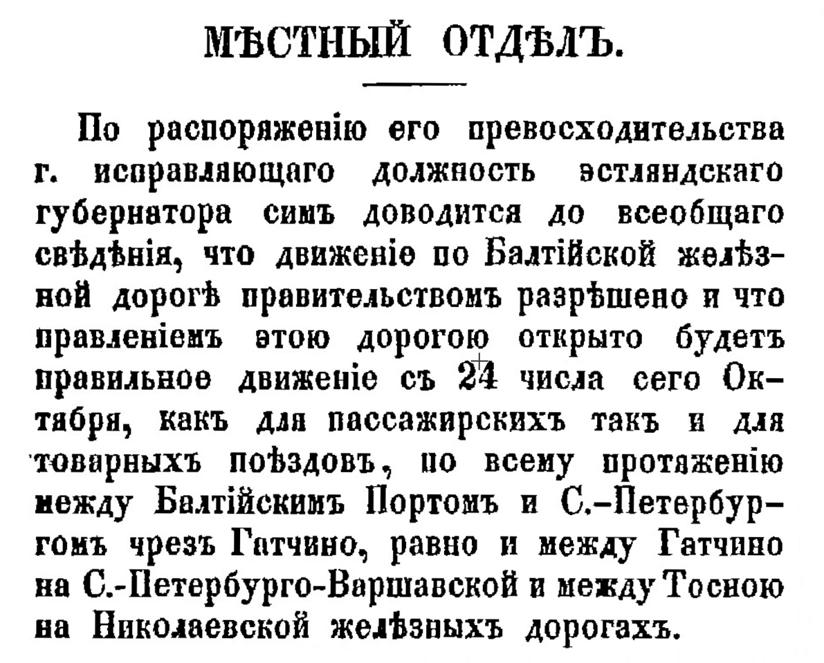 Eesti Postimees ehk Nädalaleht: maa- ja linnarahvale nr 41, 14.10.1870 Tema Austatud Keiserliku Majesteedi korraldusel teatatakse kohaliku valitsuse Eestimaa kubermangu kohatäiturile, et valitsuse poolt on Balti raudteelliiklus lubatud alates 24. oktoobrist reisi- ja kaubarongidele kogu Balti Sadama ja S.-Peterburgi läbi Gatšino ning Gatšinost St. Peterburgi-Varsavi-Tosno Peterburi kubermangus Nikolai raudteedel.