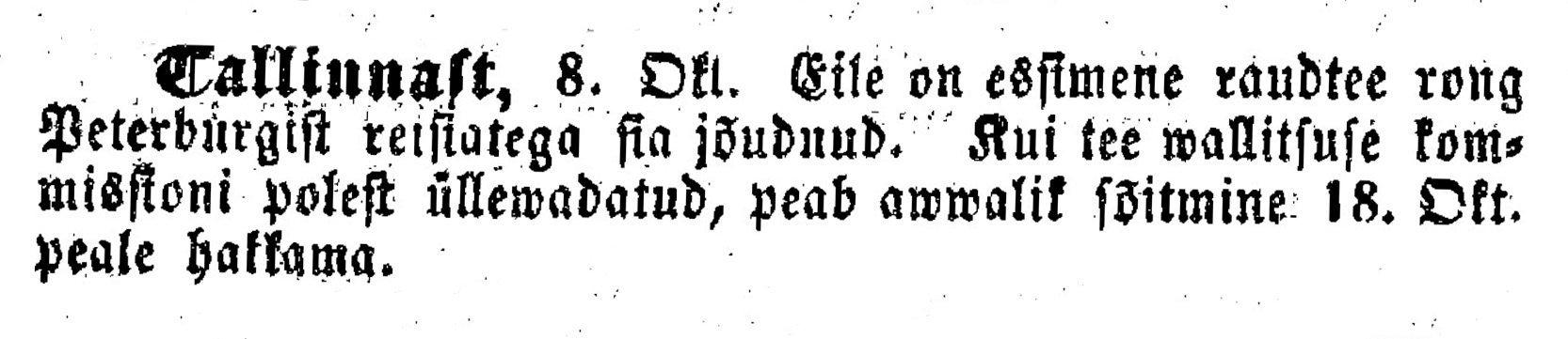 Tallinnast, 8. dets. Eile on esimene raudtee rong Peterburgist reisijatega siia jõudnud. Kui tee valitsuse poolt üle vaadatud, peab avalik sõitmine 18. dets. peale hakkama.