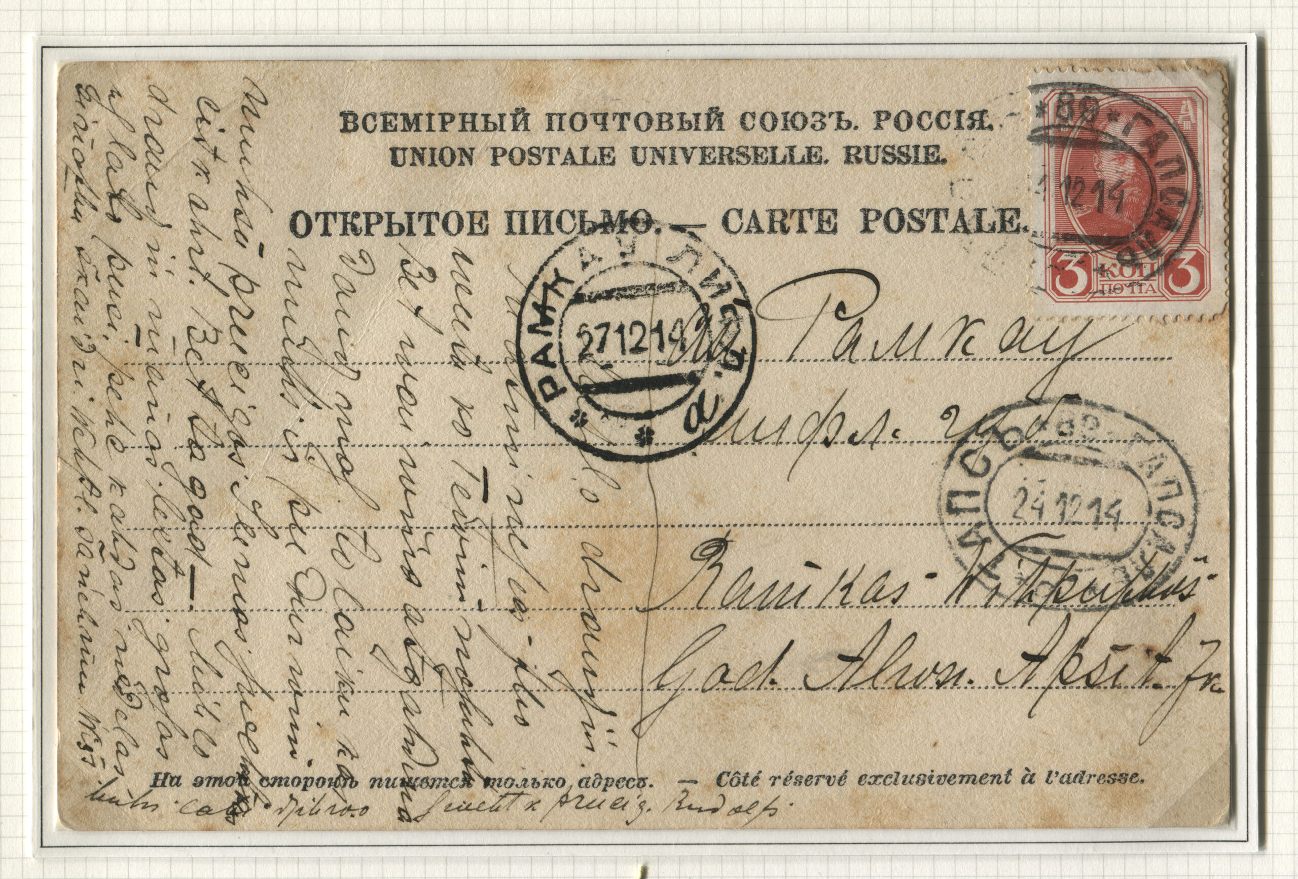 ERMi koguKiri saadetud 07.03.1915 Kopenhaagenisse Petrogradi kaudu 14.04.1915 Rongiliin Mõisaküla-240-Tallinn. Kalendertempel Mõisaküla-240-Tallinn, 07.03.1915 Petrogradi sõjaväetsensuur, eksamineerija nr 15