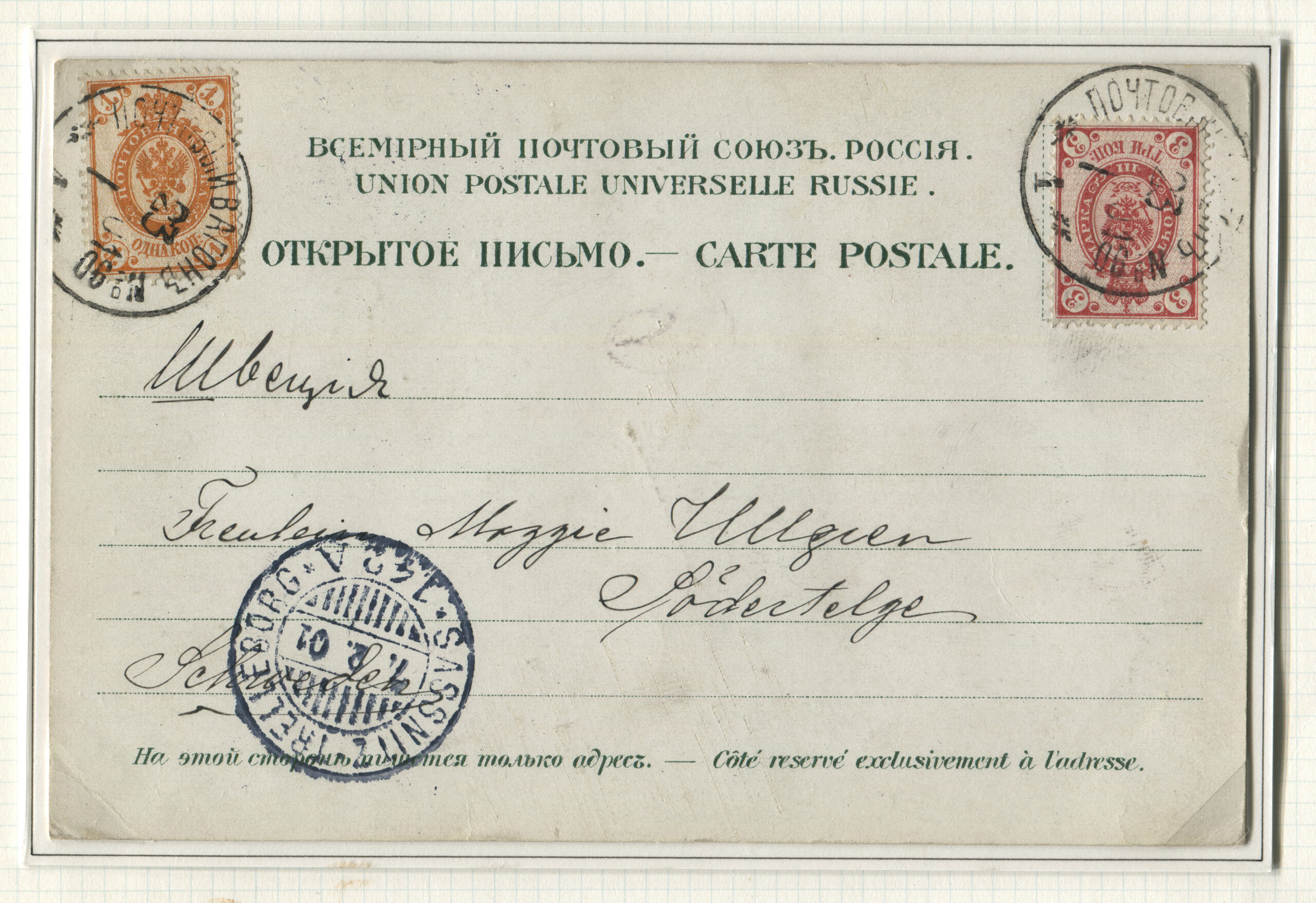 ERMi koguPostkaart saadetud Pärnust 23.01.1901 Södertäljesse Sassnitz-Trelleborg-Ferry kaudu 07.02.1901 Rongiliin Riia-90-Tapa. Tempel: PV Riia-90-Tapa (1. vagun) 23.01.1901
