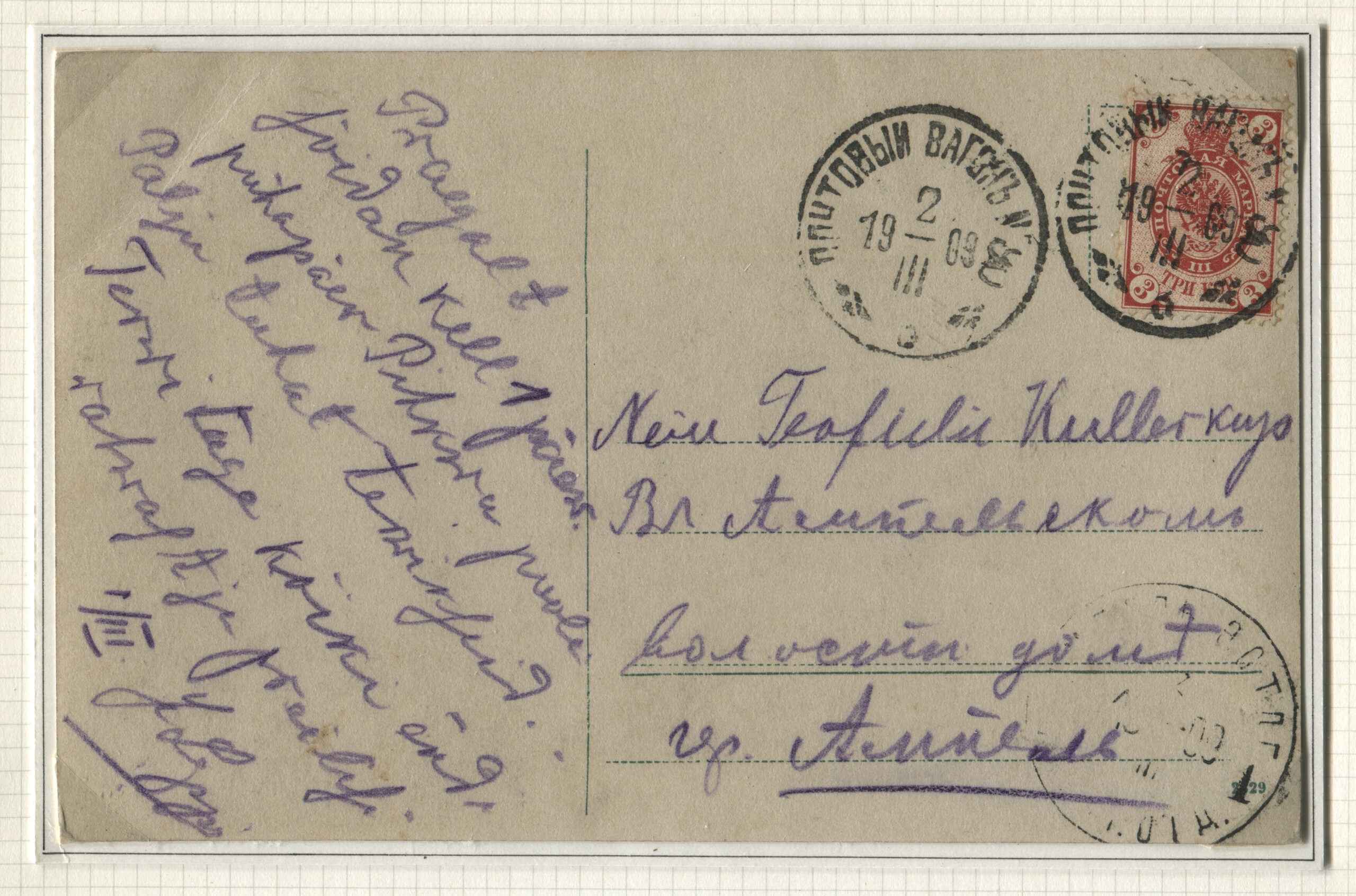 ERMi koguPostkaart saadetud 02.03.1909 Ambla 03.03.1909 Rongiliin Riia-90-Tapa. Tempel: Postivagun 90 (3. vagun), 02.03.1909