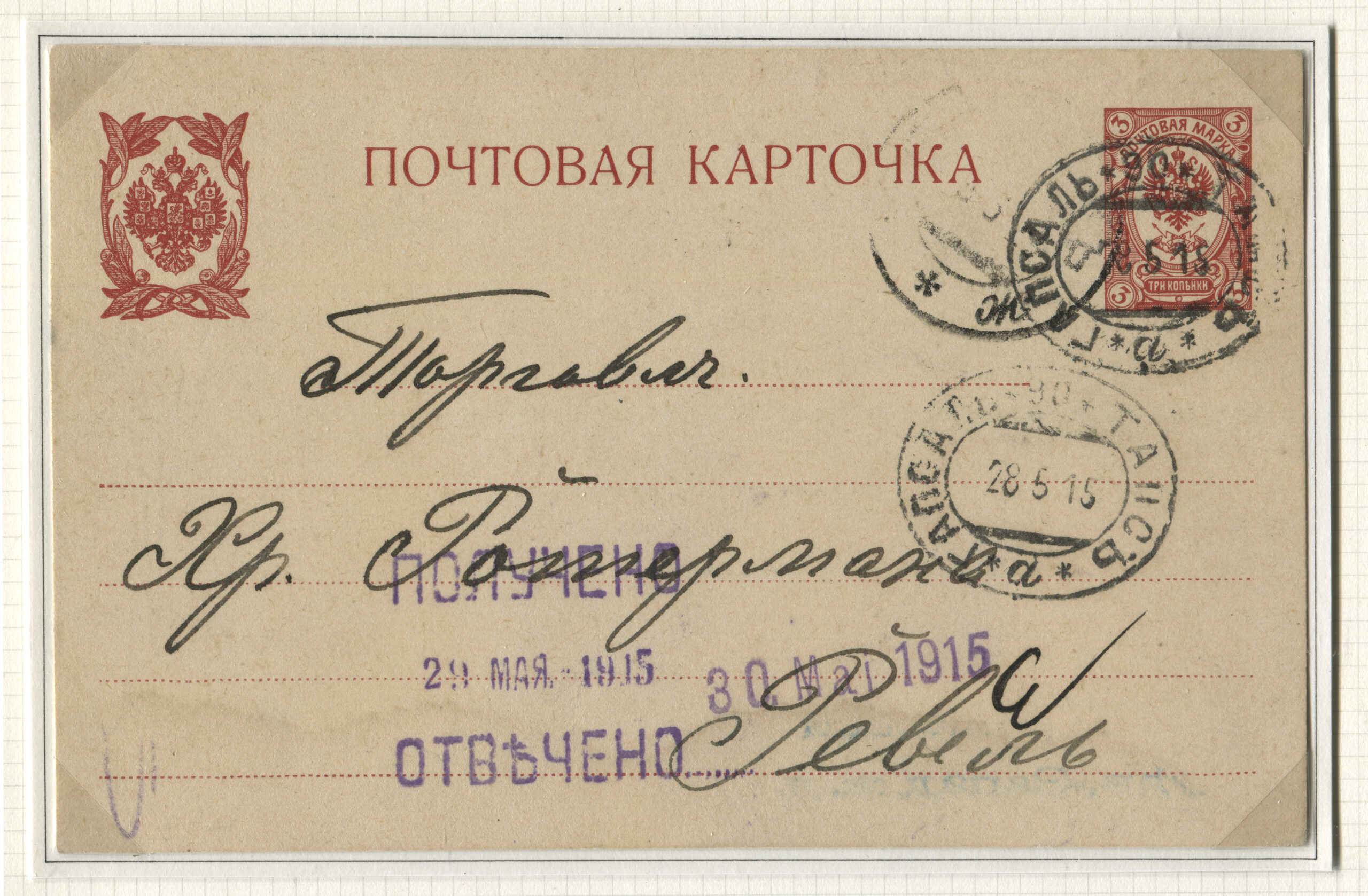 ERMi koguPostkaart saadetud 28.05.1915 Tallinna 28.05.1915 Rongiliin Haapsalu-90-Tapa. Tempel: Postivagun Haapsalu-90-Tapa, 28.05.1915 Tempel: Kätte saadud, vastatud, 29.05.1915