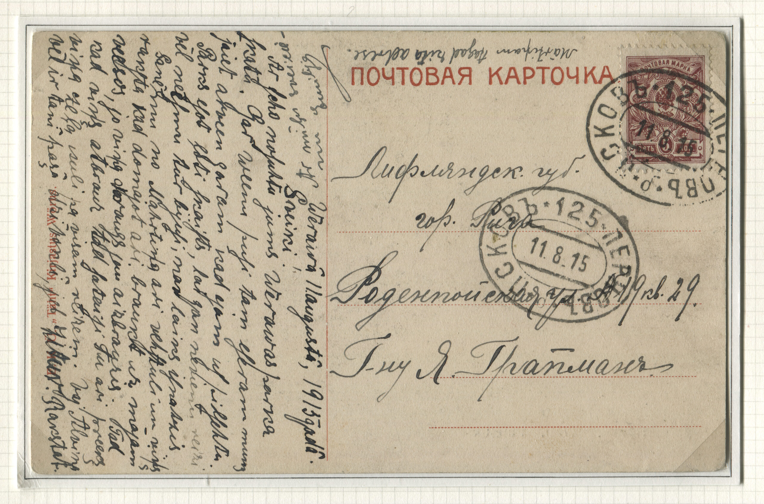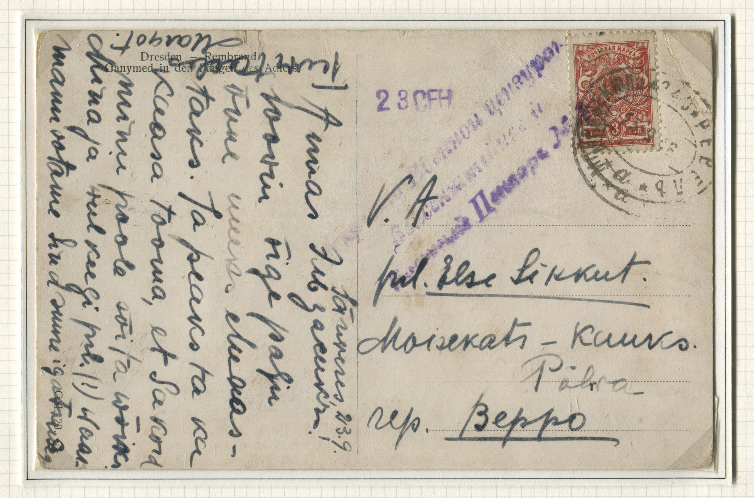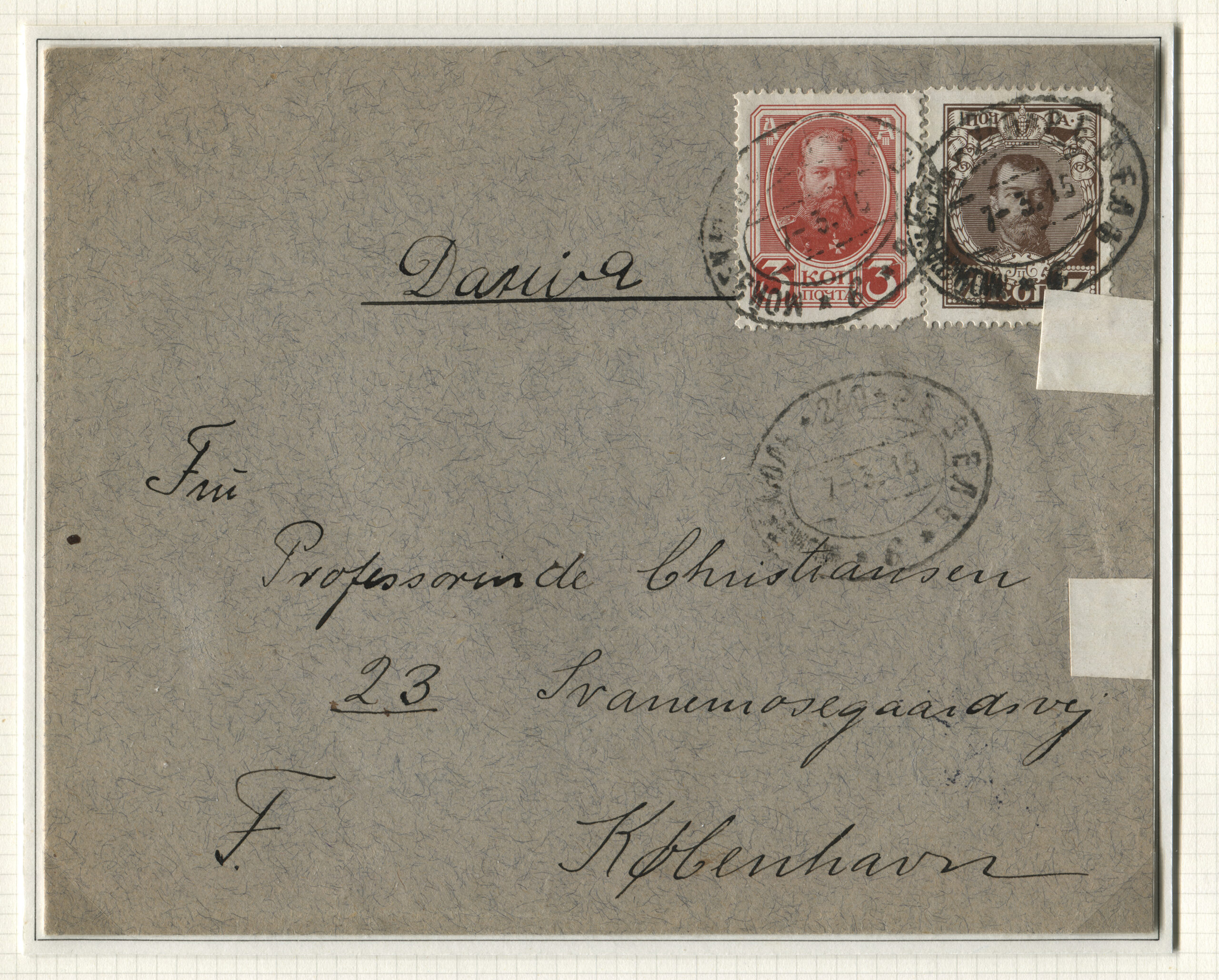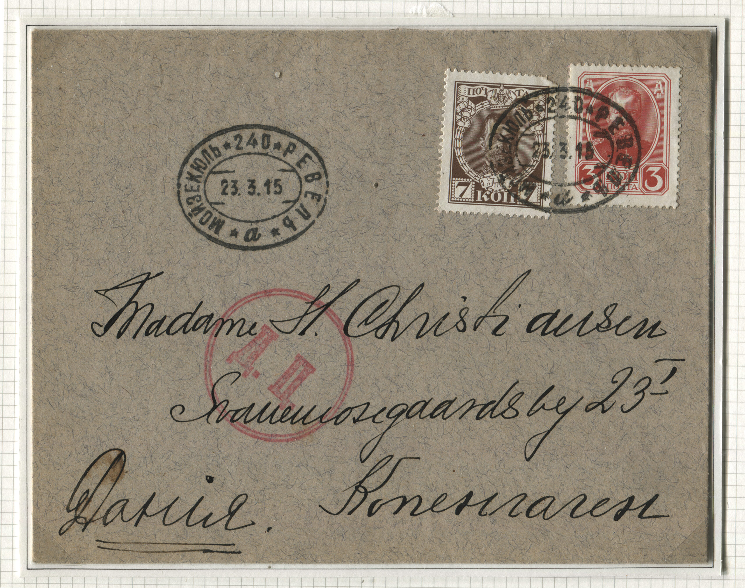 ERMi koguKiri saadetud Kopenhaagenisse Tallinna kaudu 23.03.1915 Rongiliin Mõisaküla-240-Tallinn. Tempel: Mõisaküla-240-Tallinn, 23.03.1915, punane sõjaväe tsensuuritempel