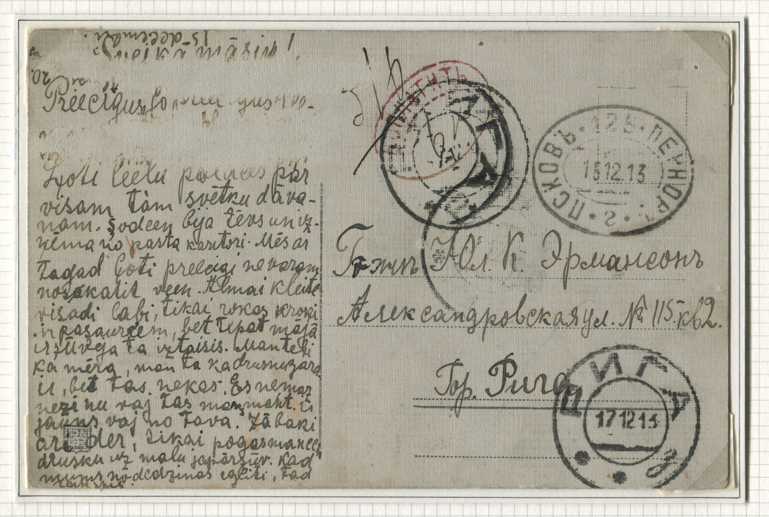 ERMi koguPostkaart saadetud Riiga 17.12.1913 Rongiliin Pihkva-125-Pärnu. Tempel: Pihkva-125-Pärnu 15.12.1913 Postivaguni punane juurdemaksutempel