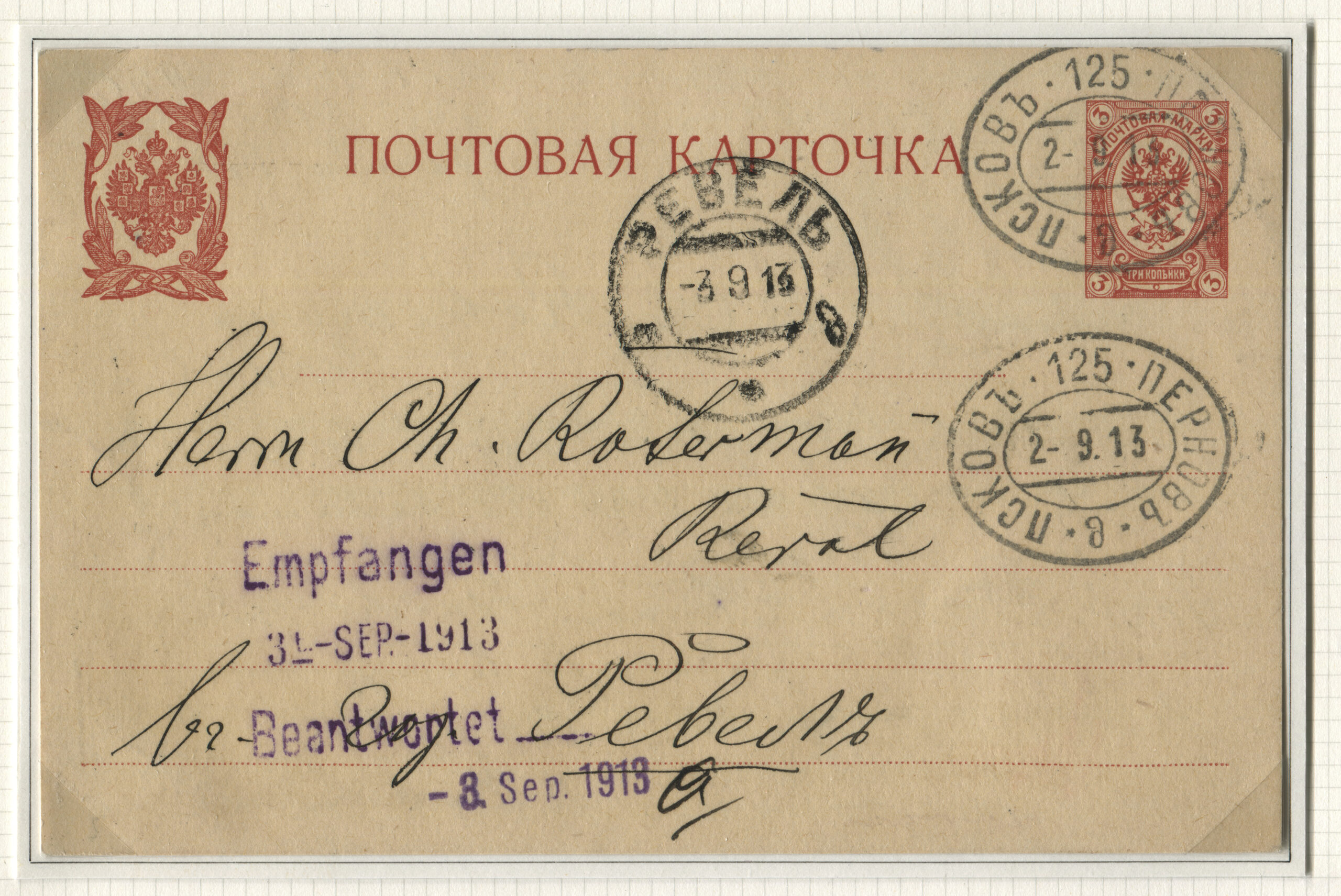 ERMi koguPostkaart saadetud Ruhjast (Rujen) 02.09.1913 Tallinna 03.09.1913 Rongiliin Pihkva-125-Pärnu. Tempel: Pihkva-125-Pärnu 02.09.1913