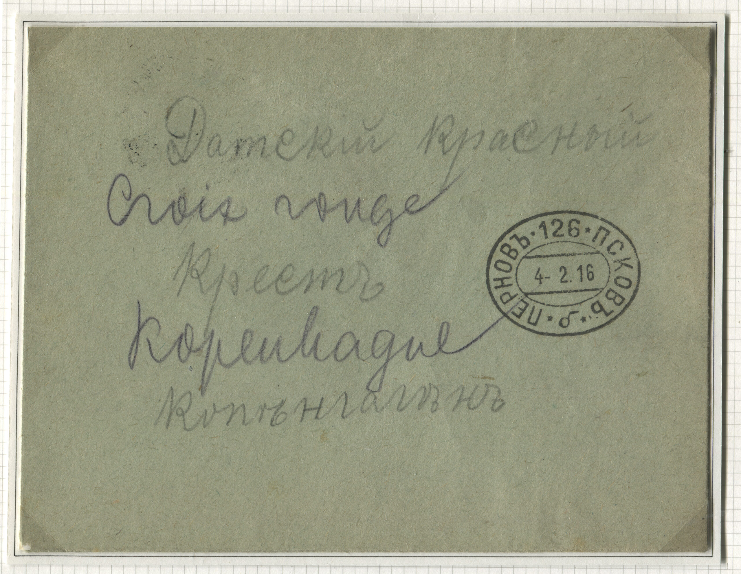 ERMi koguTasuta Punase Risti kiri saadetud Kopenhaagenisse Petrogradi kaudu 15.02.1916 Rongiliin Pärnu-126-Pihkva. Tempel: Pärnu-126-Pihkva, 04.02.1916
