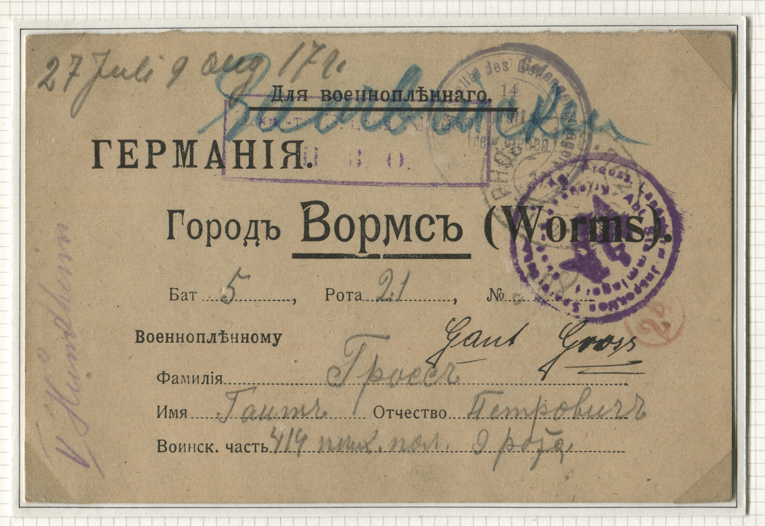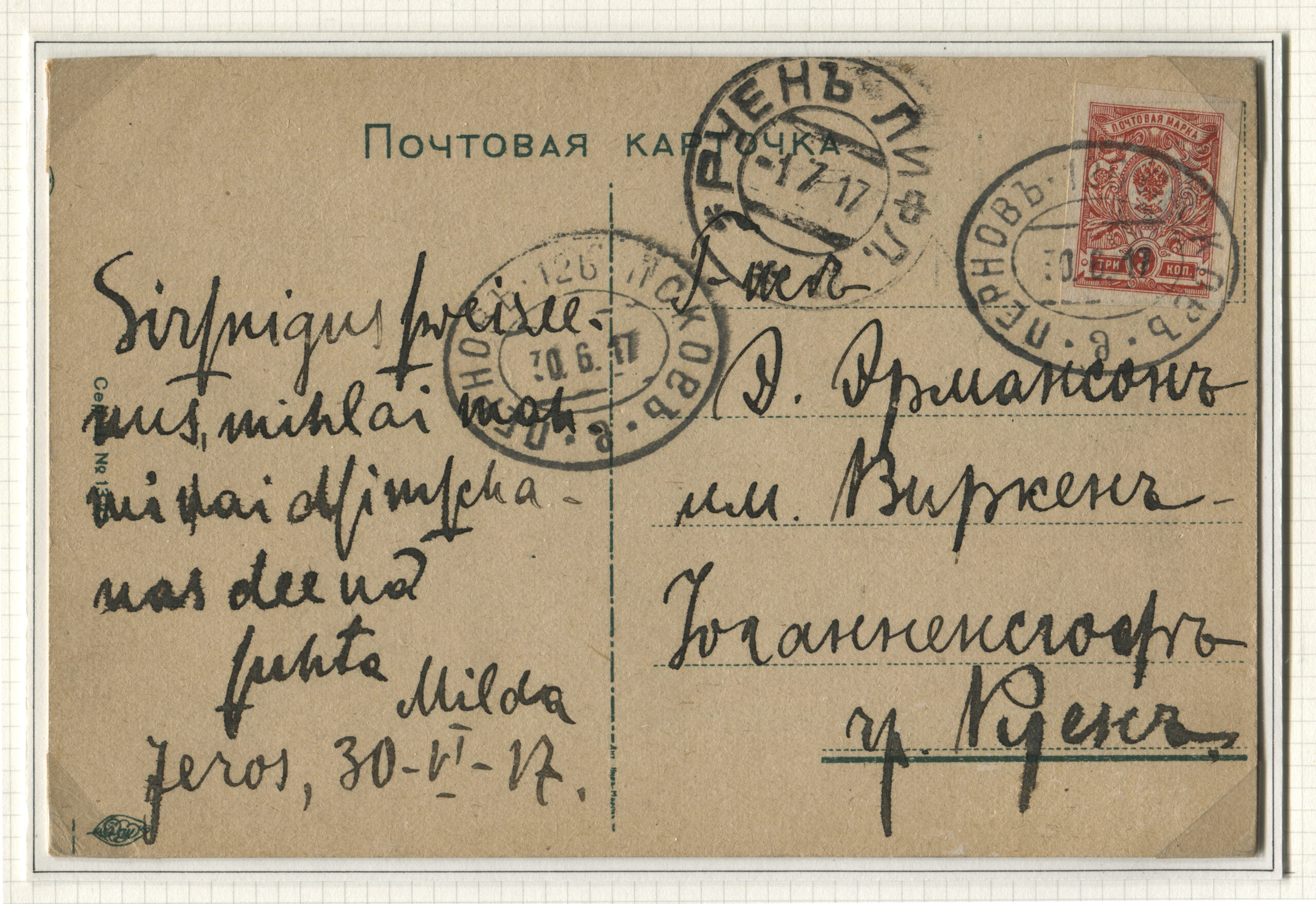 ERMi koguLahtine kiri saadetud 17.02.1917 Wormsi (Saksamaa vangilaager). Rongiliin Pärnu-126-Pihkva. Tempel: Pärnu-126-Pihkva, 17.02.1917, Saksamaa, Venemaa tsensuuritemplid.