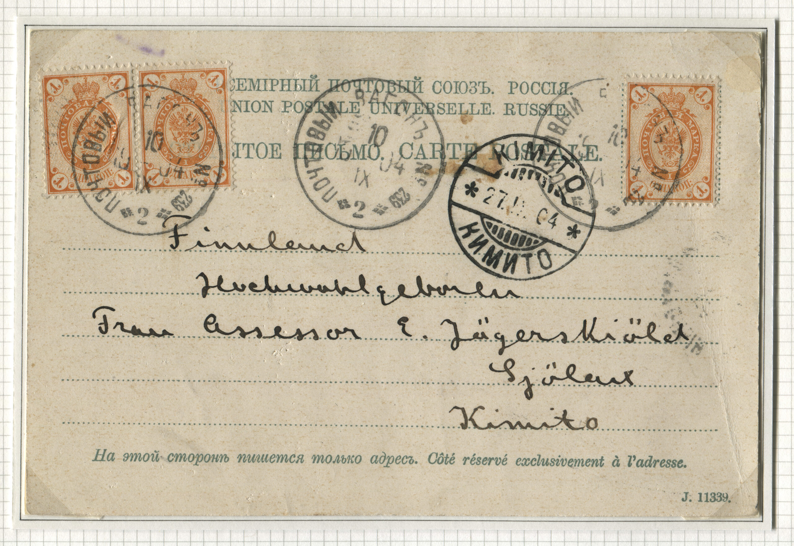 ERMi koguLahtine kiri saadetud Kimito (Soome) 27.09.1904 Rongiliin 239 Tallinn-Mõisaküla. Tempel: Postivagun 239, 10.09.1904 (2. vagun)