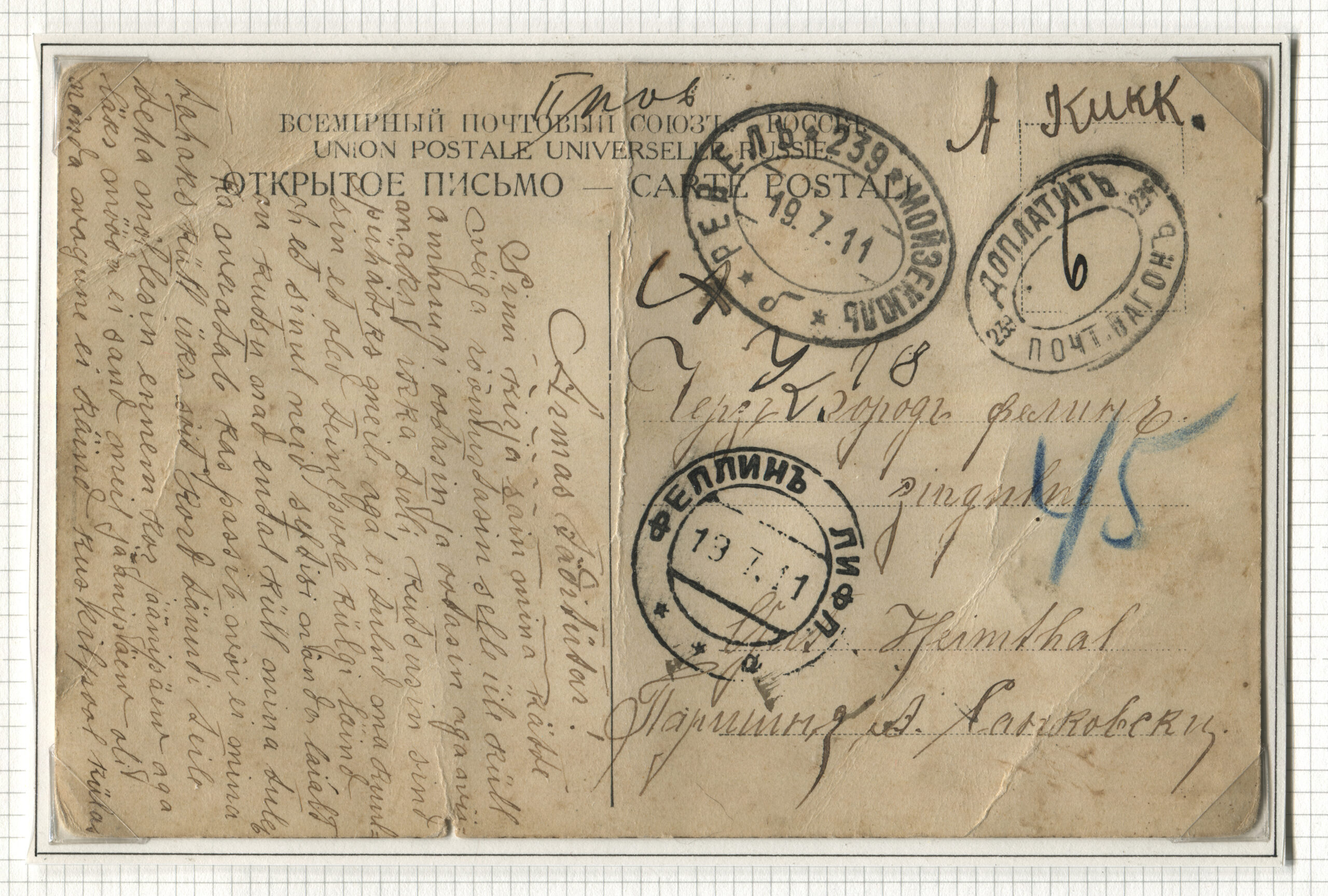 ERMi koguPostkaart saadetud Viljandi kaudu Heimtalisse 19.07.1911 Rongiliin nr 239 Tallinn-Mõisaküla Tempel: Postivagun 239, 19.07.1911