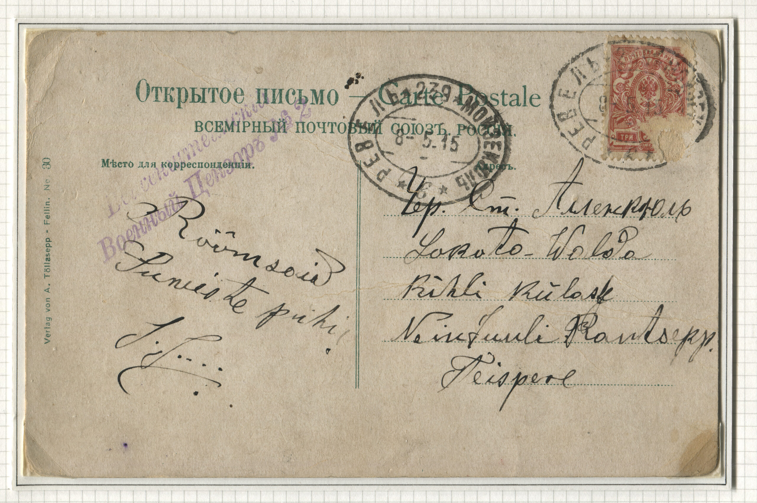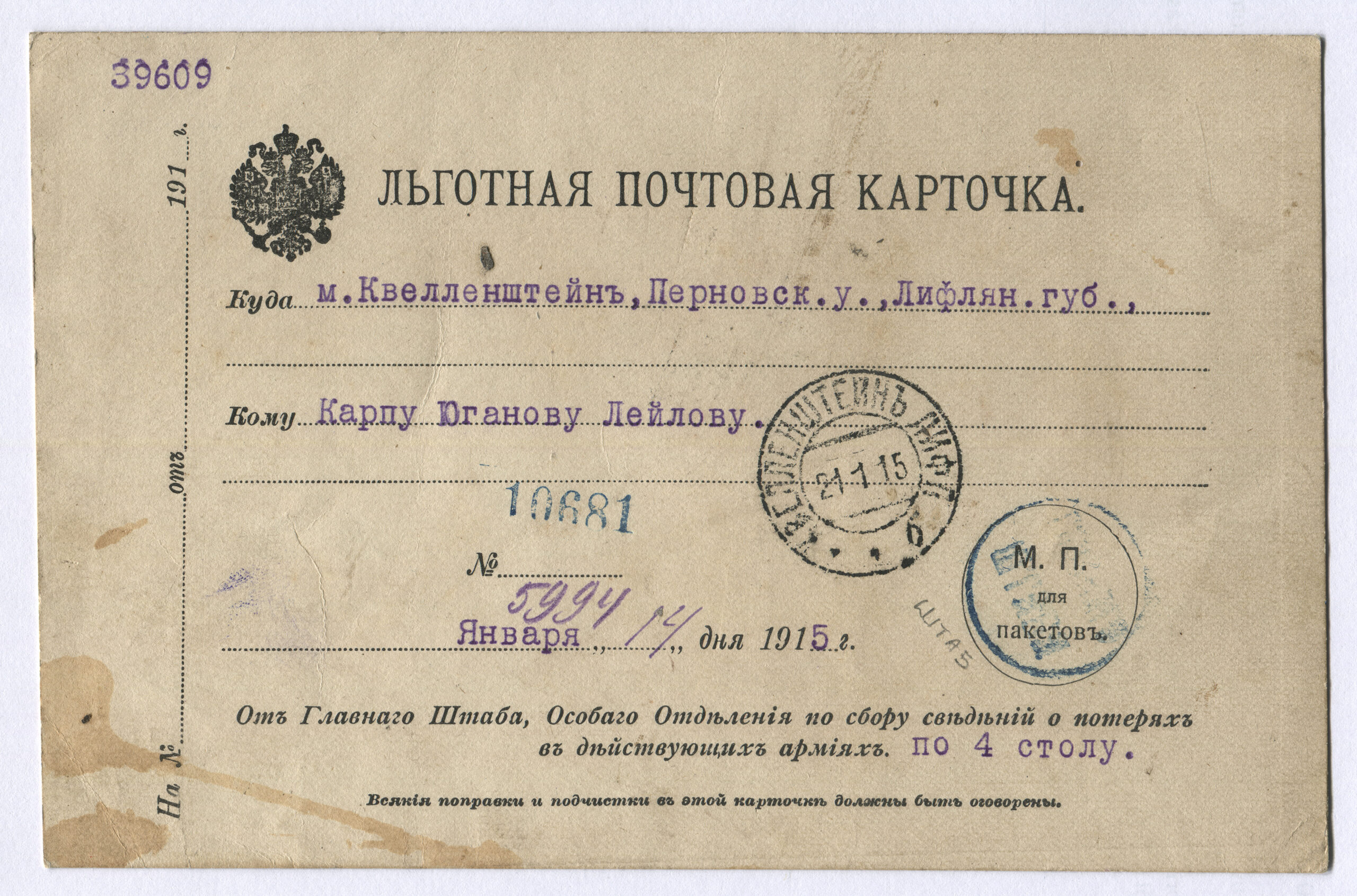 Eesti filateelia käsiraamat (koostajad: V. Hurt, E. Ojaste), 1986, lk 505Sooduspostkaart saadetud Kvellenšteini (Volvet) 21.01.1915 Peastaabi eriosakonna kiri ja tempel