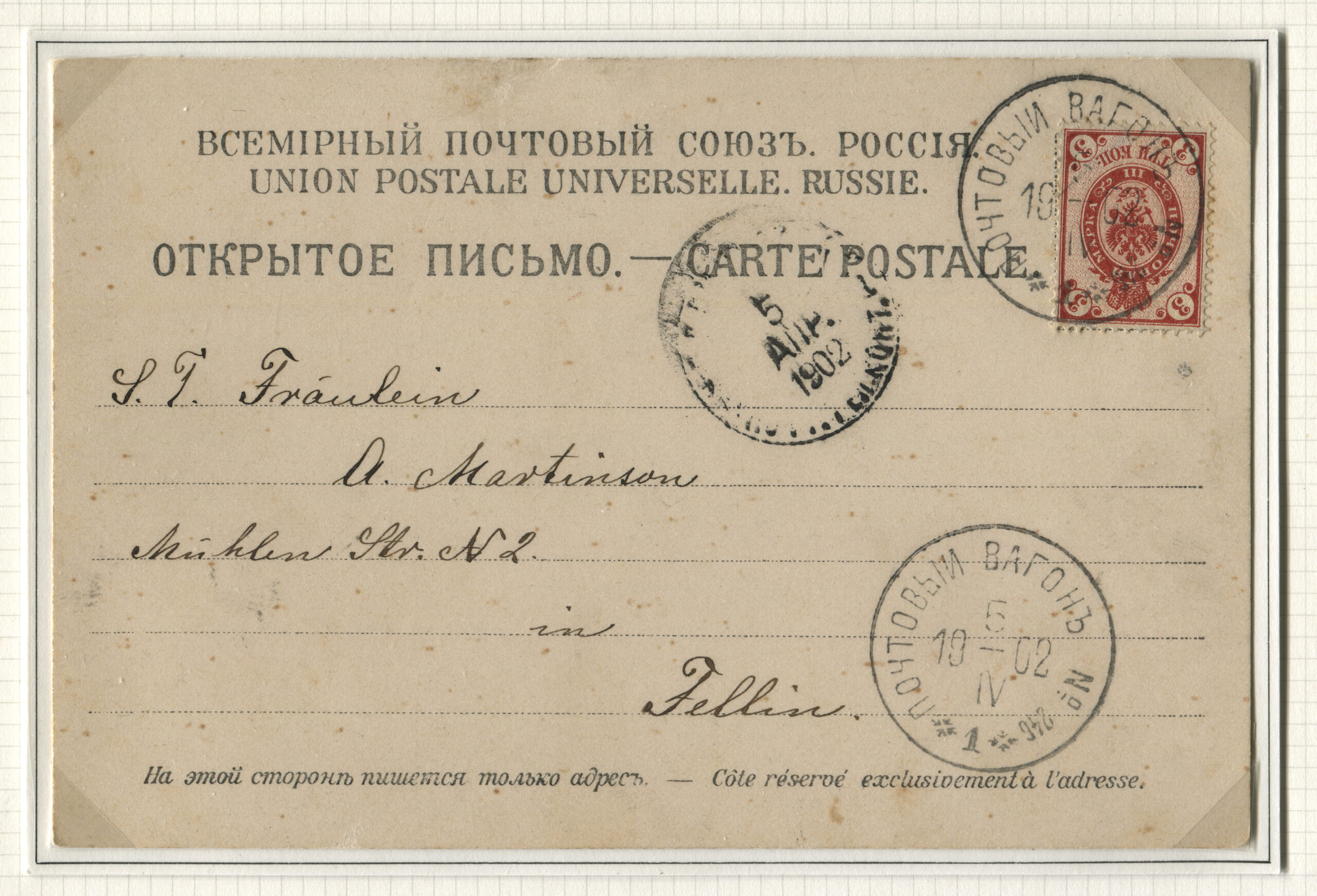 ERMi koguLahtine kiri saadetud Suure-Jaanist 05.04.1902 Viljandisse 05.04.1902 Rongiliin Mõisaküla-240-Tallinn. Tempel: Postivagun Nr 240 (1. vagun) 05.04.1902