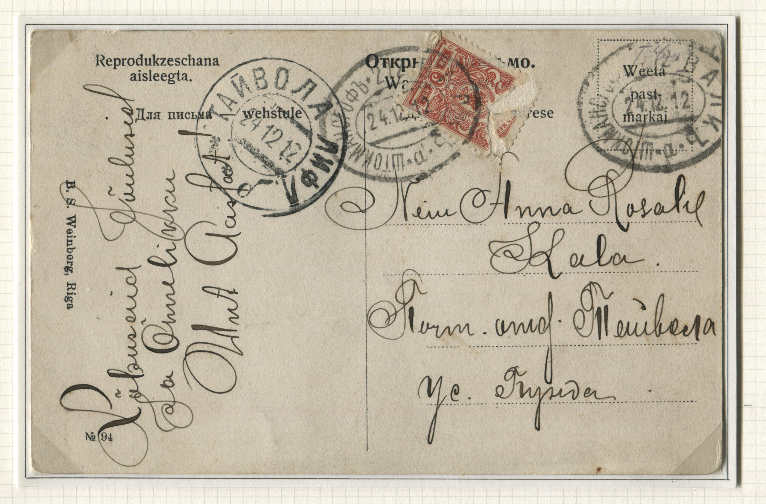 ERMi koguPostkaart saadetud Riiga 23.12.1912 Rongiliin Pärnu-126-Pihkva Tempel: Pärnu-126-Pihkva 23.12.1912
