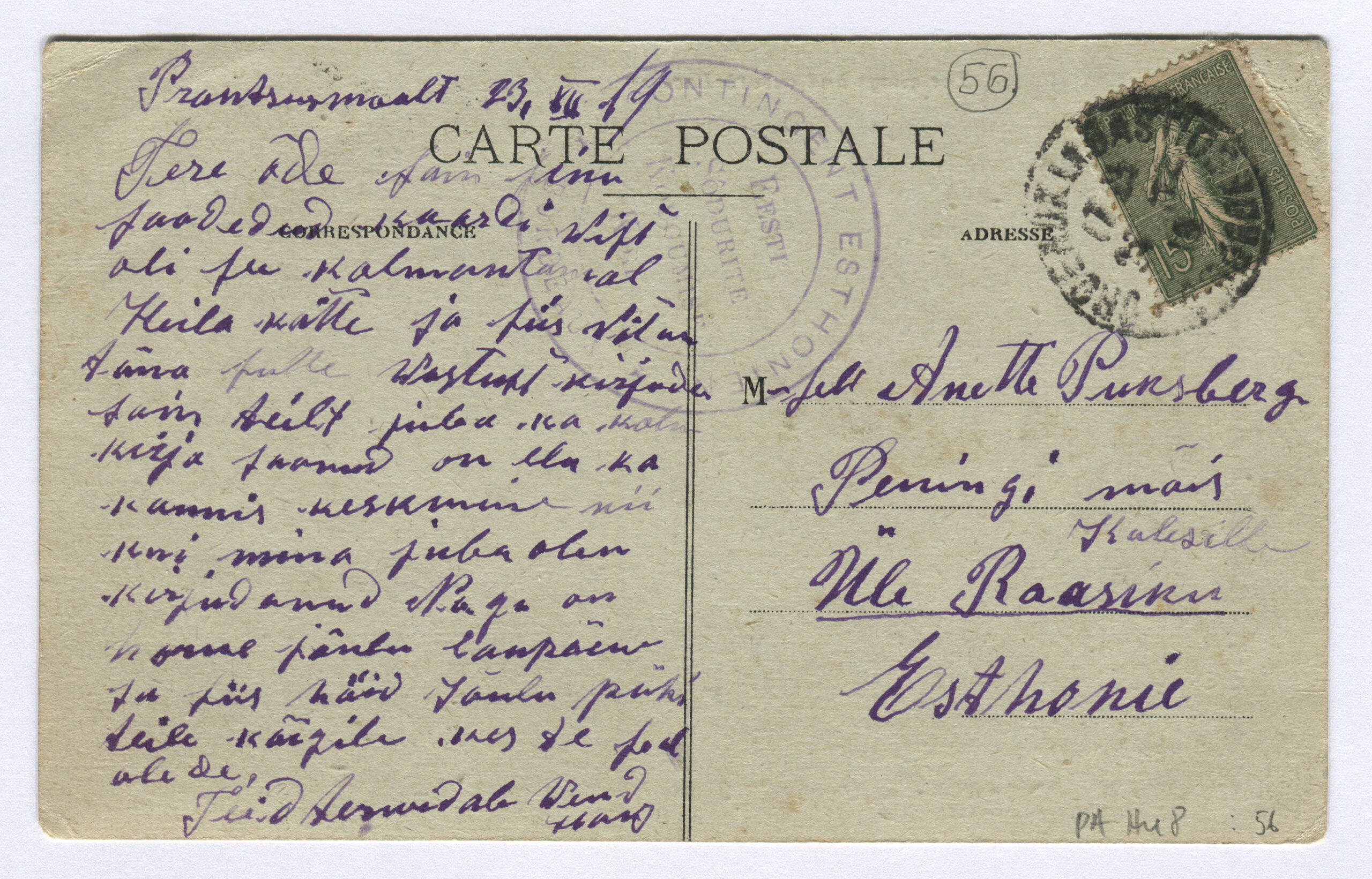 ERMi koguPostkaart saadetud Bordeaux`ist (Prantsusmaa), 23.12.1919 Raasiku kaudu Penningi mõisa Tempel: Eesti sõdurite kogunemiskoht“
