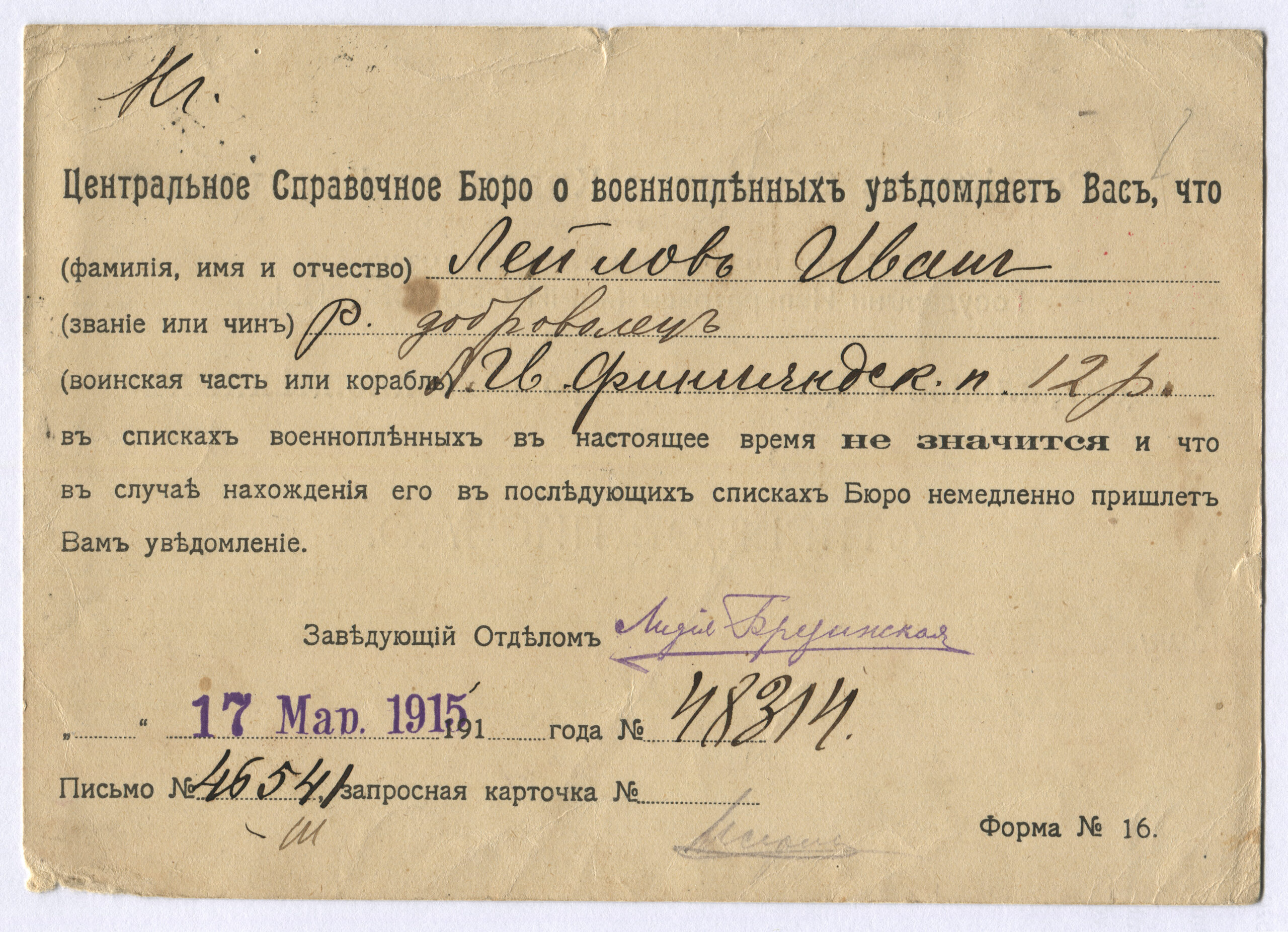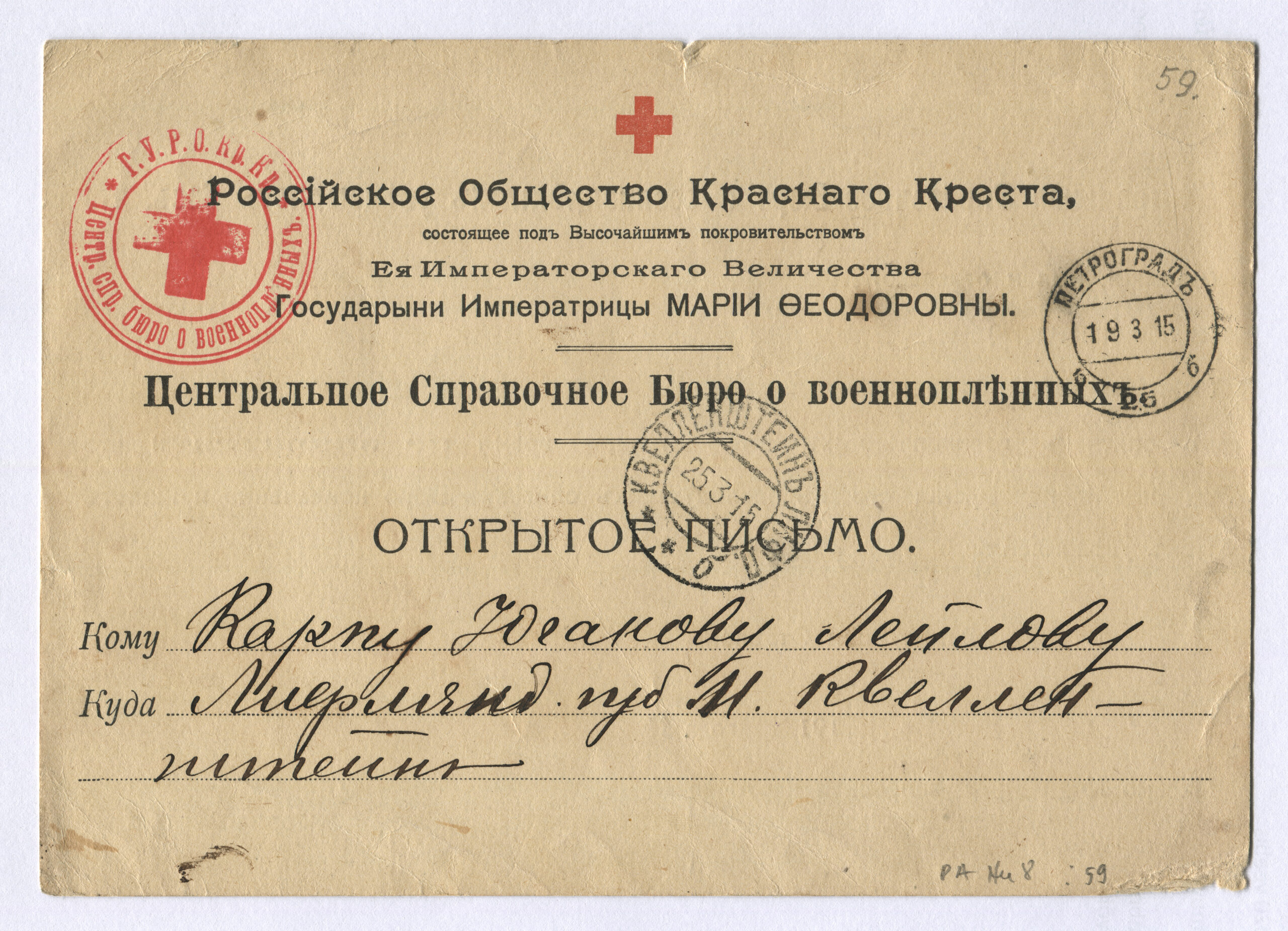 ERMi koguVenemaa Punase Risti lahtine kiri, järelpärimise kaart saadetud Petrogradist 19.03.1915 Kvellenšteini (Volvet) 25.03.1915
