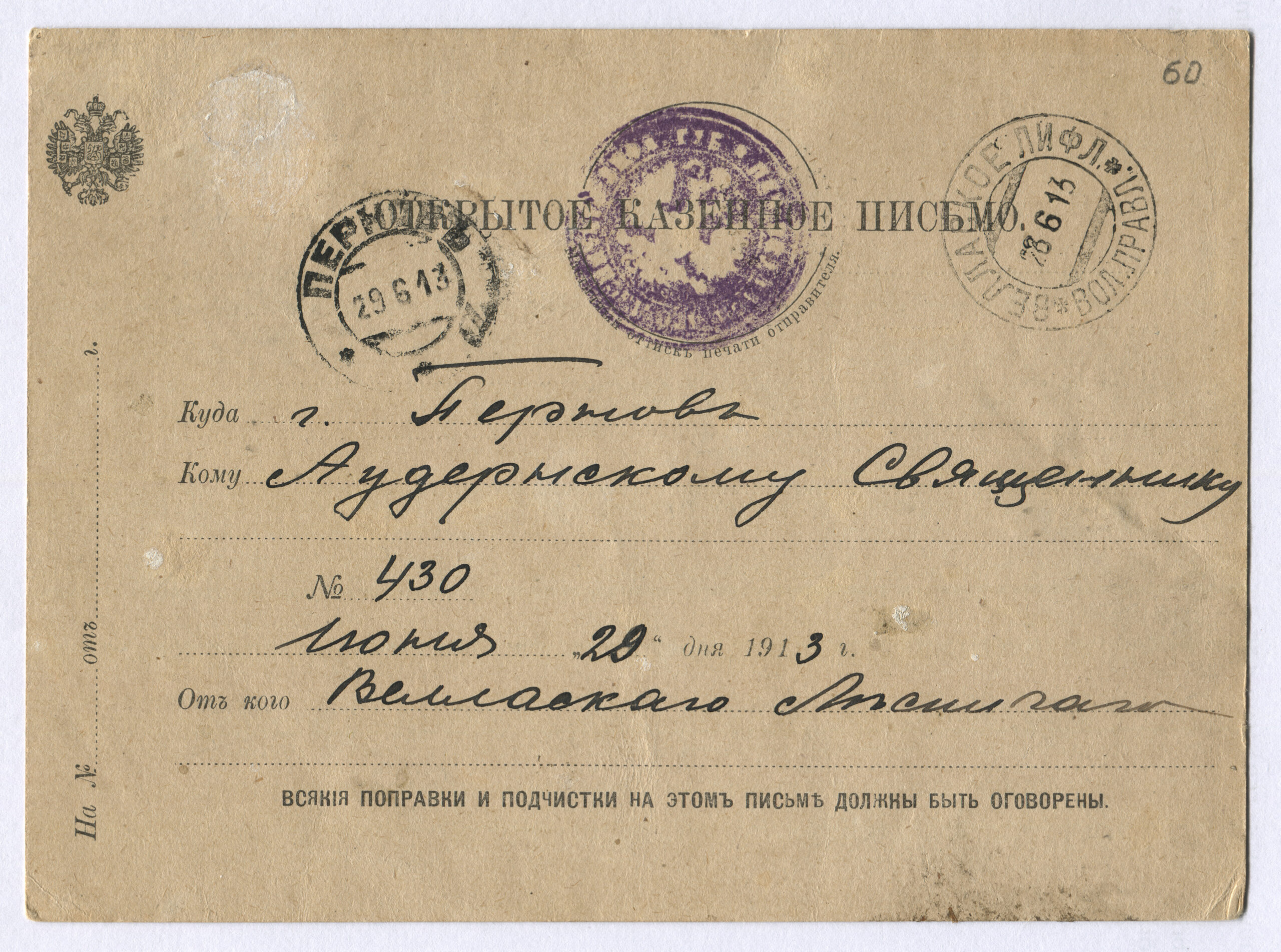 ERMi koguLahtine ametlik (kroonu) kiri saadetud Võllast (Vellast) 28.06.1913 üle Pärnu Audru 29.06.1913. Kutse oksjonile
