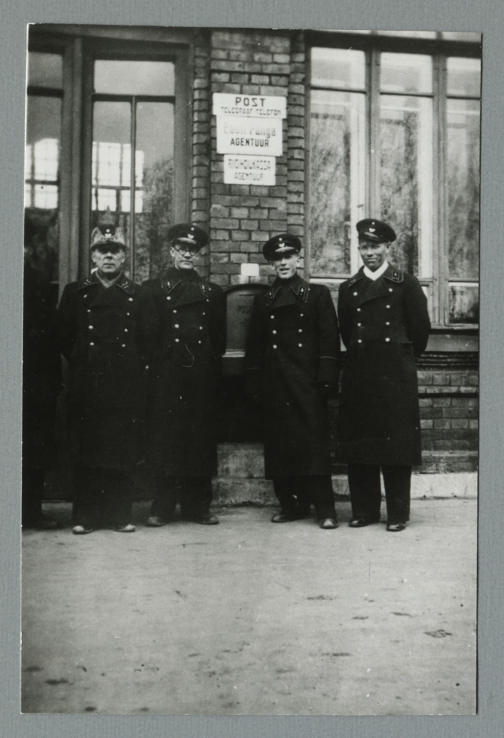ERMi kogu Tapa raudteejaama postkontori töötajad. Foto: J. Mägi, 1939 Vasakult: ülem Artur Uussaar, teadmata isik, Valter Allsaare, Elmar Aaren.