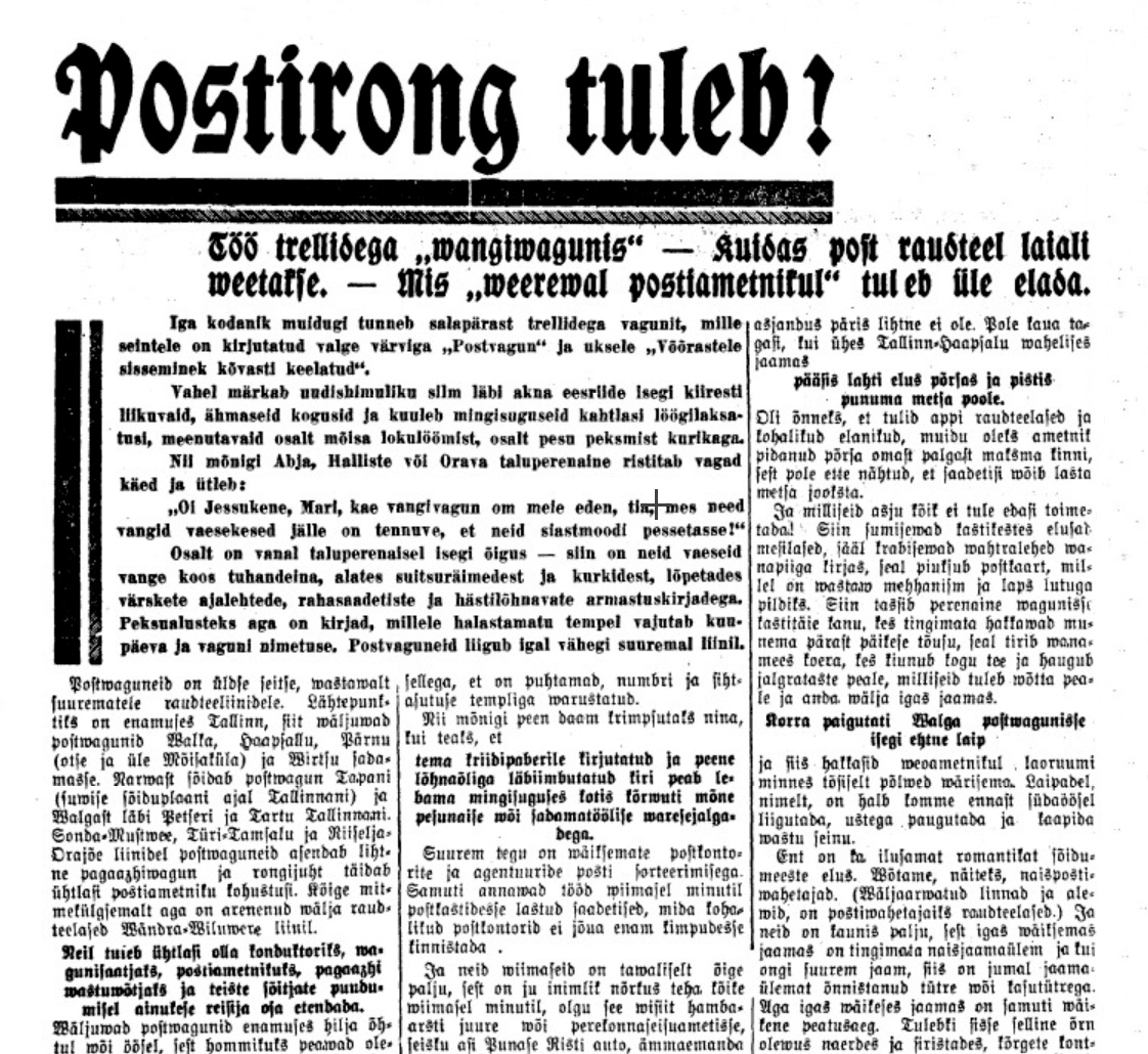 Erakogu (Jaan Moik)Väljavõte Maa Hääle nr 136 (18.11.1934) pikemast artiklist, kus kirjutatakse postivaguni tööst Sonda raudteejaam, samas asus postiagentuur. Foto: u 1934