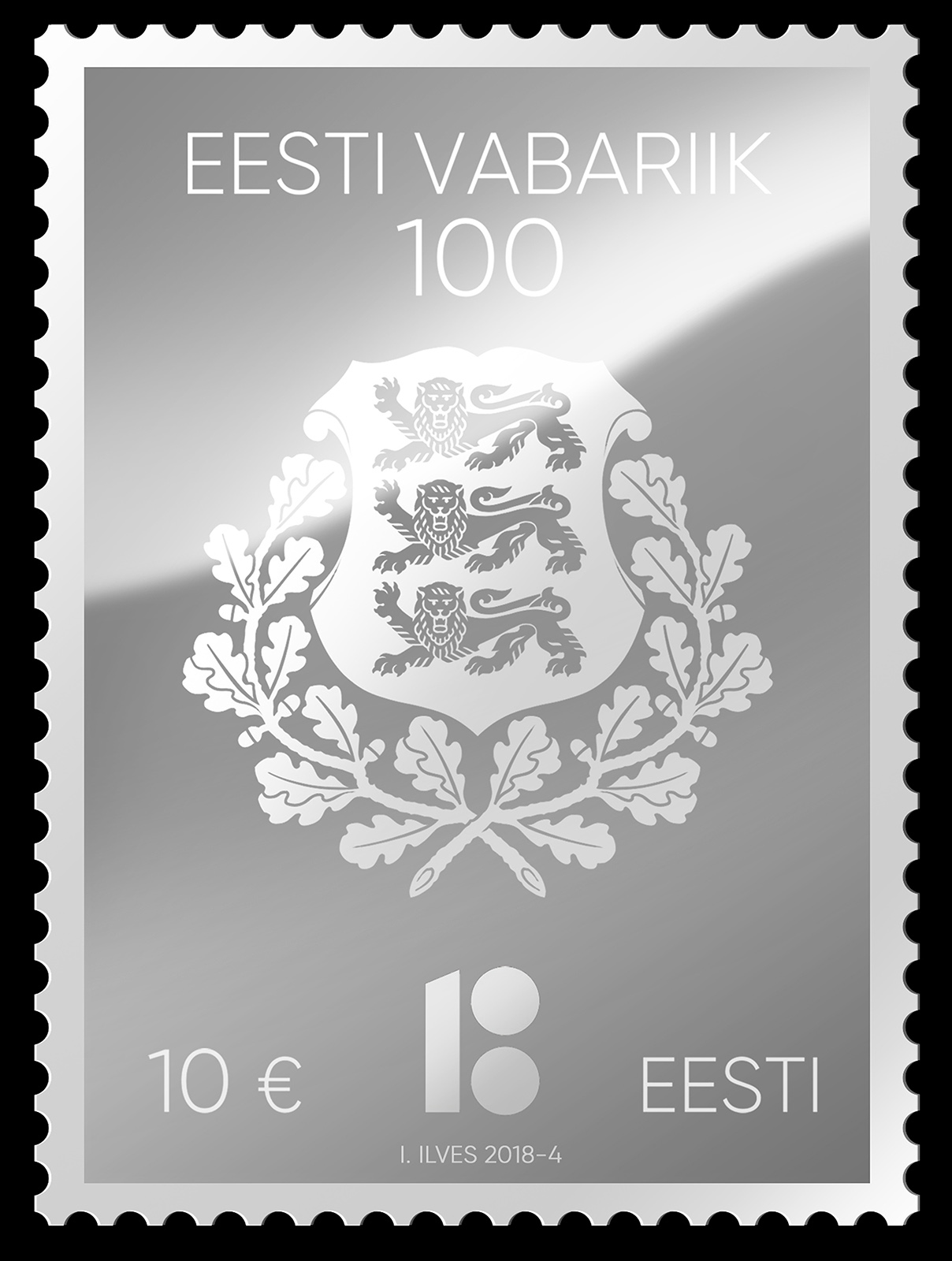 Margikomplekti trükiarv 350 000, iseliimuvad margid, trükikoda Cartor Security PrintingEesti Vabariik 100, hõbemark , 22.02.2018, kunstnik Indrek Ilves